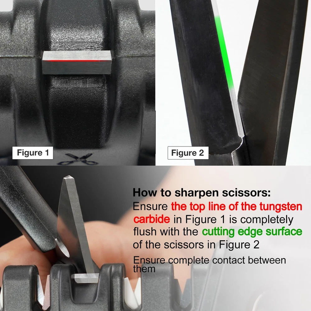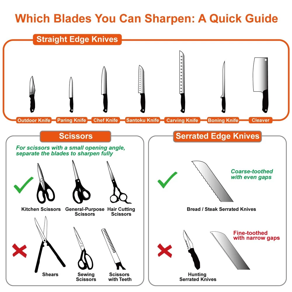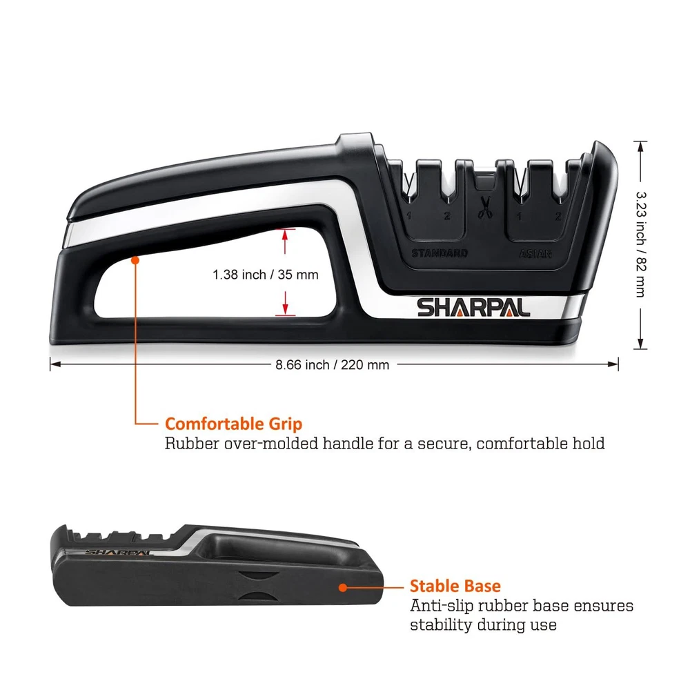 104N Professional Knife & Scissors Sharpener is a perfect sharpener for those who own both standard European/American style knives and Santoku & other Asian style knives of double beveled edge. Stage 1 uses preset crossed carbide blades to put a quick edge on knives. Stage 2 uses ceramic blades to hone the fine edge. This sharpener can also be used for serrated blades. Only use stage 2 for serrations. The special shaped tungsten carbide blade is designed for scissors sharpening. The heavy duty, ergonomic handle with the rubber over-molded grip provides a stable and comfortable platform for sharpening all your knives, scissors. Versatile & Professional – This 5-stage sharpener is the ultimate tool for sharpening both kitchen knives and scissors. It not only restores dull or damaged blades quickly but also hones them to a razor-sharp edge.