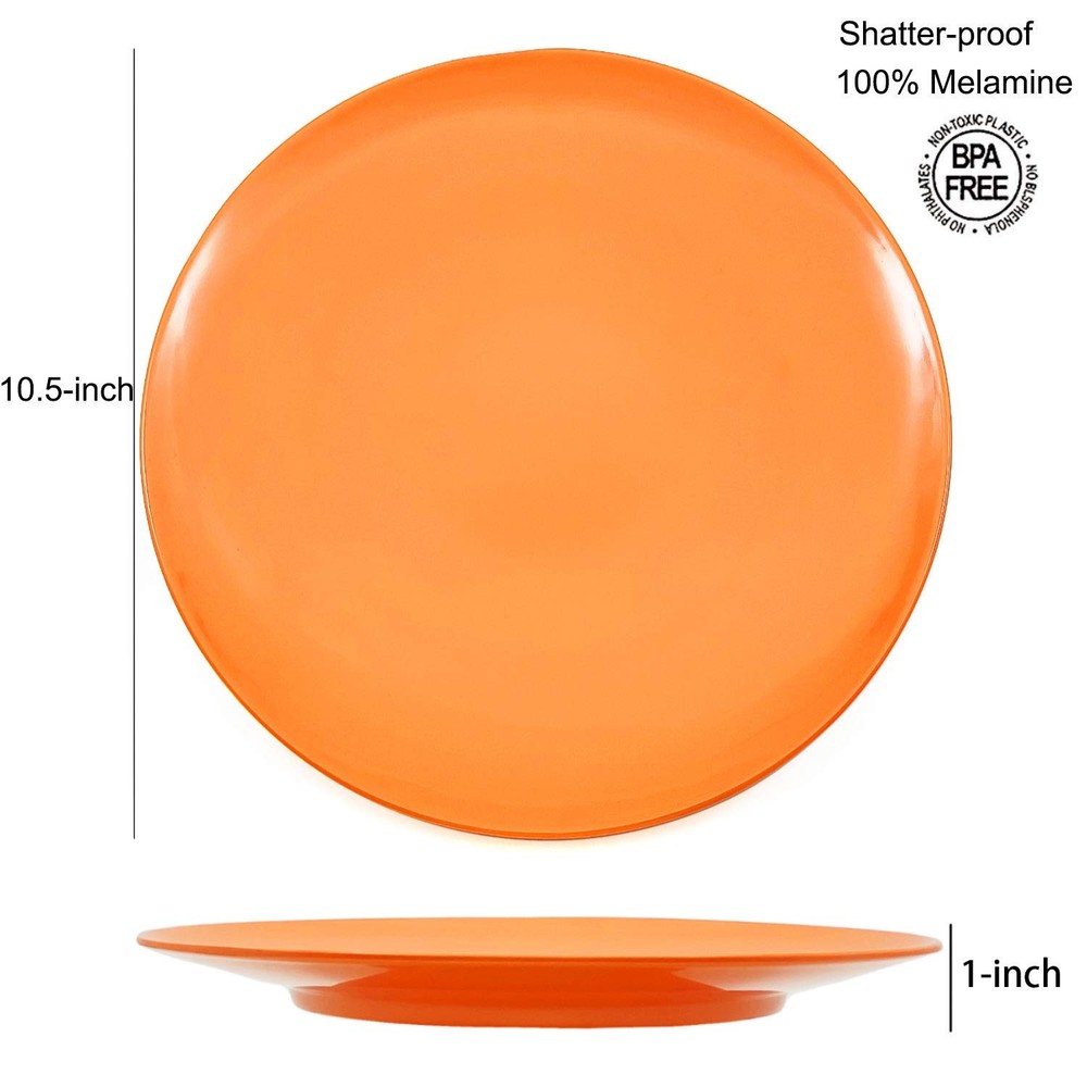 6-Piece 100% Melamine Dinner Plates Set Bring an elegant sense of contemporary style to the kitchen, dining room, or even the breakfast nook with this everyday melamine dinner plates set. A nice choice for family meals and casual gatherings, the plates set includes 6pcs 10.5 x 1-inches dinner plates. To save on space, the round-shaped dinnerware set offers a conveniently stackable design. High-Quality 100% Melamine for Everyday Use Made of 100% melamine, the high-quality plates set offers reliable strength and durability, as well as a lightweight design for easy handling. The melamine plates set is also BPA-free, so there's no need to worry about BPA seeping into food or beverages like with some plastic dishes and containers. Colorful Classic Design The sleek modern design tastefully layers together and makes a nice addition to existing dinnerware pieces, table linen, and surrounding decor. Excellent after-sales service This bowl set is packed well. It will safe during the shipping way. If you have any problem of our plates set, feel free to contact us anytime for a refund or a replacement.Any question about our cereal bowls just contact us, we will response you within 24 hours. Colorful set includes 6pcs-11inch dinner plates set for your everyday use,meet your need for any food. Perfect for any type of snack, food or meal- lunch or dinner- indoor or outdoor- at home, in the park, camping, at school and even field trips Perfect for any type of snack, food or meal- lunch or dinner- indoor or outdoor- at home, in the park, camping, at school and even field trips Extremely safe for Kids, Adults and Seniors because all all our products are Non-Toxic and 100% BPA Free. And they are easy to use, clean and store: Dishwasher friendly and fully stackable! BREAK-RESISTANT: Made of 100%melamine, you don't worry it will broken when drop on the floor, lightweight. SAFE AND STURDY! This durable material is a safer and better alternative to glass! Made of restaurant quality BPA-free material. Top rack dishwasher safe.Not for use in microwave oven.
