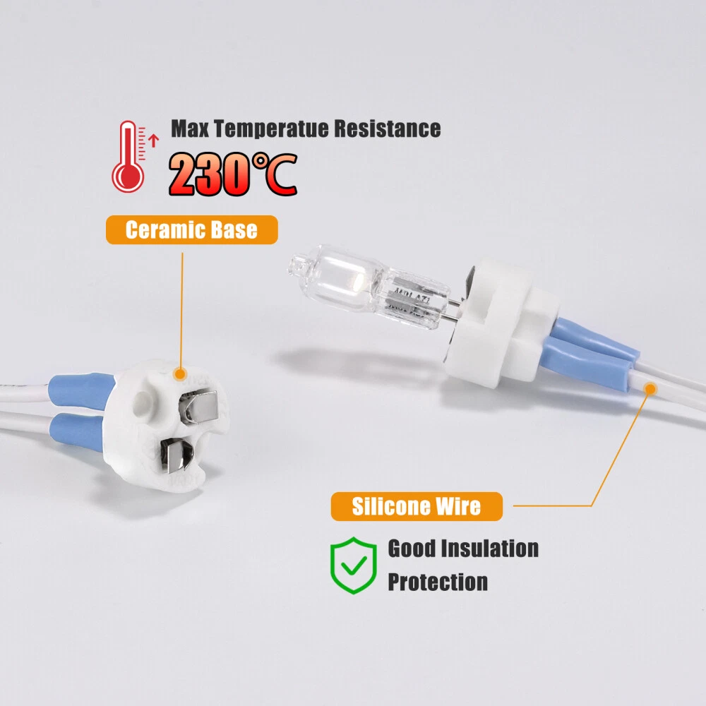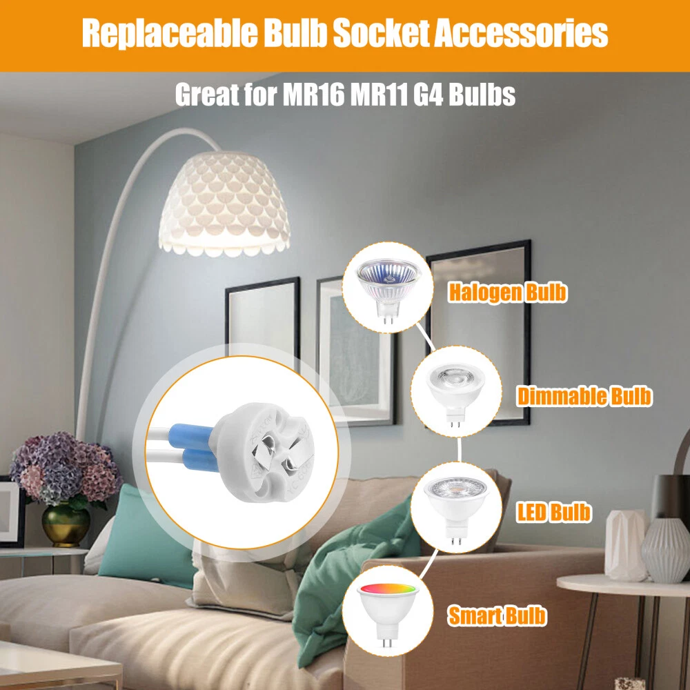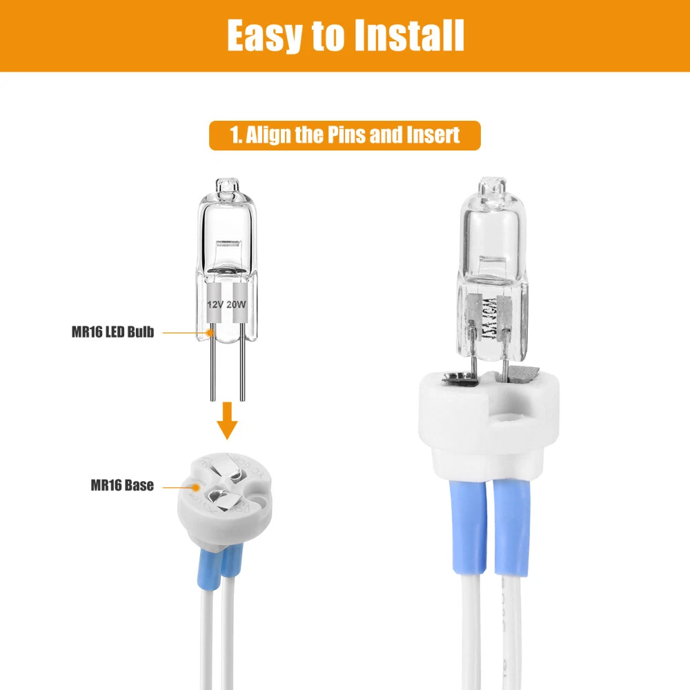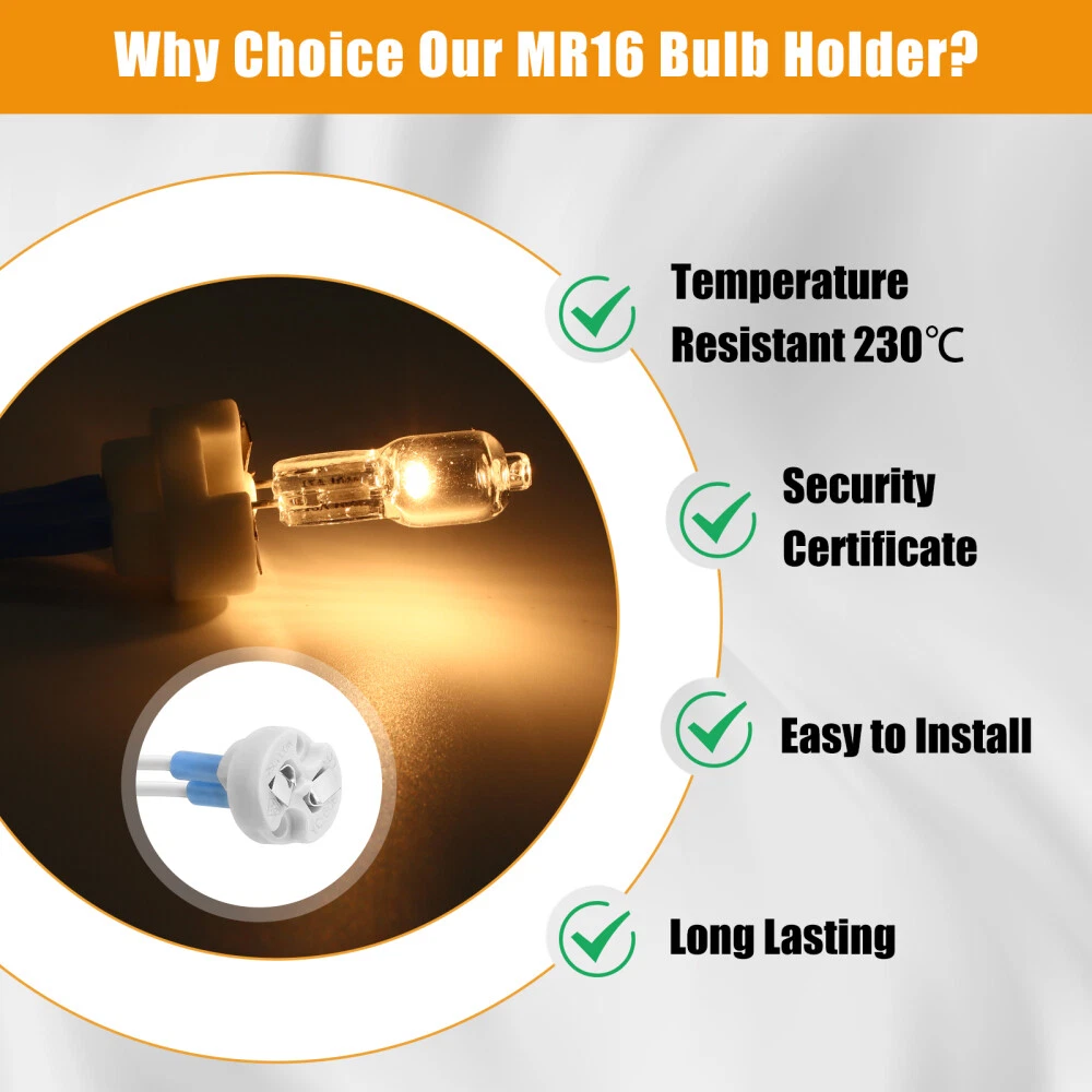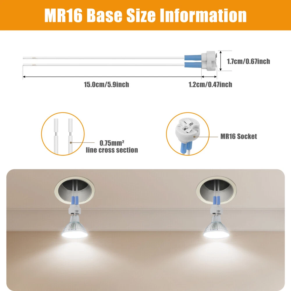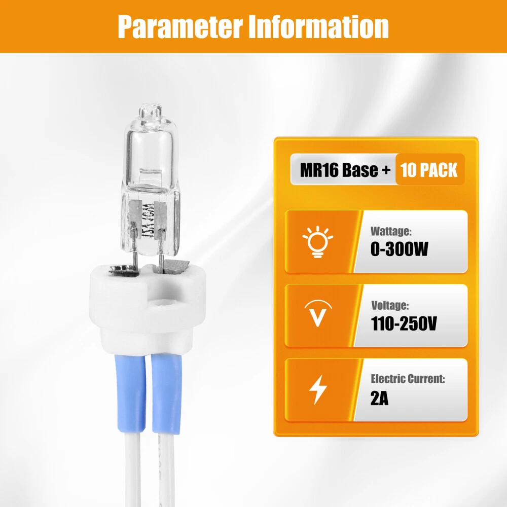 About this item: ✔ ADAPTER: MR16 lamp base. ✔ MATERIAL: Ceramic base, mounting holes, thick and durable silicone copper wires. ✔ SAFETY: Mini spring mechanism holds bulbs firmly and solidly. It has great heat resistance, up to 230℃. ✔ CURRENT: 0-2A. Voltage: 110-250V. Wattage: 0-300W. Cable length: 5.9 inches/15cm. Diameter of the cable: 0.75mm. ✔ INSTALLATION: Easy to install. One-step installation. Insert the bulb pins into the sockets without using other tools. Specifications : Cable length: 15cm/5.9 inches Wire diameter: 0.75mm. Max voltage:AC 110-250V Current strength: 0-2A Wattage: 0-300W Material (base): ceramic Material (wire): copper Material (wire insulation jacket): silicone Packing list: 10/20/50x MR16 lamp holders