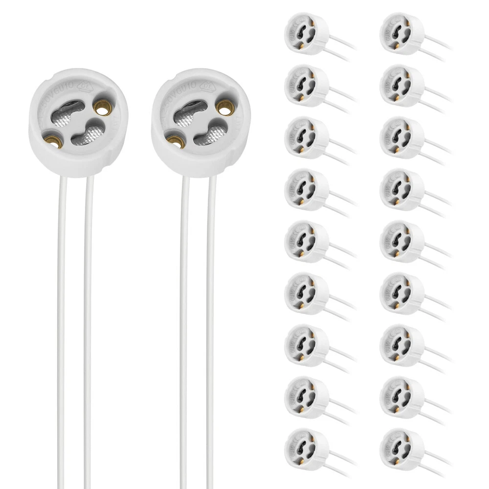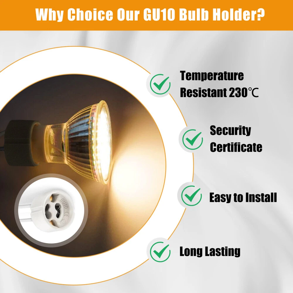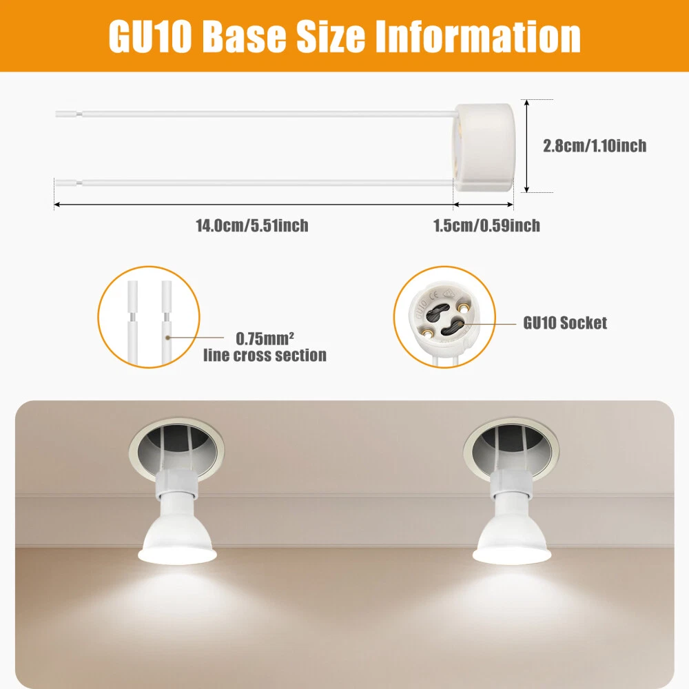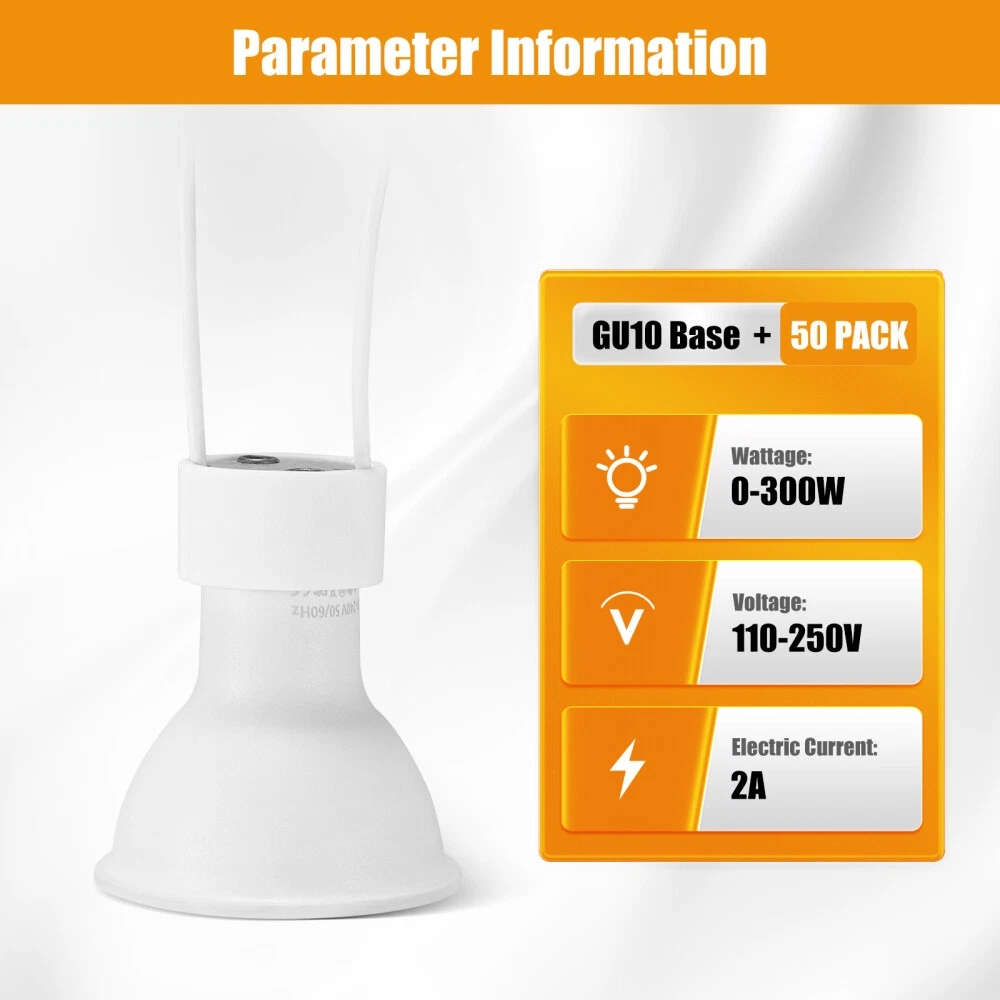About this item : FOR ALL GU10 BASE BULBS: GU10 base socket is compatible with all types of bulbs as long as it is GU10 base. Parameters: Max wattage 300W, voltage range 110~250V, up to 230℃ heat resistance. Material: Ceramic base and silicone wire (CSA 0.75mm², length 5.9inch/150mm.) Easy to install: One-step installation. Insert the light bulbs into the holes in the center of the sockets, then turn and lock. The light bulbs are held firmly. Product parameters: Material: Ceramic + Silicone Wire Wiring length: 15cm Color: white Maximum wattage:0-300W Voltage range: 110~250V Socket Type: Pen Type Mounting Type: Wall Mount Package included: 10/20/50x GU10 lamp holders