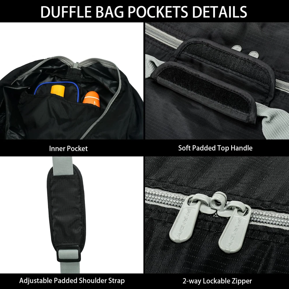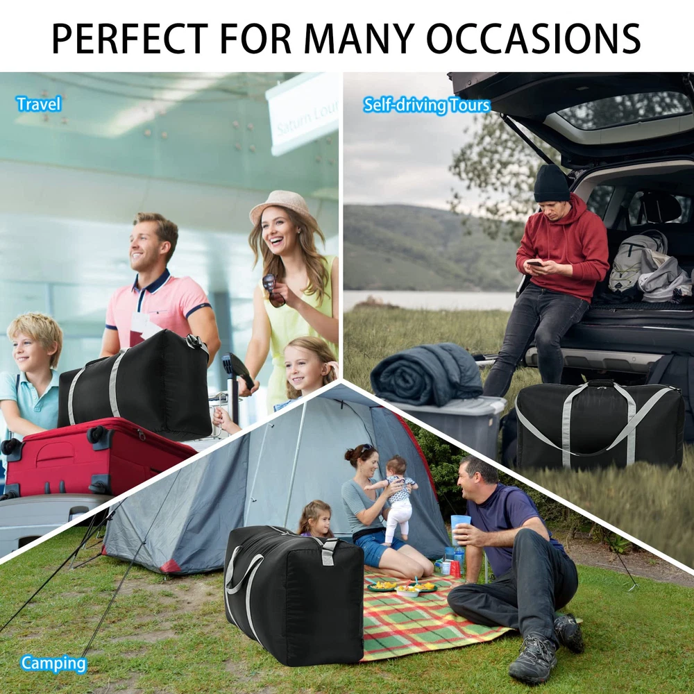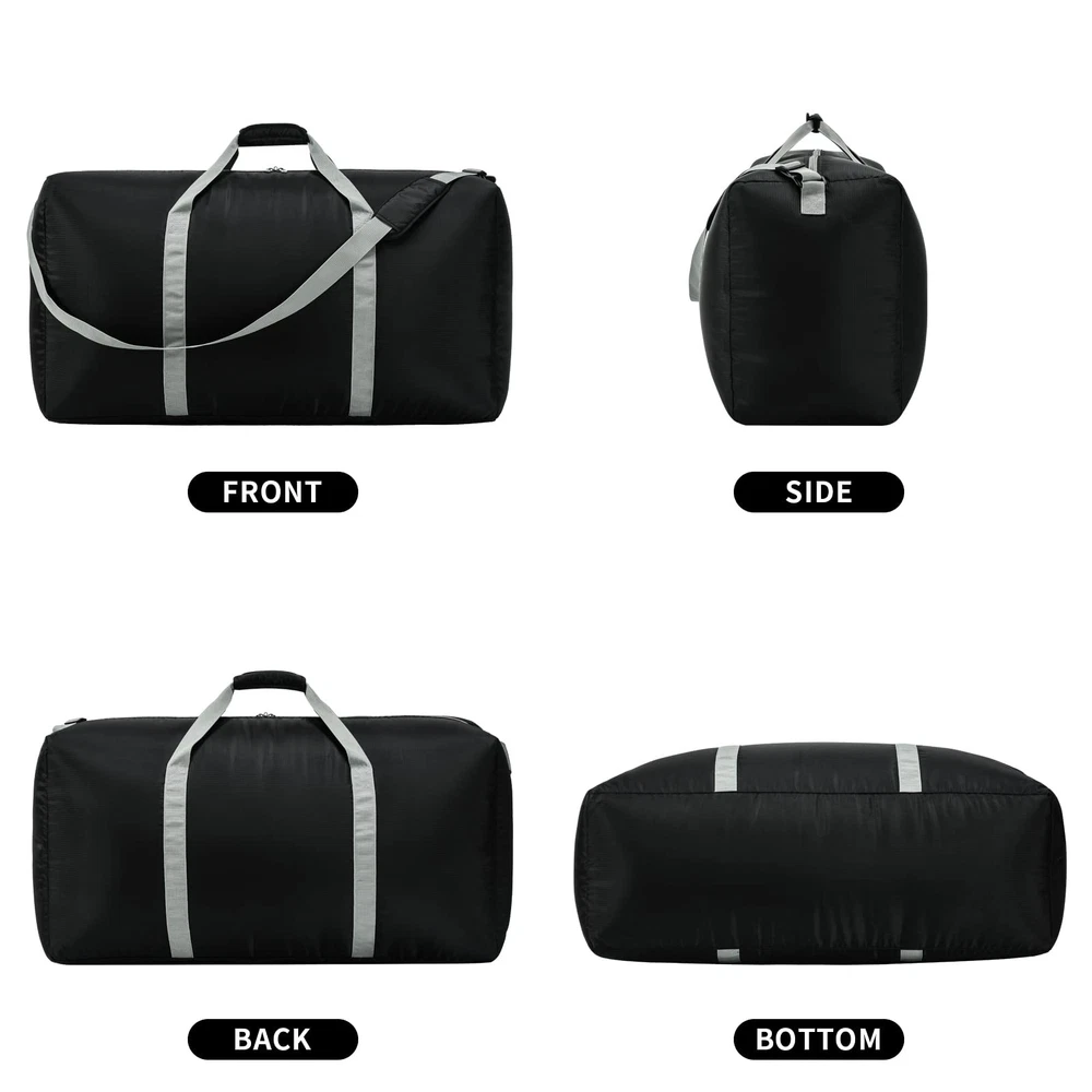 LARGE CAPACITY FOLDABLE DUFFLE BAG FOR TRAVEL:Up to 105L capacity, dimension of this storage bag is 32.5"x 11.5" x 17", total weight is only 1.1lbs. It has 1 zippered main compartment with 1 inside pouch. DURABLE QUALITY LARGE DUFFLE BAG:This extra large duffel bag made from 420D Water & Tear resistant polyester with solid stiching, quality hardware, smooth metal zippers,no sticking at all. The main zipper also has the eyelets to add a small lock. EASY TO CARRY LIGHTWEIGHT EXTRA LARGE DUFFEL BAG:The duffle bag has a long and comfortable padded carrying strap and handles for different options to carry. Can be folded to small size, easy to carry as a "JUST IN CASE" bag for your trip. FUNCTIONAL PACK PLAY BAG:This travel duffle bag is ideal for traveling, but it can also be used to organize clothes and shoes around the house, for storing bulky items or carrying large bags of outdoor sports gear equipment. GUARANTEED:Try this DUFFLE BAG bag with NO WORRY, we offer 1 year limited manufacture warranty.