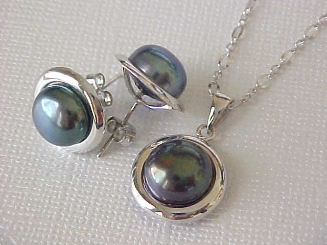 You are bidding on a beautiful set of black pearl pendant and stud earrings and 16" sterling silver the chain. The pearls are 10mm - 10.5mm genuine freshwater pearls, natural black in color with greenish/bluish overtone, button shape, smooth surface, and very luster AAA. They are set on sterling silver, stamped 925. The pendant and earrings measure 14.5mm - 15mm across. This set will come in nice box. We accept Paypal. Payment should be made within 7 days after auction ending. S&H: $6.90 in USA via USPS. Please also to view our store for may beautiful items.