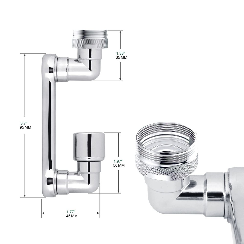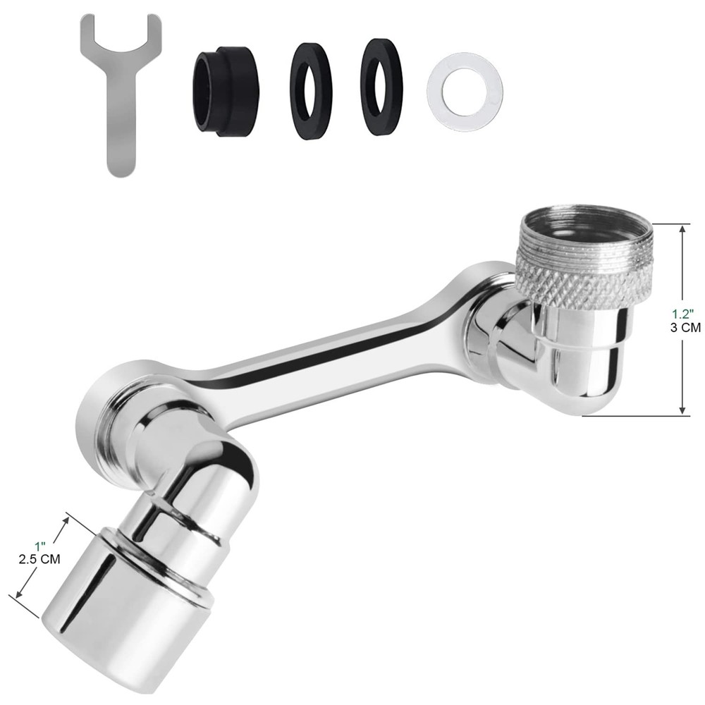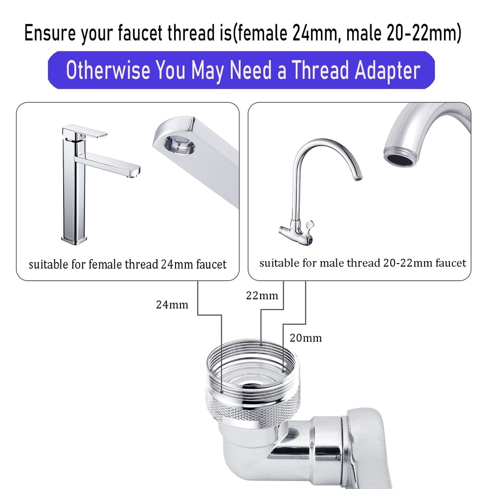 Features: Main features: Universal adaptable to various faucets, 1080-degree rotation, four-mesh filtration, sealed and watertight 1.360 degree large angle rotation. 2.2 Water flow design, soft bubble flow and strong spray. 3.Rotate large angle rotation (1080 degrees). 4. Easily switch the bubble flow to a powerful spray with one hand. 5. Fit Both Male and Female threaded faucet. Specification: Material: solid brass + ABS Finish: Chrome Thread: Inter thread + outer thread Size: 15/16 inches - 27UNS how to install: 1. Turn off the old faucet aerator 2. Turn on the aerator clockwise 3. If your faucet has internal threads, please use the adapter (included) to connect when you use Buy a women's aerator. You need to use a screwdriver, scissors or You can use other tools to tighten the adapter. 1080 degree BIG ANGLE Rotate:This new robotic arm swivel sink faucet aerator extension can be rotated 1080 degrees, and can be easily bent or folded at will so that the water flow can reach every corner of the sink,which makes it convenient to wash the sink. Single Water Output Mode:Soft Bubble Stream. the water pressure is comfortable and prevents water splashing, which is suitable for hand washing, mouth rinsing or face washing. Simple Installation & Fits 99% Faucets:Easily replace the aerator with the tools in the package, done in seconds. Only Compatible with thread Female 24mm and Male 20-22mm faucet. Check your faucet thread again to make sure if you need a thread adapter. New upgraded robotic arm 1080 degree rotating faucet aerator. It can be folded and stored.You can easily rotate the tap to the direction you want, making it more convenient to wash your face and gargle. High-Quality Materials: The faucet aerator is made of sturdy copper, Metal Brass body and multi-layer plating to improve durability and service life. Anti-corrosion and anti-rust. Three-layer filtration.Great Replacement for normal aerator.