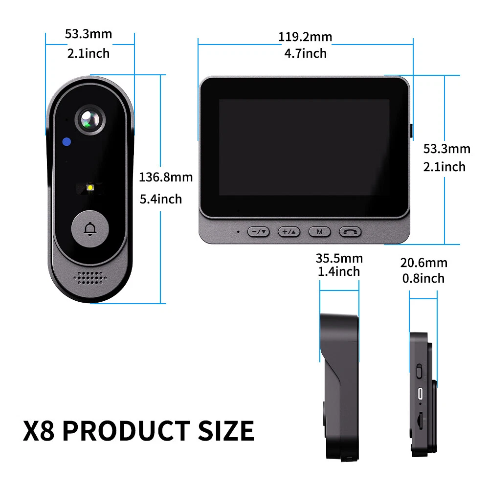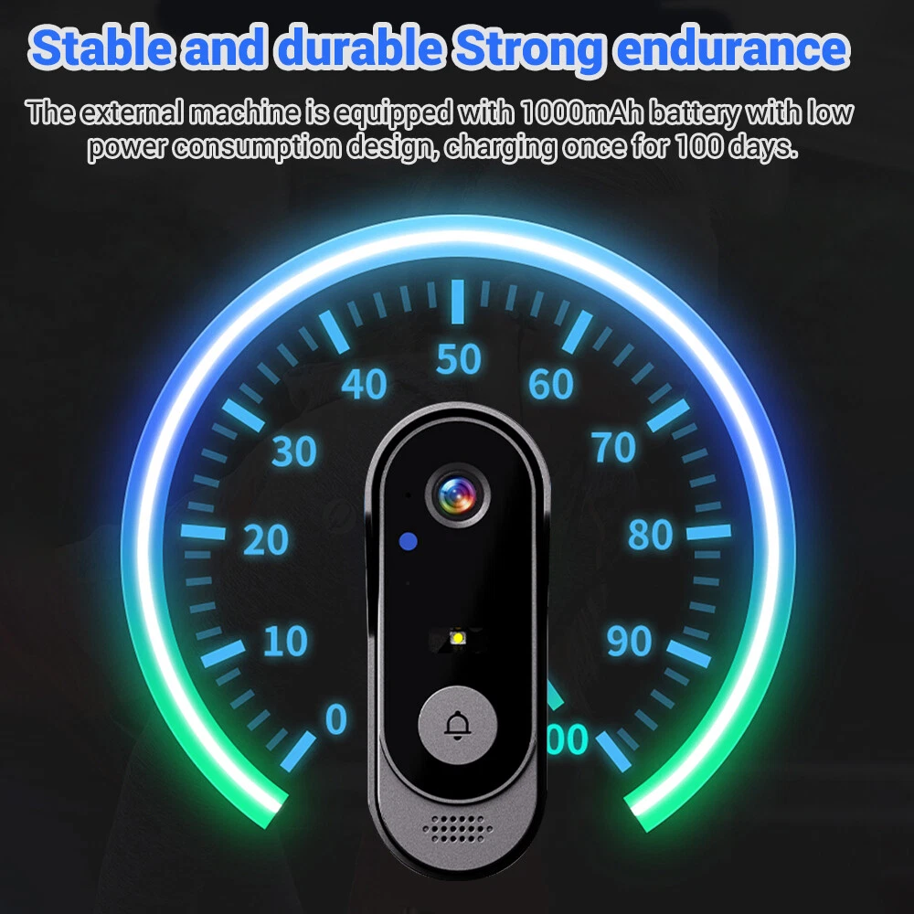 Note : The doorbell can be wirelessly connected and used for 1-3 months after charging, but the indoor unit screen needs to be plugged in for use. Features: *Visual intercom, two-way voice intercom: This waterproof visual doorbell allows for real-time video and audio communication, making it convenient for indoor monitoring and communication with visitors. *Outdoor waterproof: With its waterproof design, this doorbell is suitable for outdoor use, providing reliable performance even in rain or other harsh weather conditions. *Ultra-long battery life: The external unit is equipped with a 1000mAh battery, ensuring low power consumption and allowing for up to 100 days of battery life on a single charge. *4.3 inch clear screen: The doorbell features a 4.3 inch clear screen, providing a high-definition display for clear and detailed visuals. *2.4G connection, no need for network: This doorbell utilizes a 2.4G connection, eliminating the need for complicated network setup. It is easy to use, stable, and reliable. *Night visibility: Equipped with a 120° fisheye wide-angle lens, this doorbell ensures a wide field of view for clear visibility even in low-light conditions. It automatically switches between day and night mode. Specifications: *Product Name: Visualized Smart Doorbell *Material: ABS raw materials, PCBA, polymer batteries, speakers, cameras, hardware *Size: Doorbell unit size: 135x53.3x34 mm (including plastic base), Screen size: 120x95x17 mm *Color: Black *Battery Capacity: Doorbell 1000 mAh/Display 400 mAh *Power Input: 5V=1A *Charging Time: 1.5 hours *Use Time: More than 3 months of normal use *Standby Time: more than 1 year *Waterproof Rating: IP66 *Camera Resolution: 640x480 *Weight: Doorphone net weight: 91g, Display net weight: 134g Package Content: 1 * Doorbell machine 1 * Indoor display 1 * Charging cable 1 * Auxiliary mounting sticker 1 * Small screws 1 * Instruction manual