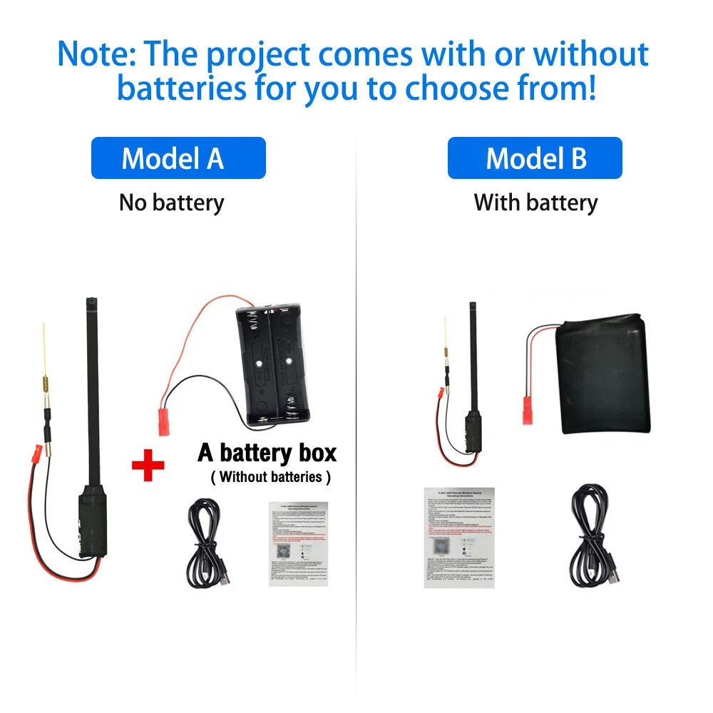 It is not allowed to use surveillance cameras to monitor and record others' privacy without their knowledge. Features: 【Small Camera】 This camera module is equipped with HD mini lens, fully meet DIY needs. This wireless camera can be used as a security camera to monitor your home or office. 【Micro SD Card Recording and Storage】 With this application, you can view videos directly and download them to your cell phone. You can also insert a micro SD card for loop recording or timing ( up to 128GB, not included ) . 【Motion Detection】 Features motion detection and smart alerts. When an object or person moves within the field of view, you will immediately receive a notification on your phone. It allows you to view events without delay and not miss any important moments. 【HD 1080P】 This WiFi camera is very easy to use for anyone. It has also been fully updated in terms of performance 4 megapixels, 1080P resolution, can be viewed remotely via wifi, more exciting for you to discover. 【Remote View】 Connect the mini camera to your router's WIFI and then you can access your camera unit remotely. By using the free camera app, you can view your house/kids/pets/babysitters from your cell phone anytime, anywhere. It allows you to live stream from anywhere to capture 1080P/30fps super clear pictures/videos of your home/office/store or anything you want to care about. Specification: *Product Name: WiFi Camera *Product Color: Black *Resolution: 1080P *Video format: AVI *Recording frame rate: 30fps *Lens Viewing Angle: 120° *Photo function: Support *Motion Detection: Support *Microphone: Built-in *Battery Life: Approx. 8 hours *Battery Capacity: 3000mAh *Charging port: micro USB *Support Network: 2.4Ghz Wi-Fi and Peer-to-Peer P2P ( 5G not supported ) *Maximum support: 128GB Micro SD card ( micro SD card not included ) *WiFi function: Yes, remote viewing via smartphone anytime, anywhere. *Supports simultaneous recording and loading. *Application: V380pro *Operating system: iphone or android phone Model A Packing list: 1*DIY camera 1*User manual 1*battery box 1*micro USB cable Model B Packing list: 1*DIY camera 1*User Manual 1*Polymer Battery 1*micro USB cable Attention: 1. Item has with battery and without battery for your choice! 2. item does not include micro SD card, need to buy extra! 3. Please allow 1-2cm error due to manual measurement, make sure you don't mind before ordering! On Dec 18, 2024 at 17:52:35 PST, seller added the following information: