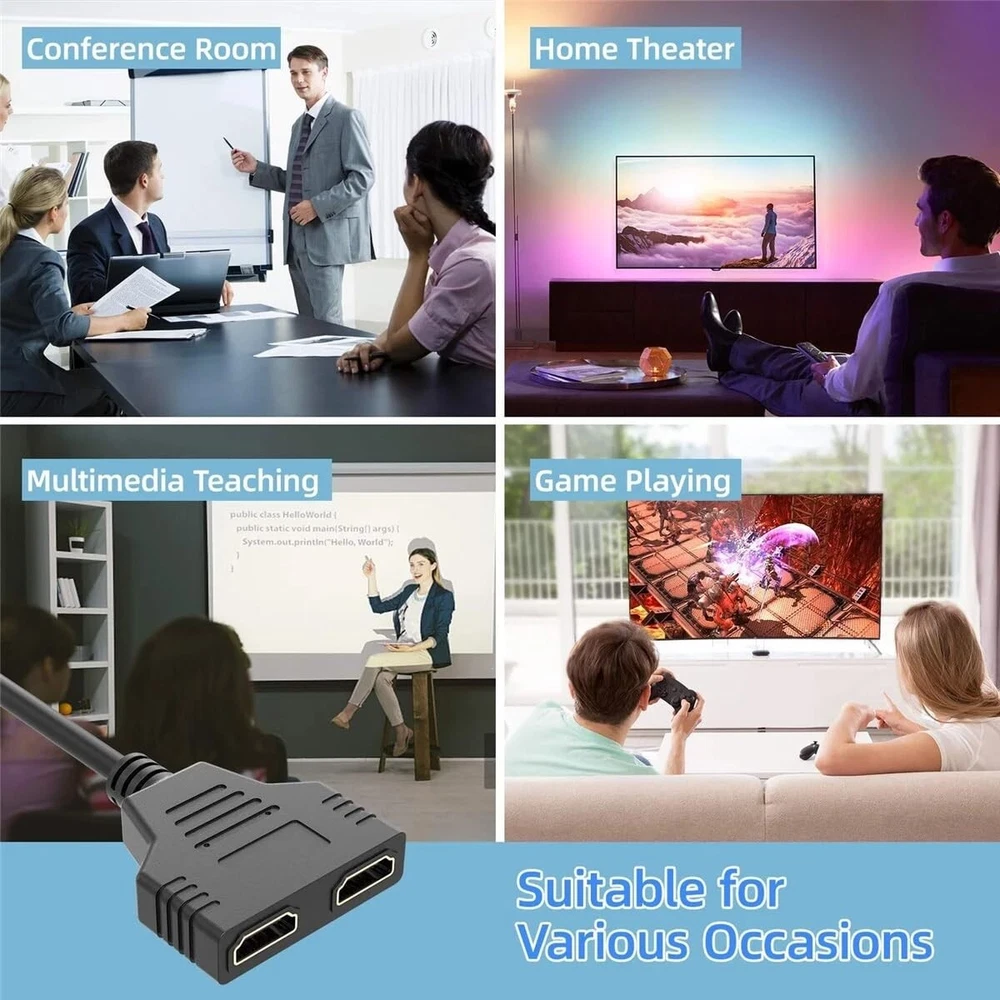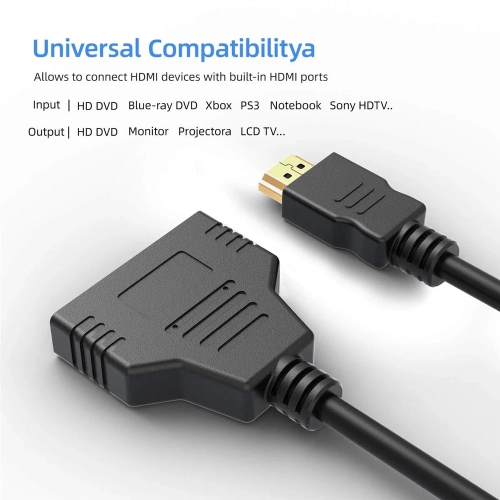 HDMI Splitter Adapter Cable, 1080P HDMI Splitter 1 in 2 Out, HDMI Male to 2 HDMI Female 1 to 2 Way Splitter Cable for HDTV, LCD Monitor and Projectors Compatible Devices Laptop Specific Uses For Product TV, Xbox, Projector Connector Type HDMI Color Black Brand Hididi About this item Function: This HDMI Splitter Adapter operate as a signal router, can distribute 1 HDMI input signal (Such as: HD - DVD, Bule - ray DVD, Xbox, Xbox360, PS3, STB, Notebook, So-ny HDTV ) to two Visual HDMI Output Devises (such as, HDTV, Monitor, etc.). Advantage: Gold_plated Connectors for better signal transfer.Allow to connect HDMI devices that have Build-in HDMI ports, like HDTV, PlayStation 3, Upconvertor DVD Player, LCD Monitor and projectors. 1080P Resolution: This HDMI Splitter supports HD resolution, including 480i, 480p, 720p, 1080i, 1080p. Easy to use: HDMI Splitter 1 in 2 out Just plug in and it plays, please connect it to the corresponding connector. (Package include: 1 Piece HDMI Male to 2 HDMI Female Splitter.) Length: 12.2 inch Please Note: Only 1 output device should be active at any time. It cannot support 2 displays being active at the same time, please close one display when you want to use another. Does not support any Laptop or Computer. And not Support HDCP. It does not work on TV boxes/cable boxes like Ro-ku.