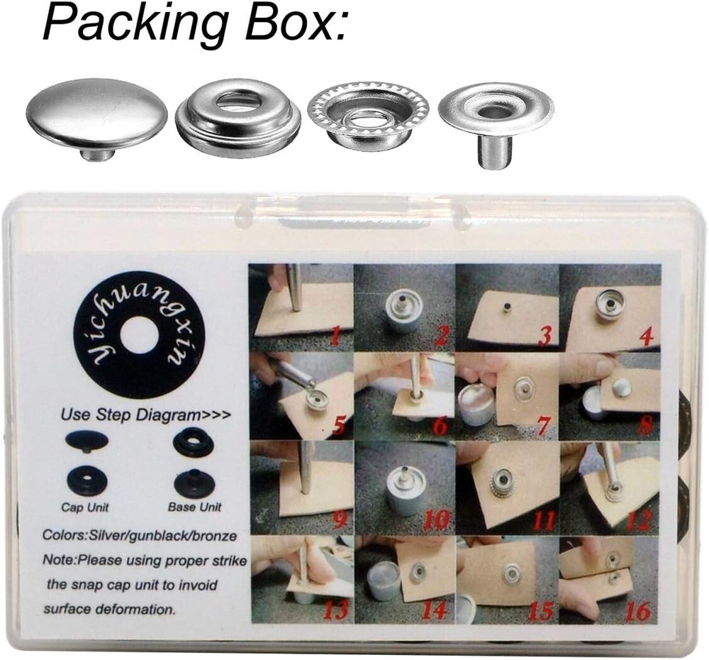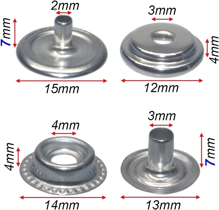 108PCS 15mm Stainless Steel Snap Fasteners for Marine Boat Canvas, Line 24 (4 Components) GENUINE STAINLESS STEEL CAP, SOCKET, STUD & POST - Will Not Rust or Corrode Even in Salt Water Environments FASNAP BRAND QUALITY - The snap buttons which is made of Marine Grade Stainless Steel. ALWAYS CHECK THE PACKING BOX - This Will Help Ensure You Are Buying a Quality Product APPLICATIONS - both sides of rivets have a cap that make it looks good; These leather rivets can be applied for DIY crafts or clothing such as shoes, hats, jeans, windbreaker, down jacket, jackets and so on PACKING INCLUDED - 27Sets x Snap Buttons(108 Pieces)