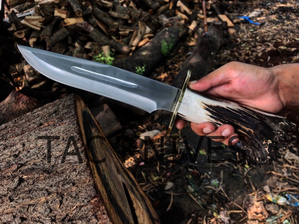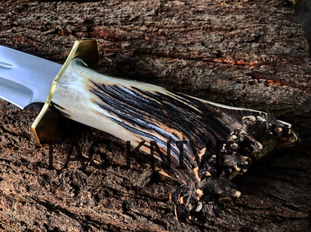Product Details Overall Length:13" Handle Length: 5" Blade Length: 8" Blade Material: 1095 Steel Handle Material: Brass Guard And Elk Handle Includes a hand stitched custom full-grain leather sheath