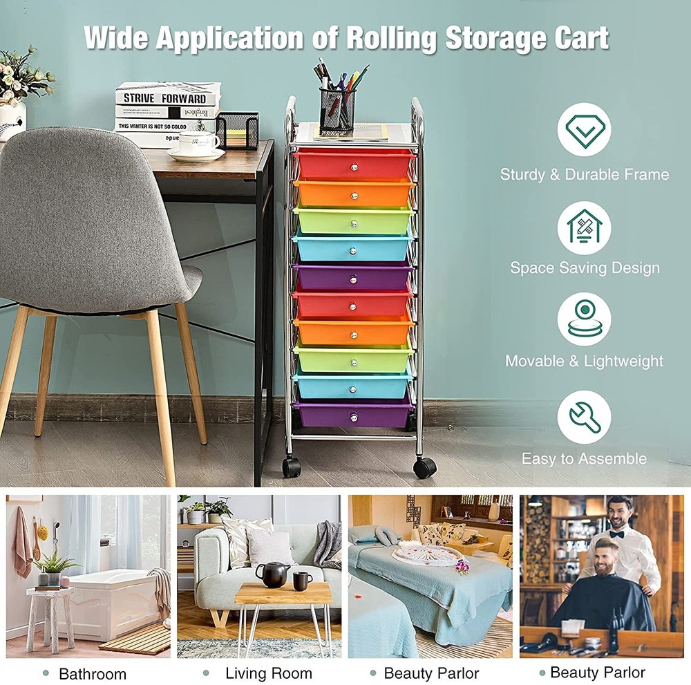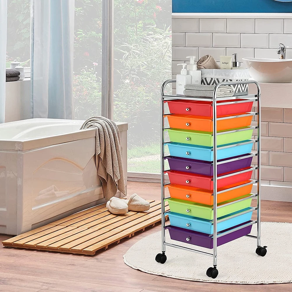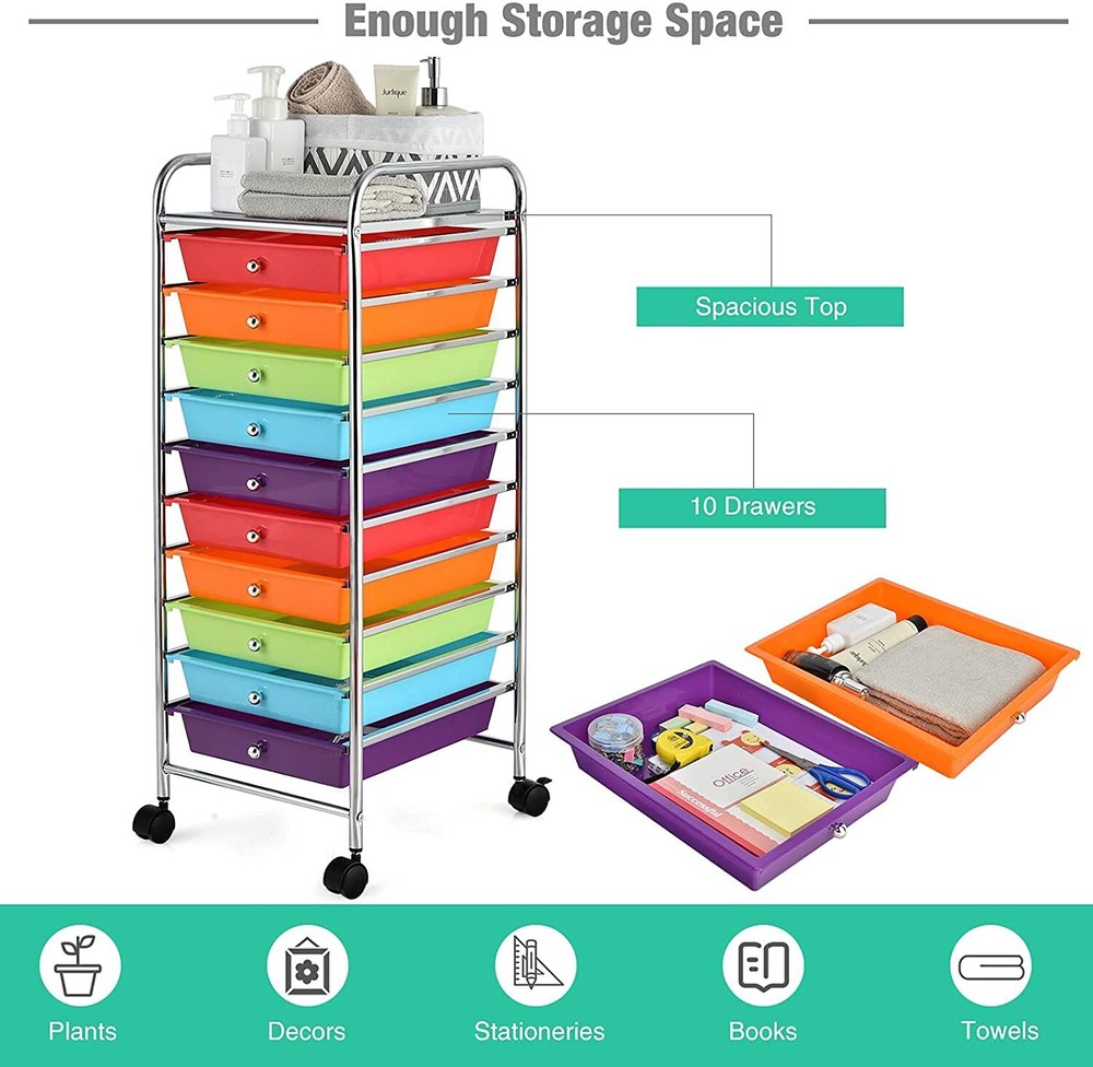 Our rolling storage cart includes 10 drawers, which provide enough storage space. It is Ideal to arrange your different stuff at Office, Home, School and Garage Or Just About Anywhere Organization Is Needed. Made of Chrome Steel Framed and plastic Drawer Organizer, this 10-drawer rolling cart is durable enough to serve you for a long time. Four universal wheels will help you move it easily. Do not hesitate, to buy ! High quality and brand new. 10 moveable drawers for storage. Steel frame and plastic drawers, durable and can serve your for long time. 4 universal wheels(2 with locks) for easy movement and fixation. Drawers slide through metal channels with no resistance. Private, polypropylene drawers protect drawer contents from peeping eyes.