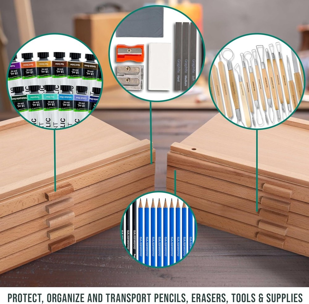 Specific Uses For Product Stationery Material Wood Special Feature Portable Color Brown Finish Type Lacquered Product Dimensions 0.5"D x 14.5"W x 8.25"H Shape Rectangular Unit Count 1 Count Package Type Standard Packaging See less Item Weight 12.07 Pounds Number of Compartments 50 About this item Mega Storage Capacity: With 10 drawers, this stackable storage box offers ample space to organize and store a wide range of art supplies, from pastels and pens to pencils, charcoal, and blending tools. Durable Construction: Hand-sanded boxes made of elm hardwood and top-grade plywood with elm veneer ensure sturdy and long-lasting storage for your valuable art materials. Customizable Organization: Each drawer features 5 compartments, allowing you to arrange your colors and tools neatly and keep them separated for easy access. Removable Drawers: Easily access your supplies and customize your workspace with removable drawers, providing flexibility and convenience for artists of all levels. Space-Saving Design: Measuring 15-3/4" Wide x 9-3/4" Deep x 10-3/4" Tall, these stackable storage boxes offer generous storage capacity while conserving space in your studio or workspace. Boxes can be split apart and stored separately for even more convenience. Specific Uses For Product Stationery Material Wood Special Feature Portable Color Brown Finish Type Lacquered Product Dimensions 0.5"D x 14.5"W x 8.25"H Shape Rectangular Unit Count 1 Count Package Type Standard Packaging Number of Items 1