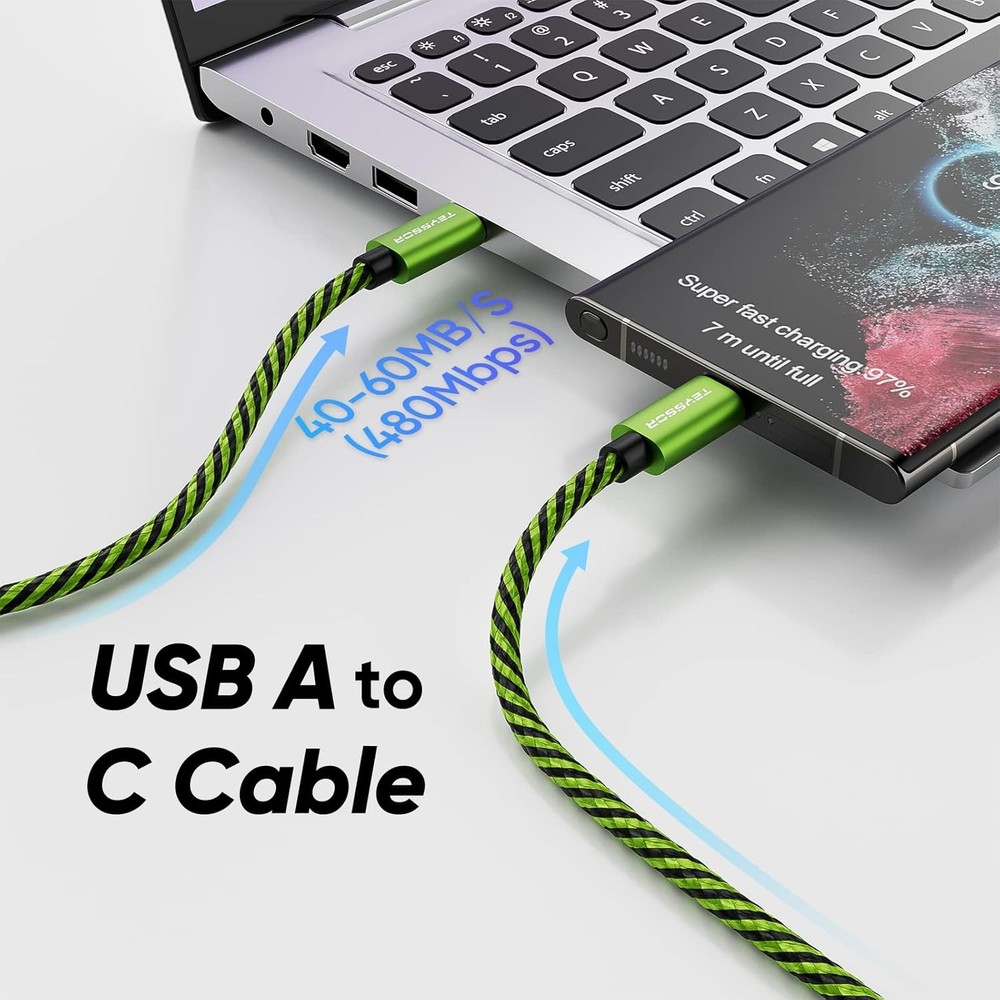 Teyssor USB C Cable 10FT 5-Pack Nylon Braided A to Type 10FT*5-Multicolor Product Details Package Dimensions : 8.39 x 5.59 x 1.5 inches; 9.88 ounces Item model number : Type-C Cable-RBOPQ 3m*5 Manufacturer : Teyssor Brand: Teyssor Connector Type: USB Type C Cable Type: USB Compatible Devices: Tablet, Charging Adapter, Smartphone Special Feature: Fast Charging High Speed Charging & Sync: USB TypeC to USB A Cable supports a safe fast charging and the speed of data sync up to 480Mb/s. NOTE: To achieve fastest charging speed, you need an USB A port charger that supports 100W of output power Premium Nylon Braided Cable: With its braided nylon insulation and precisely layer-welded connectors, which make it more durable and sturdier than normal cable Superior Desined: Durable TPE coating, multi-layer shielding and heat-resistant alloy cable head ensure maximum performance with a rated 10000+ Bend Lifespan Reliable and Durable: Type C aluminum cover for safe and reliable, integral Seamless stretch process, high pressure resistance. Aluminum alloy shell by micro-arc oxidation process makes the shell surface harder and more wearable Wide Compatibility: Designed to work flawlessly with any device that uses a USB-C port. Compatible with all Type-C tablets, smartphones such as Samsung galaxy s20, s20+ S20Ultra S8, S8 Plus, s10 s10 plus, Note 8 Note 9 Note10 Plus 5G etc