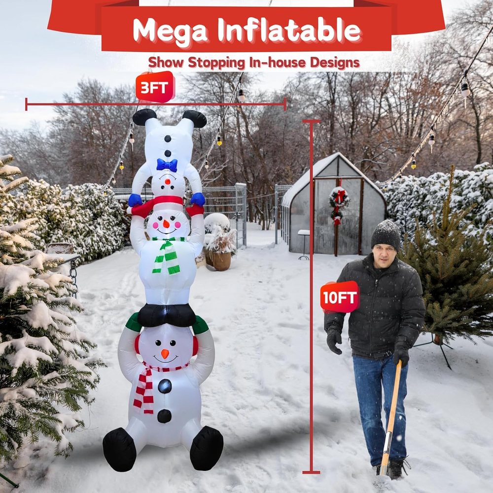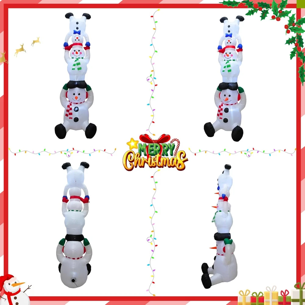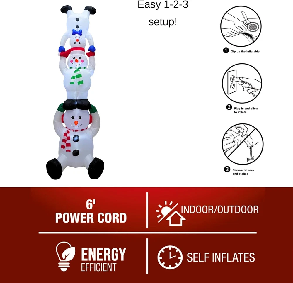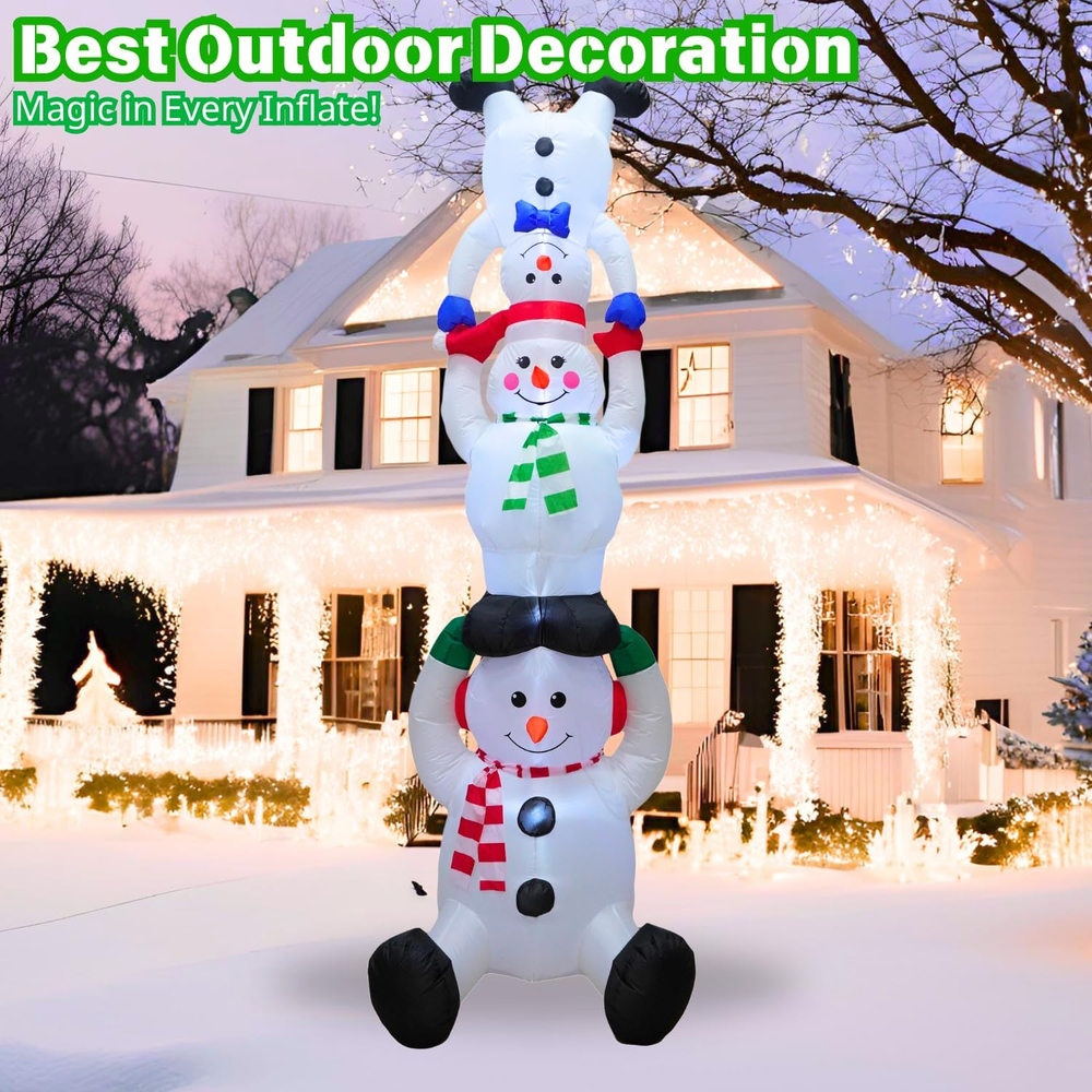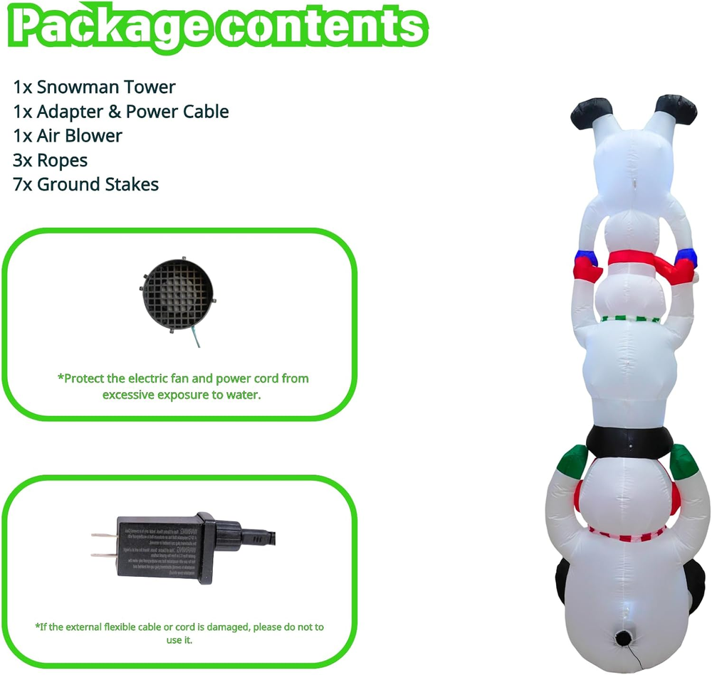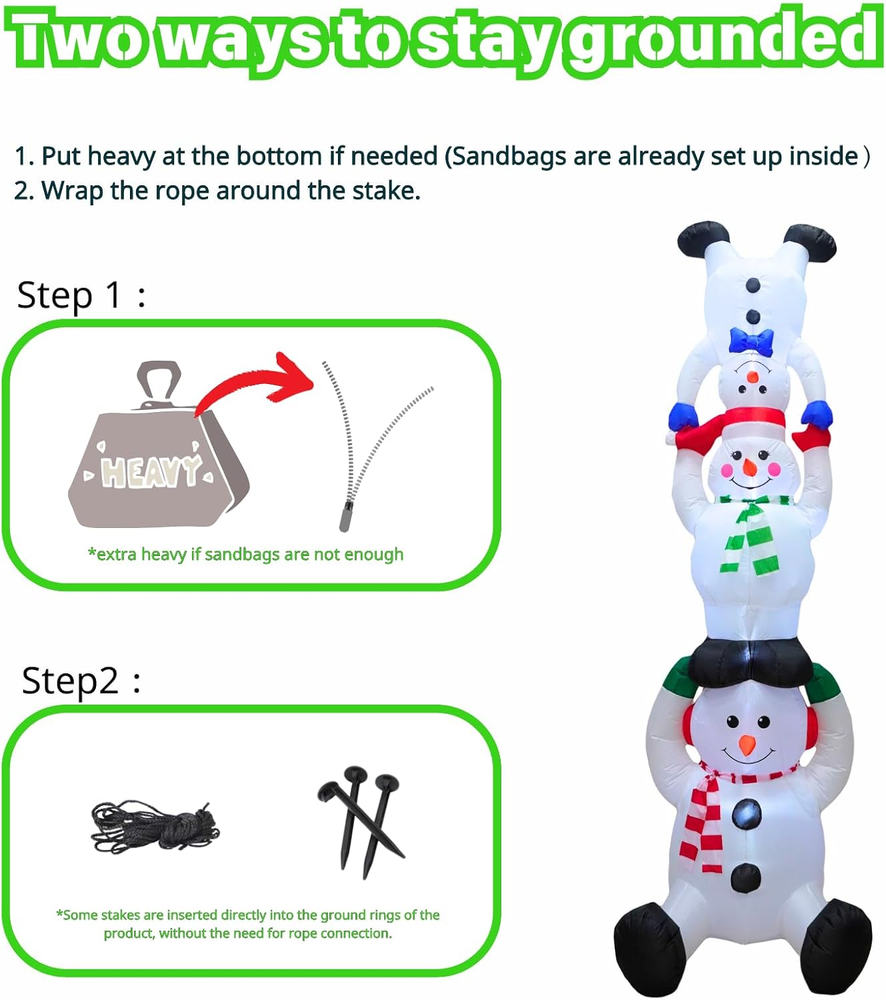 DURABLE & WEATHER-RESISTANT: This snowman family Christmas decorations is crafted from waterproof polyester for outdoor use. Reinforced stitching ensures durability in wind or rain, keeping its vibrant colors intact. Perfect for your Navidad decoración decorations, bringing festive joy all season long. SECURE & EASY SETUP: This Christmas inflatable comes with 7 stakes, 2 sandbag and 3 ropes for stable anchoring in any weather. The 6-feet extension cord offers flexible placement for your Christmas decorations outdoor. These accessories ensure easy setup and keep your outdoor Christmas decorations looking great all season. POWERFUL FAN INFLATE: This Christmas inflatable outdoor decoration inflates in about a minute with its powerful fan. Lightweight and easy to set up, both adults and kids can handle it without extra tools. Create a festive outdoor Christmas decorations yard display effortlessly with this fun Christmas yard decorations outdoor inflatable. INDOOR & OUTDOOR USE: This versatile Christmas yard decoration works perfectly indoors or outdoors. Easy to set up, this Christmas yard decorations outdoor inflatable adds festive charm to any space, making it ideal for holiday displays in your home or yard. BRINGS HOLIDAY CHEER: This Christmas decoration perfectly captures the festive spirit. Add charm to any yard with this easy-to-set-up outdoor Christmas decor. Ideal for creating a joyful atmosphere with vibrant Christmas outdoor decorations for all to enjoy! Product description