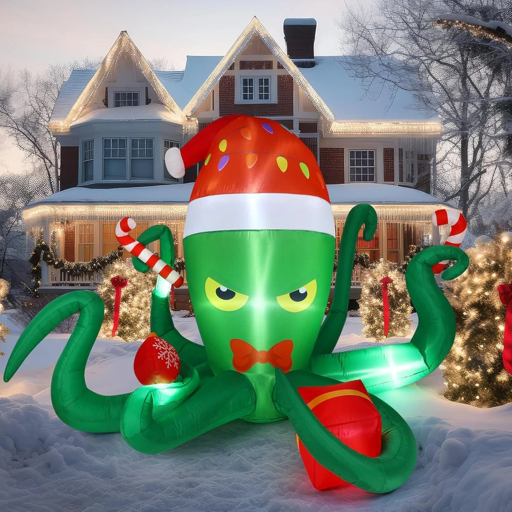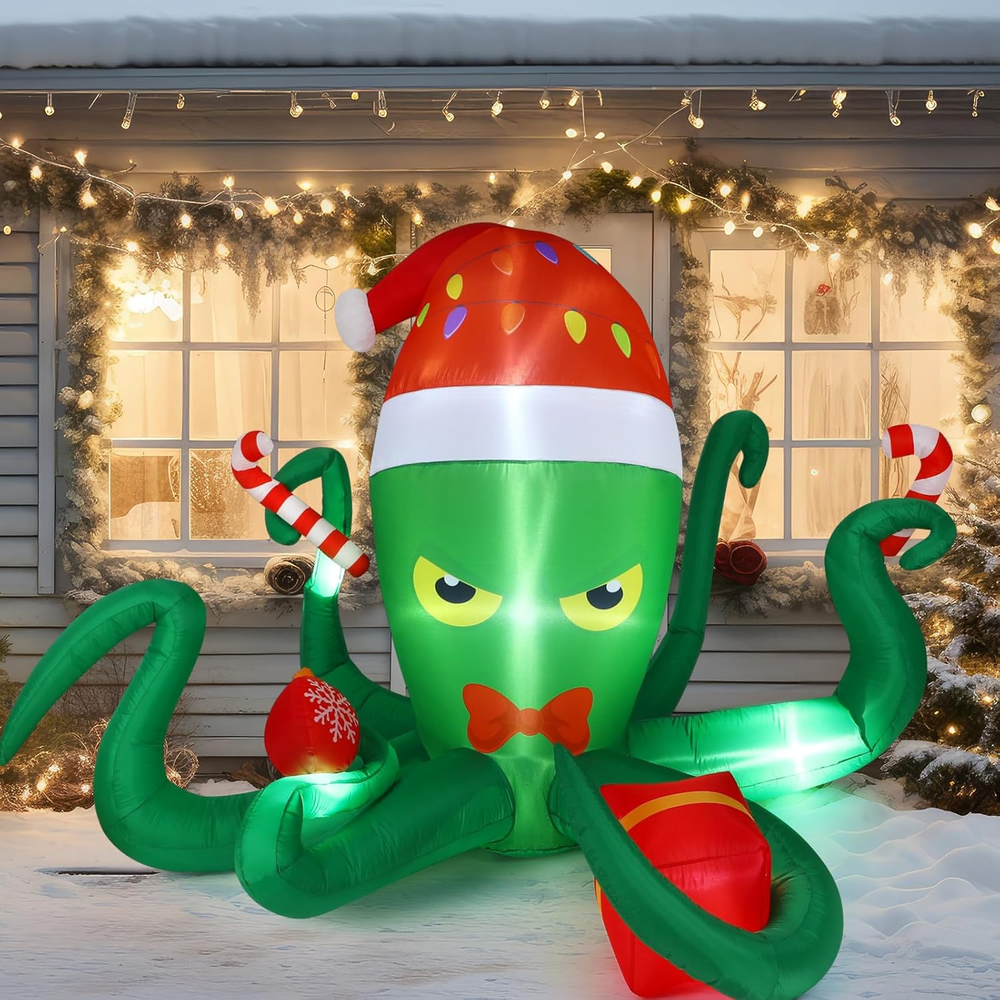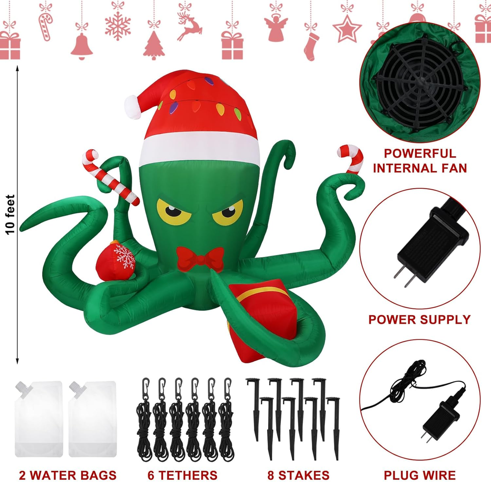 Christmas Inflatable Outdoor Decorations: the package comes with 1 Christmas inflatable octopus with Santa hat, about 10 ft in height, 4 weight pockets, 4 ropes, 4 stakes, 1 plug and a fan; The octopus makes it a delightful addition to your yard Reliable Material: this blow up Christmas Octopus outdoor decoration is made of PVC, reliable and waterproof, no fading, even in bad weather such as rain or snow, the inflatable can continue to work, for a long lasting using; Please keep the plug dry Easy to Use: the octopus inflatable has a built in powerful fan, only plug it in, the inflatable will show up in minutes, then use the ropes and stakes to keep it stable and provide better wind resistance, and when you don't want to use it, you can deflates effortlessly for storage, saving your space Bright LED Lights: our Christmas octopus inflatable decoration has LED lights inside, bright and charming, which can illuminate your lawn or garden at night, attracts the attention of neighbors at night, letting you have a Christmas different from the past Outdoor Large Inflatable Decoration: this inflatable Christmas octopus decoration is suitable for various outdoor occasions, such as festivals, terraces, gardens, lawns, courtyards, etc. It is very suitable for decorating your home and garden, allowing your family and friends to immerse themselves in the festive atmosphere and creating a more profound festive ambiance Features: The Christmas inflatable octopus is made of waterproof material, reusable and reliable, ideal for indoor and outdoor use, which will create a Christmas holiday atmosphere for your family and children. This Christmas blow up decoration is suitable for decorating yard, park, garden, lawn, Christmas, party and more, the built in LED lights will catch your neighbor's eyes, creating a warm festival atmosphere in your yard. Specifications: Material: PVC Color: Multiple color Size: Height: 10 ft Package includes: 1 x Christmas inflatable octopus with Santa hat 1 x Power adaptor 1 x Fan 4 x Weight pockets 4 x Ropes 4 x Stakes Notes: Manual measurement, please allow slight errors on size. The color may exist a slight difference due to different screen displays Do not overinflate the balloons to avoid bursting