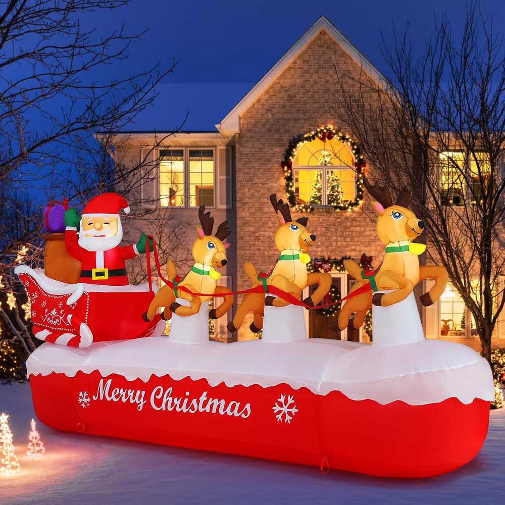 Magic Christmas Decor: Recreate a festive fairytale outdoors or indoors! This 4.5 Pounds inflatable Santa sleigh with Elks shines in yards, gardens, patios, roofs, malls, and family parties. Built-in warm white LEDs cast storybook charm, while the hand-sketched Santa brings delivers tangible magic for unforgettable childhood memories Stormproof & All-Weather Durability: Rugged waterproof polyester withstands Ultra-Low Temperature snow and rain.Adopting new reinforced stitching and upgraded materials, it dual-reinforces structural stability in outdoor scenarios. Snow wipes clean instantly – enjoy worry-free holidays Giant Size & Premium Details: 10 FT long giant display delivers maximum visual impact! Features hand-stitched details on waving Santa and reindeer reins for lifelike movement. Upgraded snowflake-resistant fabric with reinforced seams ensures flawless display year after year 3-Step Setup: Load 4 water bags into the bottom compartment and seal; plug in the UL blower to fully inflate Santa, sleigh, and reindeer in 60 seconds; then drive 8 stakes into the ground for fixation — delivering rock-solid stability even through severe storms! Zero assembly hassle Complete Holiday Package: Unbox it all: Inflatable Santa sleigh with reindeer, UL adapter, blower, 8 stakes, 4 tethers, and 4 water bags. Just unpack and create instant holiday magic. Then folds 90% smaller post-Christmas for easy storage Product description