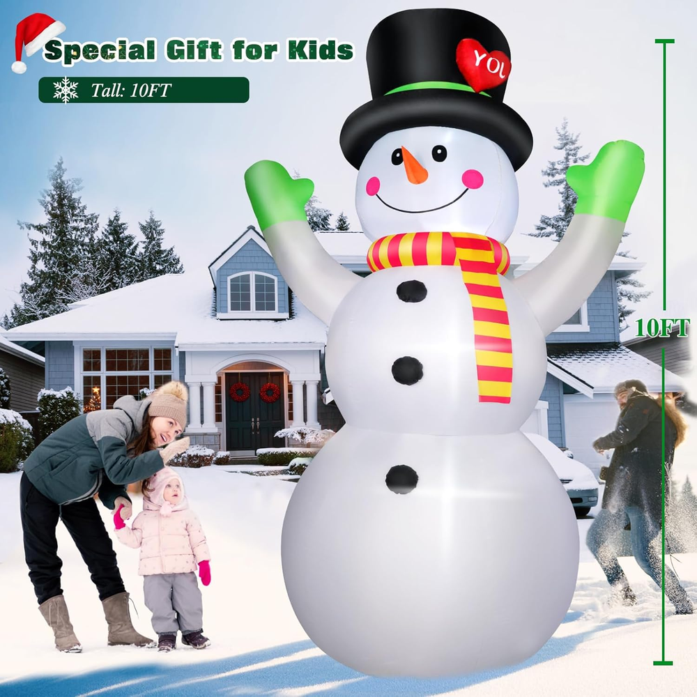 ⛄Giant Inflatable Snowman ⛄ This 10-foot-tall Christmas inflatable snowman is definitely a very eye-catching decoration for the holidays! Wearing a playful bowler hat, he welcomes guests with raised hands and a smile on his face. Whether you place it at the entrance of your patio or in the center of your garden, it will be the most charming sight in winter. Especially suitable for Christmas themed party decorations, shopping malls, and a great backdrop for Christmas Eve photo shoots! ⛄Excellent Craftsmanship ⛄ This thanger giant inflatable snowman is made of IP44 waterproof 190T high-density thick polyester material, which is durable and wrinkle-resistant, and is not easy to be pierced by sharp and hard things. Equipped with a 10-foot power cord, you can easily inflate the snowman near your house. ⛄Stable and Secure Enough ⛄ This charming inflatable snowman comes with 6 ground stakes, 4 nylon ropes to keep this cute snowman firmly fixed on the ground. The built-in sandbags make it convenient and safe to keep it well-positioned in windless conditions without additional anchoring. Whether as a home decoration or a holiday gift, this thoughtfully designed inflatable snowman can bring you full of Christmas joy and make your friends and family feel the strong festive atmosphere! ⛄Built-in Super Bright Lights ⛄This gorgeous blow up snowman has a built-in strip of high-brightness white LED lights that blossom into a soft glow at nightfall, decorating your yard or lawn into a dreamy winter wonderland. The extra-large size makes it stand out from a distance, making it the brightest holiday star in the entire neighborhood. Whether you want to create a warm holiday atmosphere or a stunning Christmas landscape, this light-up snowman will bring you endless surprises and joy! ⛄Easy to Use ⛄ Equipped with a powerful blower, this smart inflatable snowman can be automatically inflated in just a few minutes by simply turning on the power. Storage is also easy and convenient - unzip the bottom zipper after power off and the snowman can deflate itself. Folded and compressed, it is compact and easy to store in a locker or corner for a hassle-free holiday decorating experience! Product description