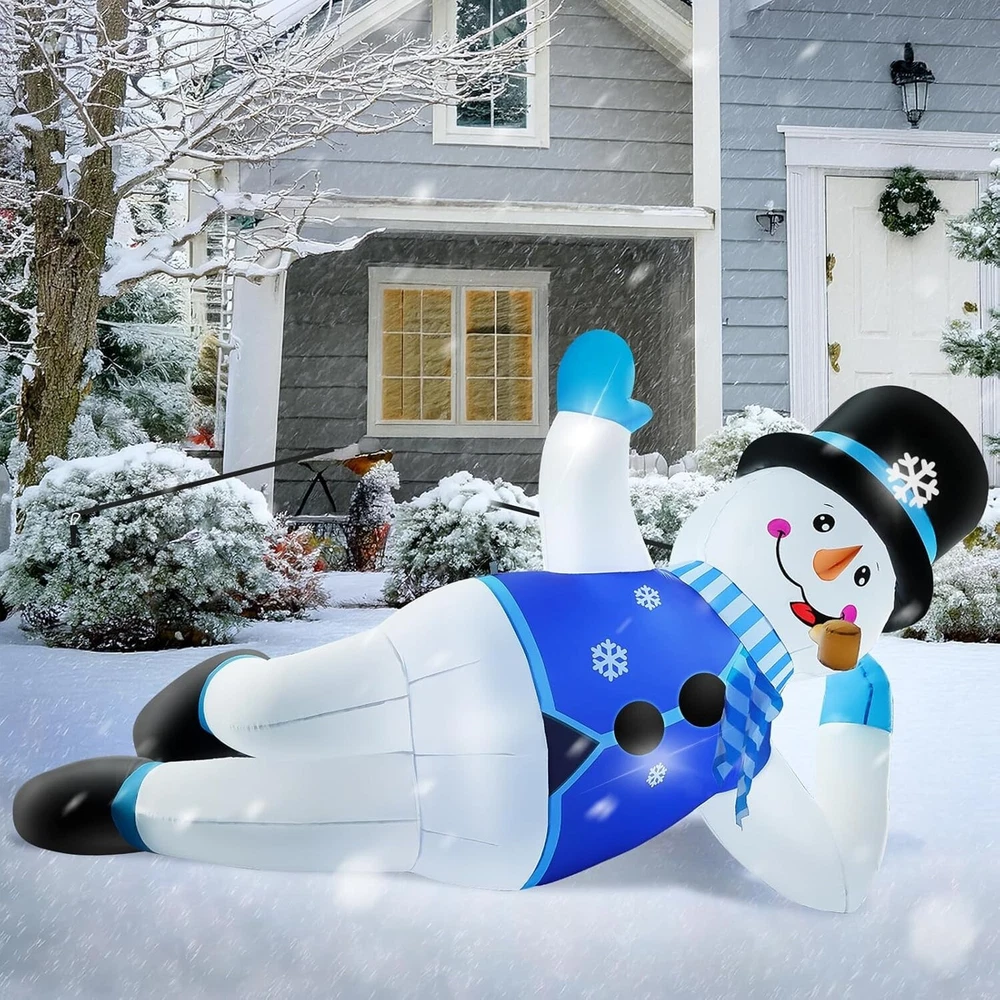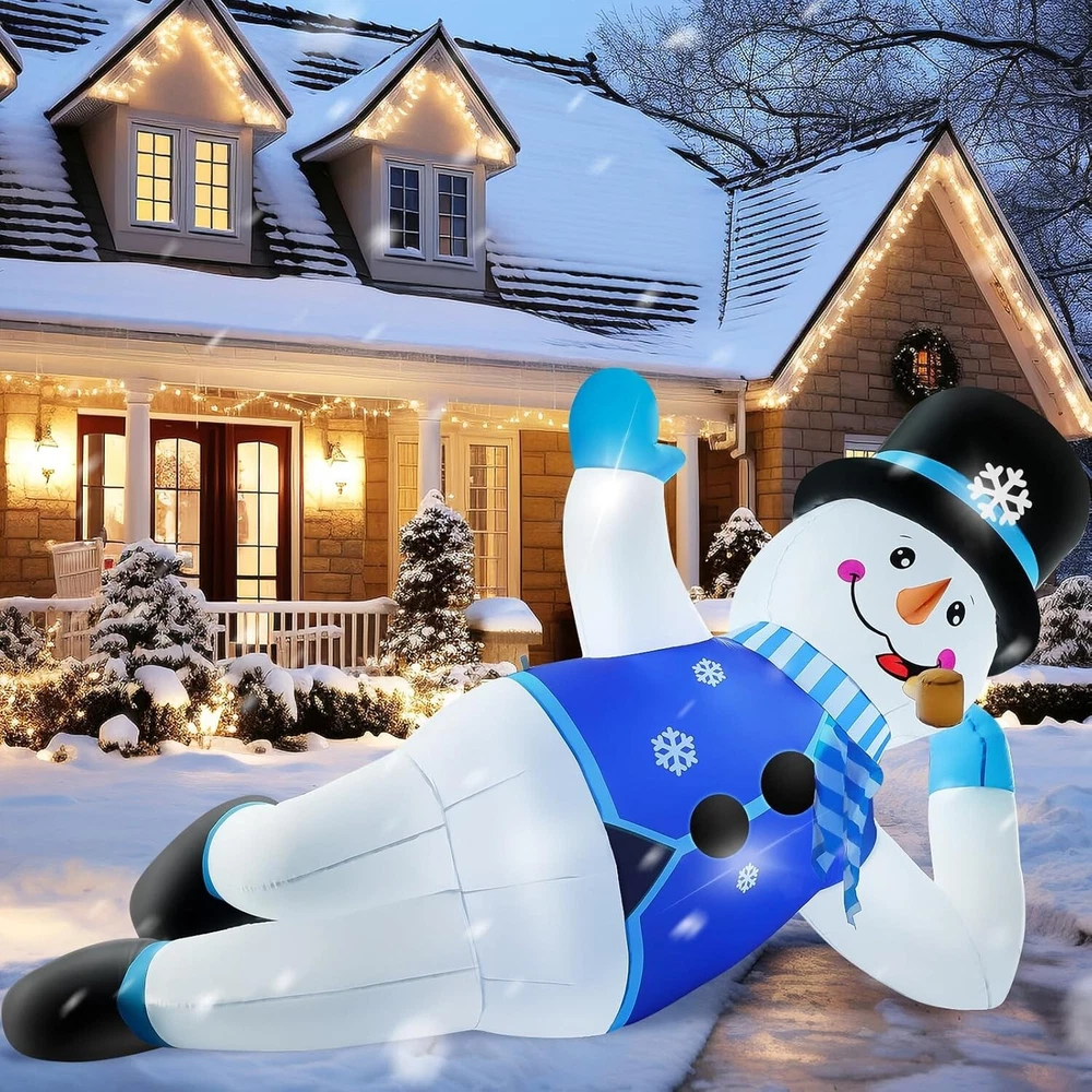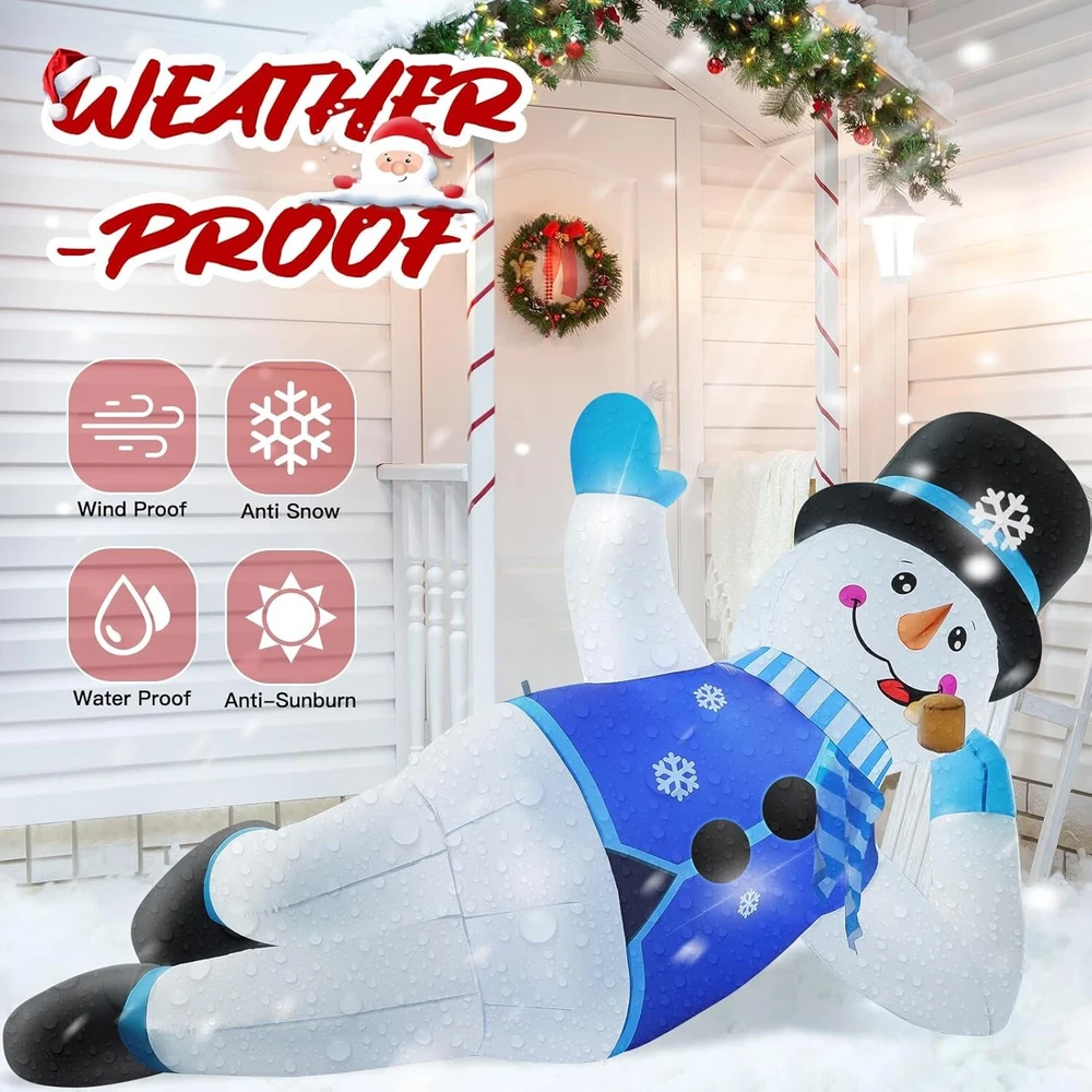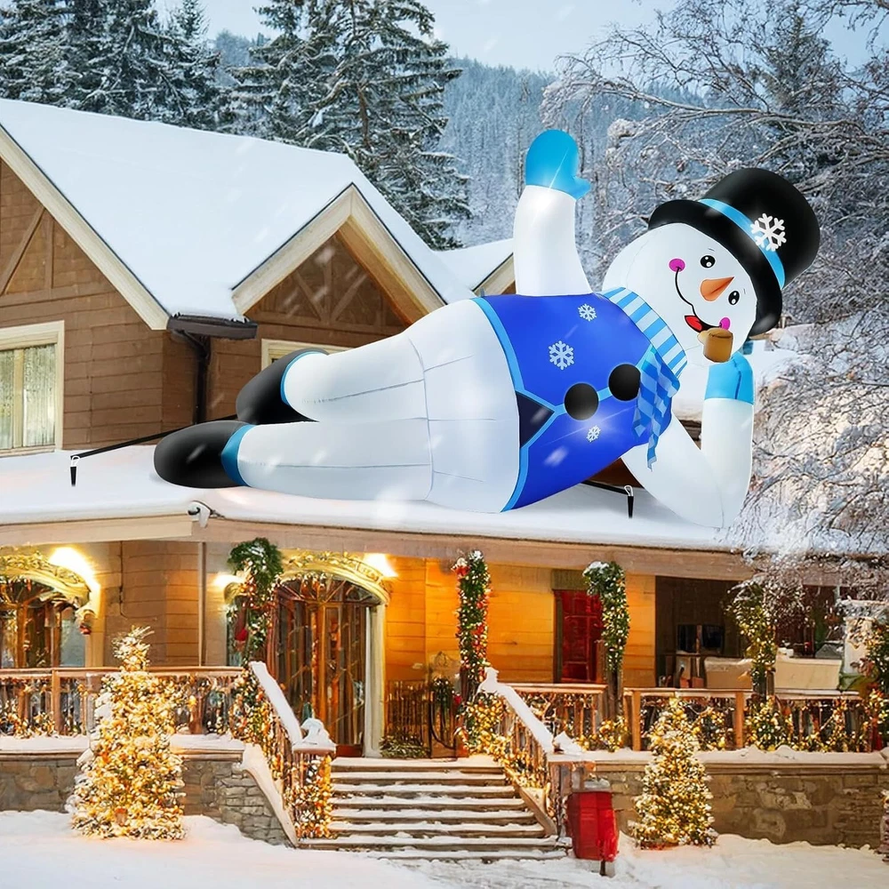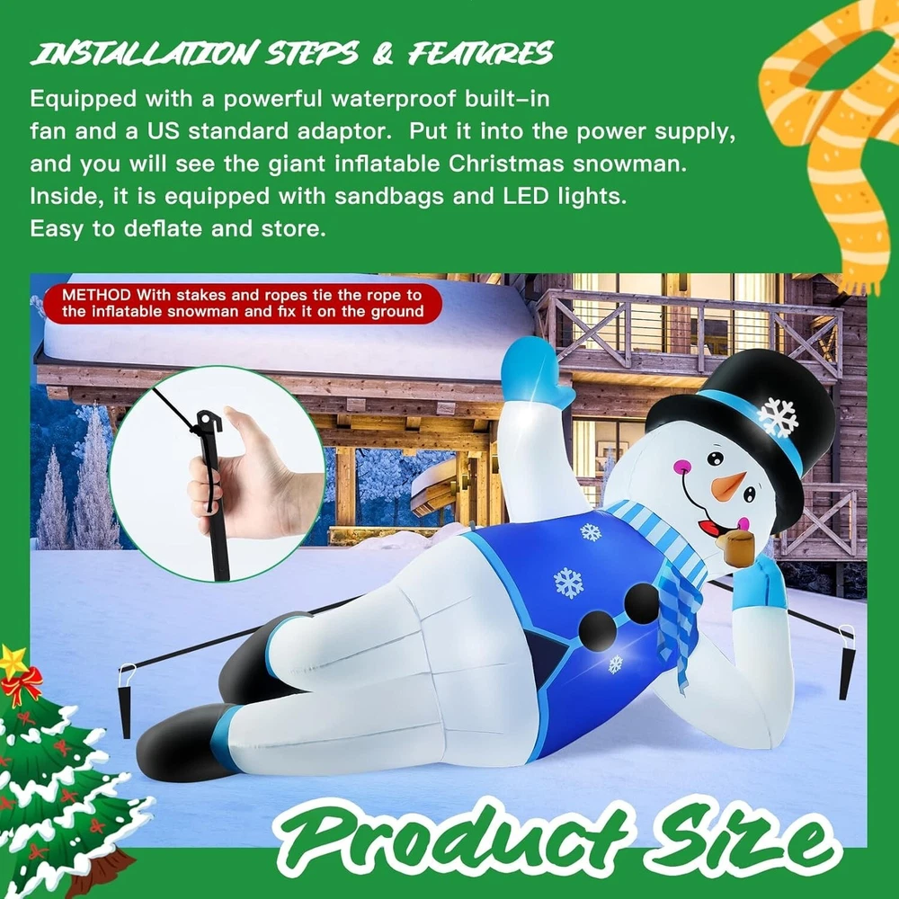 10FT Giant Inflatable Christmas Snowman: Contains many Christmas elements, Bright colors, eye-catching, and super atmospheric, perfect for roof, balcony, windowsill, yard, garden, and lawn. 10FT inflatable Christmas snowmen say hello to them when your kids or your guests come Built-In Bright LED Lights: Christmas inflatables outdoor decorations have built-in 5 bright LED lights that will light up as soon as it is plugged in, create a lively atmosphere at night, and make it look perfect every holiday night. Ideal for Christmas outdoor yard garden decorations, and gift-giving event decorations Durable and Stable Design: This Christmas blow-up yard decoration is made of durable and waterproof polyester fabric with a chemical-resistant and non-nasty smell, easy to relax and fold, and can be reused. The ropes and ground nails are available to help you set up in any desired place Powerful Blower: This Christmas yard inflatable decoration is easy to install. Self inflates in moment when plugs into a standard electrical outlet with a built-in blower. This blower is an upgraded version this year and is resistant to falling and freezing. Don't forget to zip up the bottom zipper What You Get: 1x 10ft inflatable Snowman, 1x blower, 1x UL adapter, 3x rope, 7x ground stakes, 4 x pull ring buckle. Let this cute snowman accompany you and your family to spend a wonderful Christmas!
