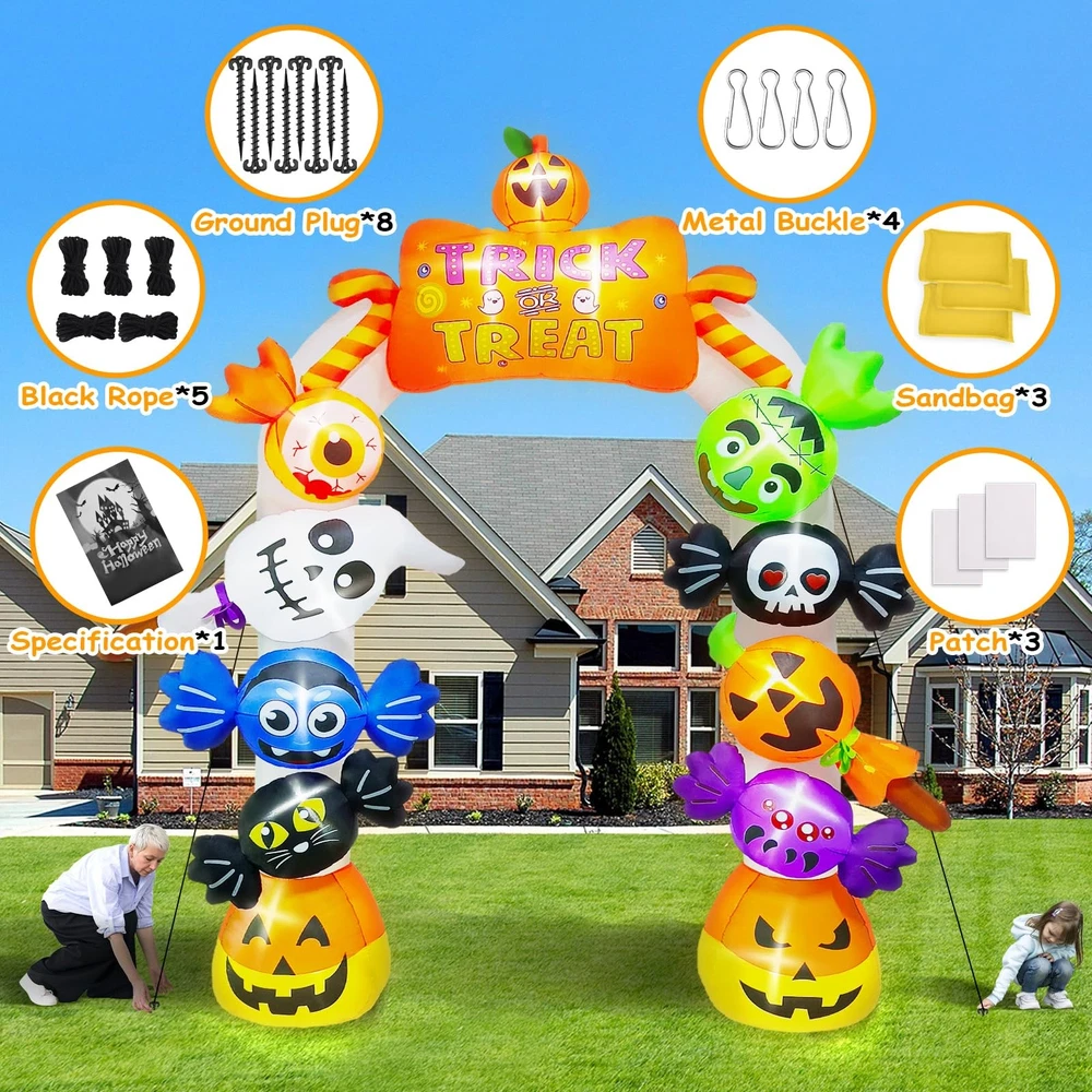 10FT Tall Halloween Inflatables Archway Candy Ghost, Giant Halloween Outdoors Decoration Pumpkin Arch Blow Up Yard Decorations with Build-in Lights for Yard Garden Lawn Indoor Outdoor Decor Product Feature: 1.Sturdy and Waterproof- Made of high-quality polyester fabric, it is weather-resistant and fade-resistant, will not rips and tears easily. 2.Fast Inflates & Safety- Equipped with a powerful built-in fan that can be inflated in minutes. The CE and UL standard safety-certified adapter ensures the safety for usage. 3.Eye Catching LED Light- Built in bright LED lights to illuminate your lawn or garden, attracts the attention of neighbors and children, create a perfect night display effect. Product Specifications: Fabric: Waterproof Polyester High: 10Ft Tall Color: Colorful Design: Halloween Inflatables Archway with Pumpkins, Bats, Ghosts, Bloodshot eyes and Skulls Candy Design Power: Plug in Package Include: 1 x Halloween Inflatables Archway 4×Buckle 8×Ground Stakes 5× Fixed Rope 1×Power Adapter 1×Air Blower 13× Build-In Led Light 3× Build-in Sandbag 3× Patch Cloth 【Impressive Giant Halloween Arch】Transform your yard into a spooky wonderland with 's 10FT Tall Halloween inflatables. This giant candy ghost inflatable archway includes all the classic and popular Halloween elements such as pumpkins, bats, ghosts, bloodshot eyes and skulls that is sure to attract attention from trick-or-treaters and neighbors alike. The candy ghost's creepy smile completes the spooky scene, will send chills down the spine of anyone who dares to come close. 【Elevate Your Halloween Decors】Halloween blow up inflatable features 13 ultra bright build-in LED light for a creepy atmosphere to light up your Halloween night. Each candy ghost is uniquely decorated with vibrant colors and wickedly scary smiles, perfect for adding a spooky touch to your outdoor decor. It is a truly impressive inflatable that also serves as a great backdrop for photos. 【Upgrade Air Blower】Our blow up yard decoration is equipped with a improved waterproof and powerful built-in air blower, ensuring long-lasting use that won't break easily, even in wet conditions. It's incredibly easy to use - just zip up the bottom, plug into a standard outlet, and it will inflate in minutes. With CE and UL safety certifications, you can have peace of mind that your decorations are safe to use. 【Excellent Craftsmanship】Our Halloween inflatable decorations are crafted from high-strength polyester fabric, ensuring superior water and fade resistance and protection against rips and tears. With air-tight stitching technology, our scary inflatable ensure longevity and can withstand any weather condition, from wind to snow. 【Versatile Halloween Decoration】Our Halloween inflatables archway will come with all necessary components - 8pcs ground stakes, 4pcs metal buckle, 5 black ropes, 3pcs patch cloth and 3 build-in sandbag that ensuring maximum stability and durability. Its compact and lightweight design makes it portable and easy to store. Perfect for placing in the garden, yard, walkway, patio, lawn, indoors or outdoors parties.