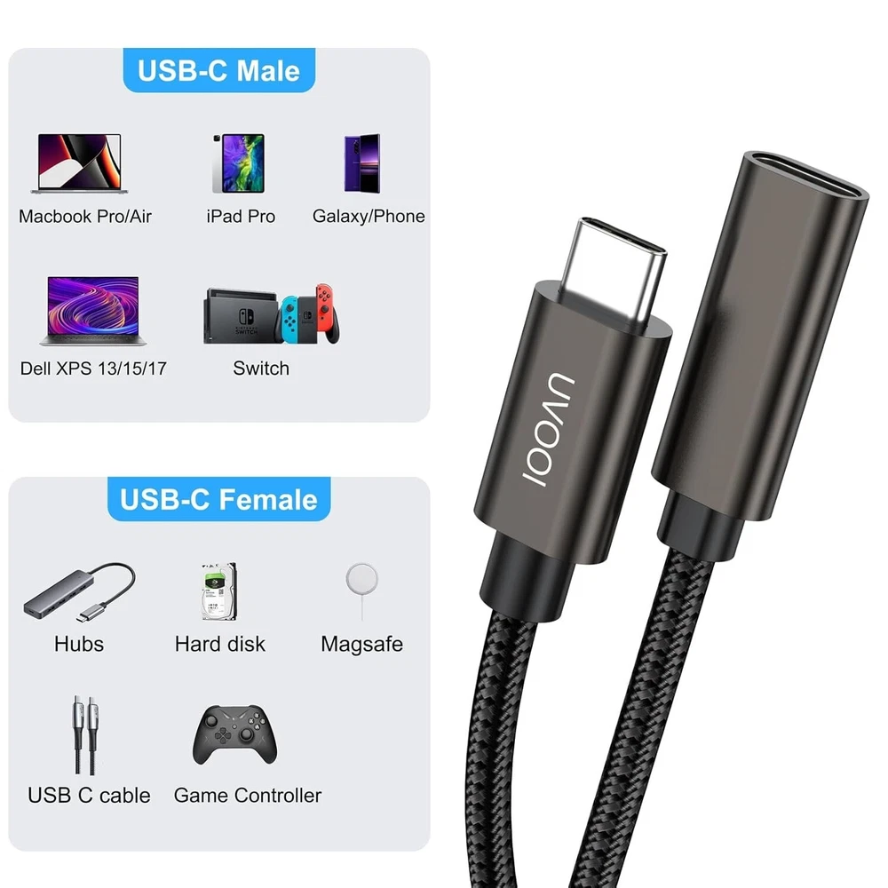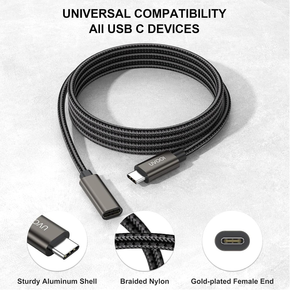 【10FT USB C Extension Cable】USB 3.2 Type C Extension Male to Female data transfer and fast charging cable, which is used to extend the use of long distance USB type-c devices. Compatible with Samsung,Macbook,Tablt,iPad Air Mini Pro and More. It perfectly works for the majority of USB C enabled devices. 【100W Fast Charging & 10Gbps Data Sync】USB C extender cable support PD3.0/QC3.0/QC4.0 fast charging up to 100W, which is ensured by high-speed safe charging. The USB C female to male cable supports up to 10Gbps data transfer, which transferring HD videos or just back up your files in seconds. A hard-wearing nylon braided and a bulletproof fiber core that can withstand up to 20000+ bends. Ensure long-term use. 【UHD 4K Video】USB type C extension support up to 4K(3840x2160) and 1920x1200, 1080P@60Hz Video&Audio signal transferring. you could extend the connection to a larger/portable monitor for e-learning, working, gaming or watching movies. 【Plug and Play】This 10FT/3M USB-C Extension Cable could enlarge the scenes in your daily life. Besides the scenes of other shorter cables applied for, you could also connect your devices to your laptop/phone while siting on a couch or bed at home or in a hotel. 【Broad Compatibility】Compatible with type c phones, like iPhone 16/15 series, Galaxy S24/S23/S22 Ultra/S21/S20/Note 20/Note 10, Chromebook Pixel. And MacBook Pro/ iPad Mini/Pro, M1 Macbook Mac mini, Dell XPS 13/ 15 and more. (NOTE: This usb c extender does not work with any active Thunderbolt 3 docking stations/ hubs/ cables.)