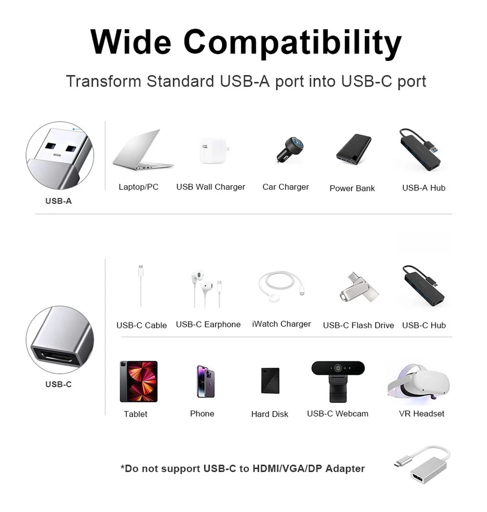 The USB C to USB adapter is use to connect any USB A periphery to USB C devices, it work for data transfer, charger , OTG (On-The-GO). Two Ports: 1 male USB -C , 1 female USB-A . Data transfer speed : USB3.2 Gen2 up to 10Gbps. Materials: Al Alloy . What you can benefit from USB Adapter: Plug and Play, Portability, Wide compatibility, Super speed, Value for money, Good quality for materials, Safe and Stable. Easy to Use : Plug and play USB dongle, driverless for any devices, its function is Sync Charger + Data, the most effective way to charge your new iPhone or USB-C enabled device on your existing old style USB-A charger or device instead of replacing your cable or charger. Wide Compatibility: The USB to USB C adapter is to transform female USB Type A port into USB-C port to connect USB C peripherals to USB-A built devices, which allow your USB-A laptop, desktop, Hub, USB charger, car charger, power bank be connected with USB-C enabled mobile phone, tablet, headset, flash drive, Hub, HDD, webcam, Apple Watch magnetic charger and Apple MagSafe charger(Power source 15W needed) and so on. Super Speed Data Transfer : Supports up to USB3.1 Gen2 10Gbps data transmission, 20 times of USB 2.0(480Mbps), speed up the data transfer for file, photos, videos or musics. * Doesn't support video signal transmission like HDMI,VGA,DP adapters. ** Only supports single-sided 10Gbps high-speed transmission, simply switch between 10Gbps and 480Mbps with flipping of the USB plug. Stable and Fast Charging : The USB A to USB C adapter supports 3 Amps max power output for fast charging, easily hooks up your USB-A wall charger, power charger block, car charger, power strip or power bank with USB-C charger cable for iPhone 14 or iPhone 8 or later,Samsung Galaxy S22/S21/S20, Google Pixel, iPad, Airpods, Apple watch charger etc. Compact and Durable: This USB-A OTG adapter with Lightweight body makes it easy to carry around for traveling or stick on the devices, One for home, one for office and one for car or traveling. High quality of Aluminum Alloy case and excellent workmanship make this adapter withstand more than 10,000 frequent plug-in and out test.