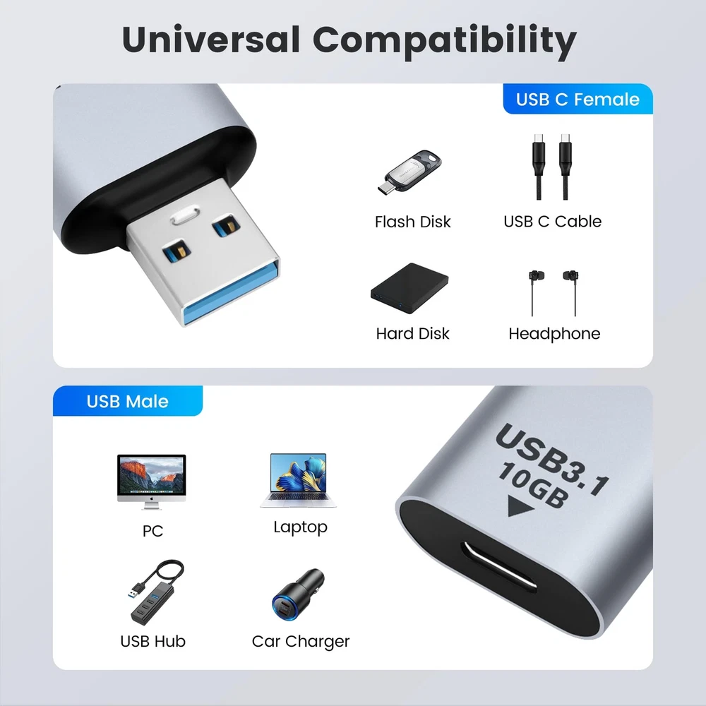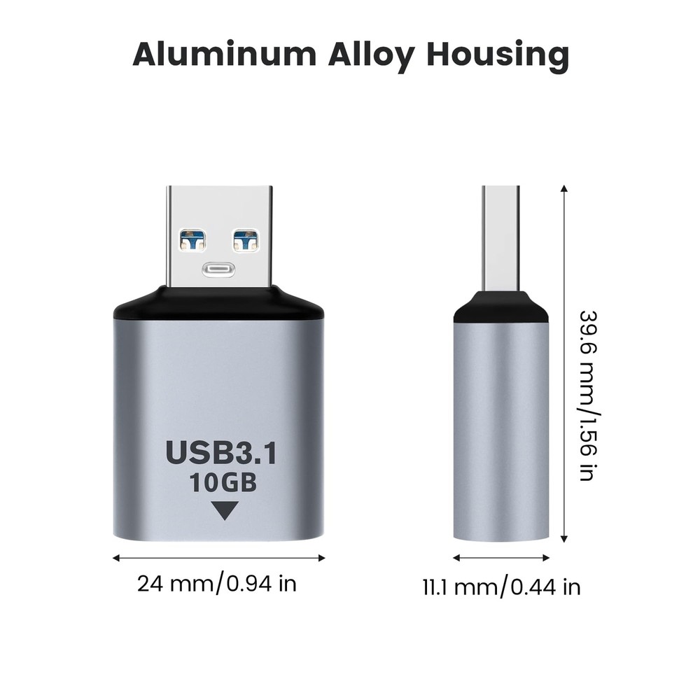 【USB 3.1 Male to USB-C Female】USB 3.1 male to USB-C female adapters (2 Pack). It can be used to connect a USB A female cable to a USB-C male mobile device or USB-C flash drive, and can also be used to connect peripherals such as webcams and hard drives 【High-speed Charging】The adapter supports a maximum of 5V/3A, providing the fastest charging speed for your device, suitable for PCs, laptops, USB-A chargers, mobile power banks, etc. 【10Gbps Data Transfer】Full-function adapter, supports audio and video transmission, USB3.1 adapter can provide up to 10 Gbps data transfer speed. Plug and play, no additional drivers required 【Small and Portable】Ultra-compact design, wear-resistant and durable aluminum alloy material, rapid heat dissipation, exquisite appearance details and strict quality inspection standards 【Warranty Period】All products are guaranteed for 2-year. If you have any question, please feel free to contact us 【USB 3.1 Male to USB-C Female】USB 3.1 male to USB-C female adapters (2 Pack). It can be used to connect a USB A female cable to a USB-C male mobile device or USB-C flash drive, and can also be used to connect peripherals such as webcams and hard drives 【High-speed Charging】The adapter supports a maximum of 5V/3A, providing the fastest charging speed for your device, suitable for PCs, laptops, USB-A chargers, mobile power banks, etc. 【10Gbps Data Transfer】Full-function adapter, supports audio and video transmission, USB3.1 adapter can provide up to 10 Gbps data transfer speed. Plug and play, no additional drivers required 【Small and Portable】Ultra-compact design, wear-resistant and durable aluminum alloy material, rapid heat dissipation, exquisite appearance details and strict quality inspection standards 【Warranty Period】All products are guaranteed for 2-year. If you have any question, please feel free to contact us