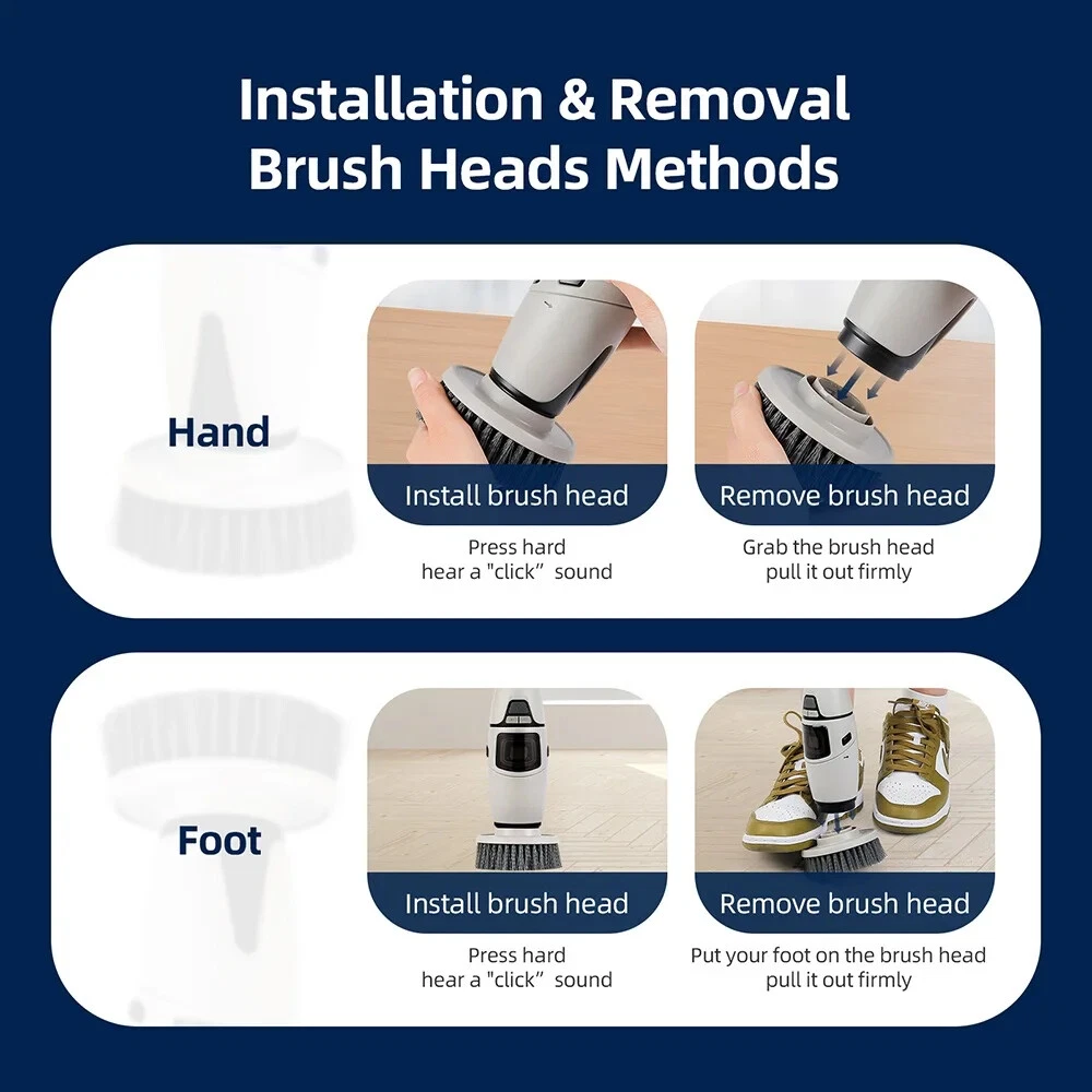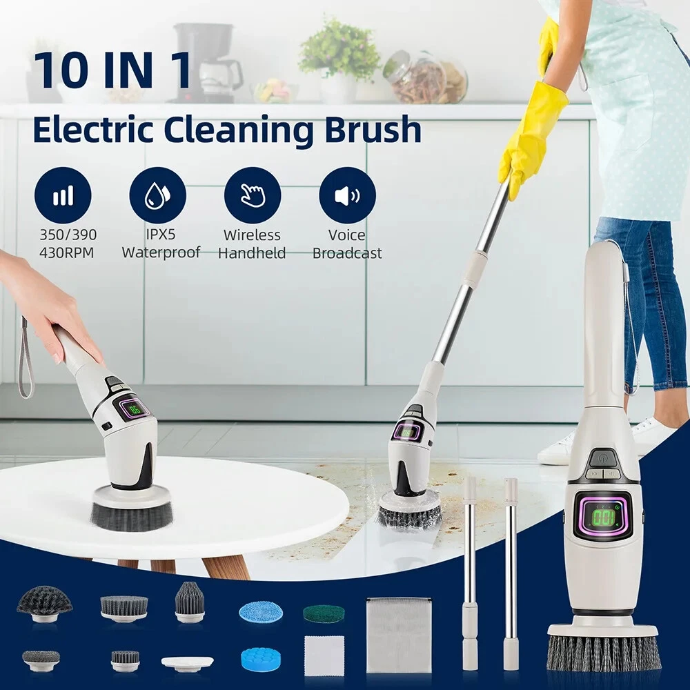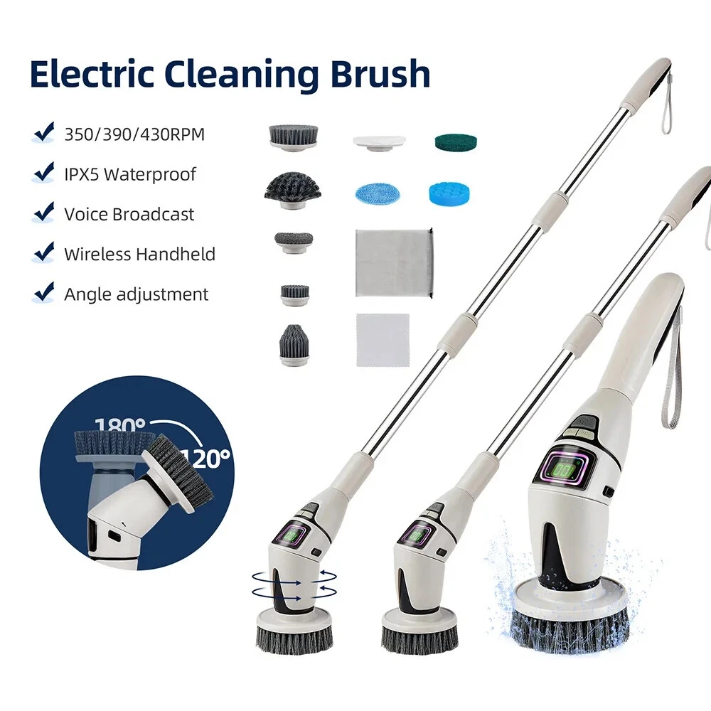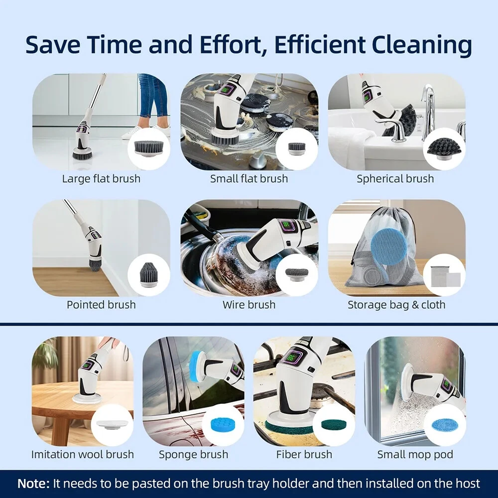Electric Cleaning Brush Feature 1.Clean good helper. 25W high-power equipped with 2500mAh lithium battery, use time 90 minutes, charging time 4-5 hours, 3 kinds of speed 350/390/430RPM, high-performance motor to ensure durable strong cleaning effect. 2.Effortless cleaning. A variety of brush heads, multi-scenario application, to meet the whole house surface deep cleaning and home or car polishing and waxing. 3.Time & effort saving. Electric operation, free your hands. 9 multi-function replaceable brush heads and 1 brush tray holder, mesh bag and rag are provided. Use brush heads to treat stubborn dirt in bathtubs, dead ends, crevices, or to retouch surfaces such as glass, tile, cars, and furniture. 4.IPX5 waterproof. Type-C charging port is waterproof, with high strength sealing and waterproof capability. Note: The host can be rinsed, but not soaked. 5.Adjustable brush head, ergonomic design, adjustable brush head Angle. 6.Extendable rod. The electric cleaning brush is equipped with a detachable and retractable metal extension rod, allowing easy access to tight corners and high spots, making cleaning under furniture, around faucets, and in ceiling corners a breeze. 7.The voice announcement function can prompt and guide operations, as well as provide real-time feedback on working status and mode. Installation & Removal Brush Head Methods Hand ①Install brush head Press hard, hear a "click”sound. ②Remove brush head Grab the brush head, pull it out firmly. Foot ①Install brush head Press hard, hear a "click”sound. ②Remove brush head Put your foot on the brush head, pull it out firmly. Install connecting rod method ①Connecting rod into the main machine. ②Marble ejection installation is complete. Telescopic rod use method ①Rotate the grip to the left. ②Pull out the length and tighten to the right. Specification Item type: Electric cleaning brush Charging voltage: 5V2A Rated power: 25W Battery content: 2500mAh Charging time: 4-5 hours Using time: 90min Rotation angle: 120-180° Speed: 350/390/430RPM Product Include 1* Main machine 1* Storage bag & cloth 1* Large flat brush 1* Small flat brush 1* Pointed brush 1* Spherical brush 1* Small brush tray 1* Wire brush 1* Small mop pod 1* Imitation wool brush 1* Fiber brush 1* Sponge brush 1* Connection rod 1* Telescopic rod 1* Type-C cable 1* Manual 1* Box