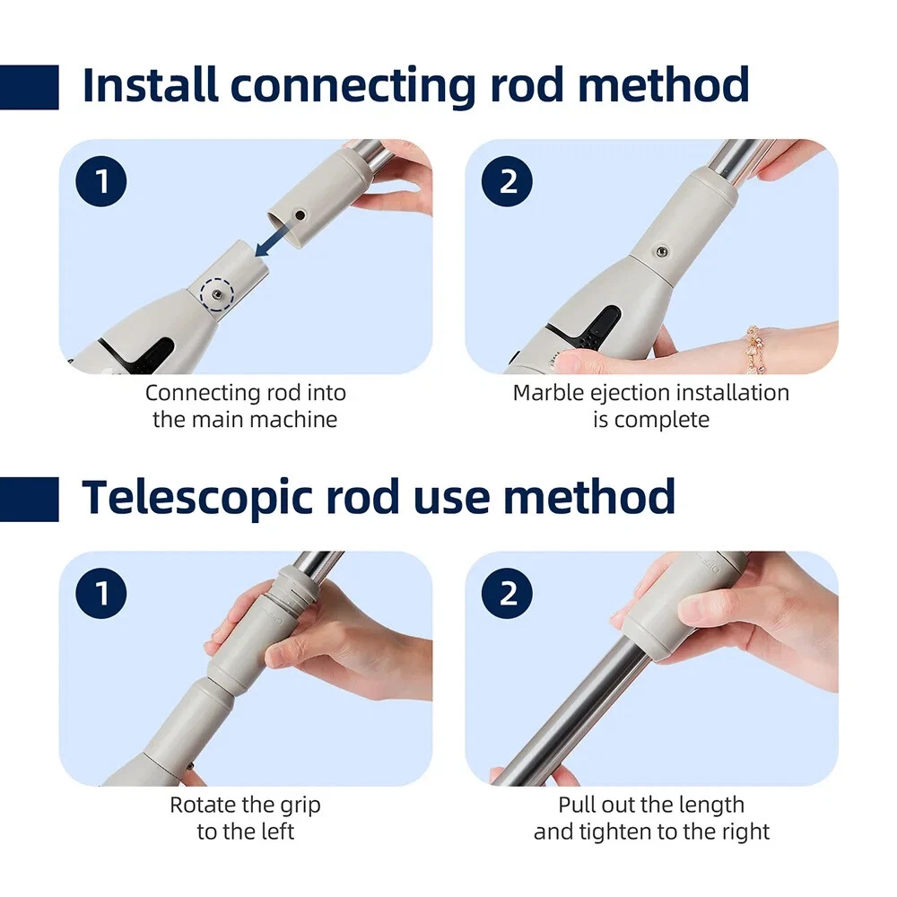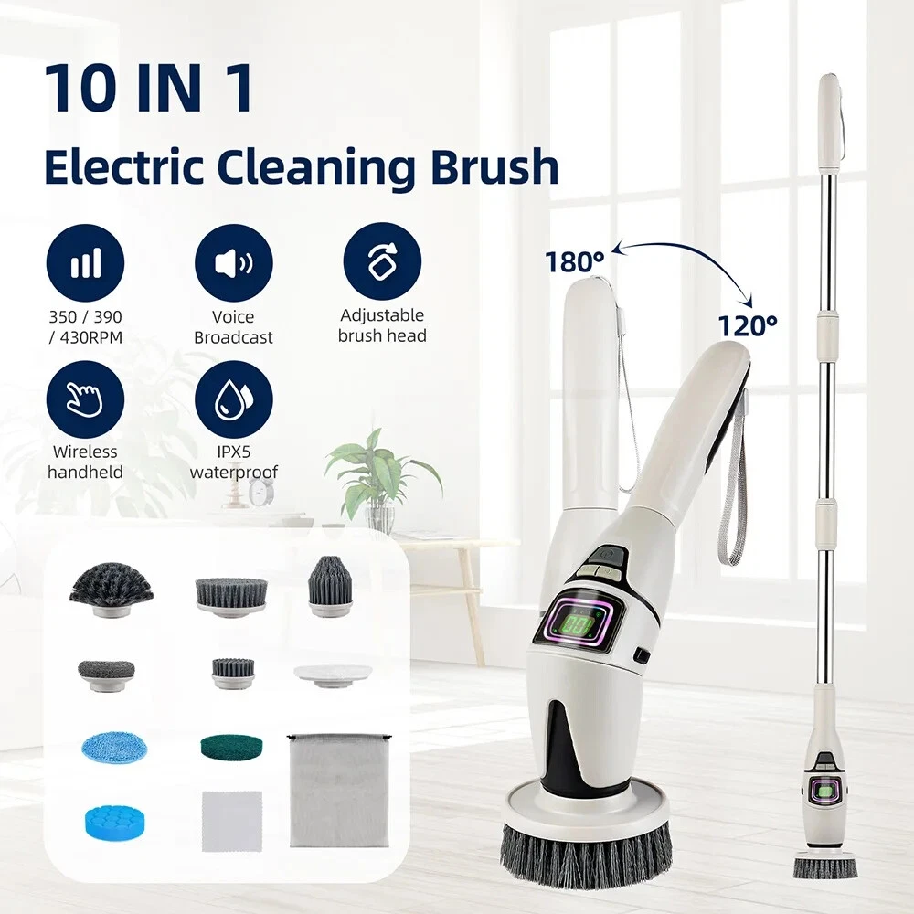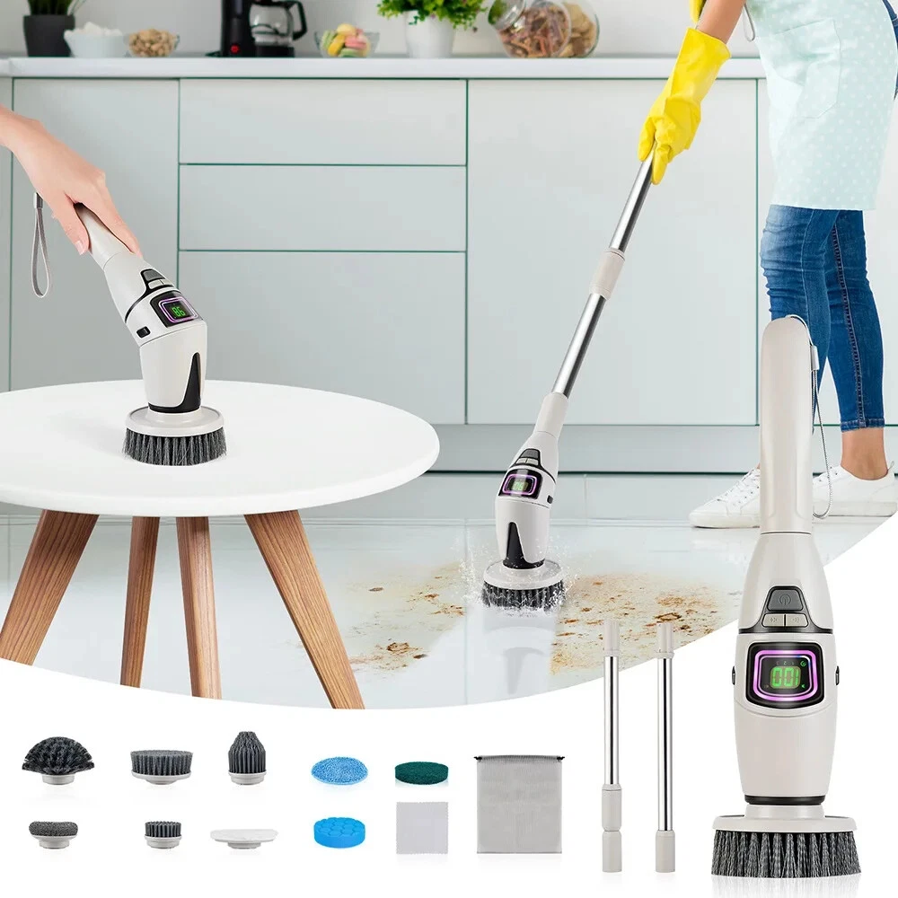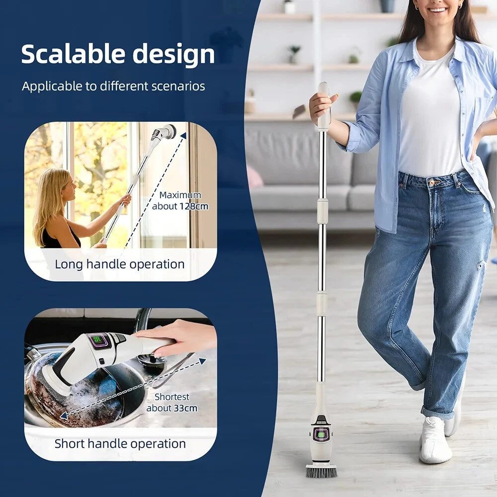 Electric Cleaning Brush Feature 1.Clean good helper. 25W high-power equipped with 2500mAh lithium battery, use time 90 minutes, charging time 4-5 hours, 3 kinds of speed 350/390/430RPM, high-performance motor to ensure durable strong cleaning effect. 2.Effortless cleaning. A variety of brush heads, multi-scenario application, to meet the whole house surface deep cleaning and home or car polishing and waxing. 3.Time & effort saving. Electric operation, free your hands. 9 multi-function replaceable brush heads and 1 brush tray holder, mesh bag and rag are provided. Use brush heads to treat stubborn dirt in bathtubs, dead ends, crevices, or to retouch surfaces such as glass, tile, cars, and furniture. 4.IPX5 waterproof. Type-C charging port is waterproof, with high strength sealing and waterproof capability. Note: The host can be rinsed, but not soaked. 5.Adjustable brush head, ergonomic design, adjustable brush head Angle. 6.Extendable rod. The electric cleaning brush is equipped with a detachable and retractable metal extension rod, allowing easy access to tight corners and high spots, making cleaning under furniture, around faucets, and in ceiling corners a breeze. 7.The voice announcement function can prompt and guide operations, as well as provide real-time feedback on working status and mode. Installation & Removal Brush Head Methods Hand ①Install brush head Press hard, hear a "click”sound. ②Remove brush head Grab the brush head, pull it out firmly. Foot ①Install brush head Press hard, hear a "click”sound. ②Remove brush head Put your foot on the brush head, pull it out firmly. Install connecting rod method ①Connecting rod into the main machine. ②Marble ejection installation is complete. Telescopic rod use method ①Rotate the grip to the left. ②Pull out the length and tighten to the right. Specification Item type: Electric cleaning brush Charging voltage: 5V2A Rated power: 25W Battery content: 2500mAh Charging time: 4-5 hours Using time: 90min Rotation angle: 120-180° Speed: 350/390/430RPM Product Include 1* Main machine 1* Storage bag & cloth 1* Large flat brush 1* Small flat brush 1* Pointed brush 1* Spherical brush 1* Small brush tray 1* Wire brush 1* Small mop pod 1* Imitation wool brush 1* Fiber brush 1* Sponge brush 1* Connection rod 1* Telescopic rod 1* Type-C cable 1* Manual 1* Box