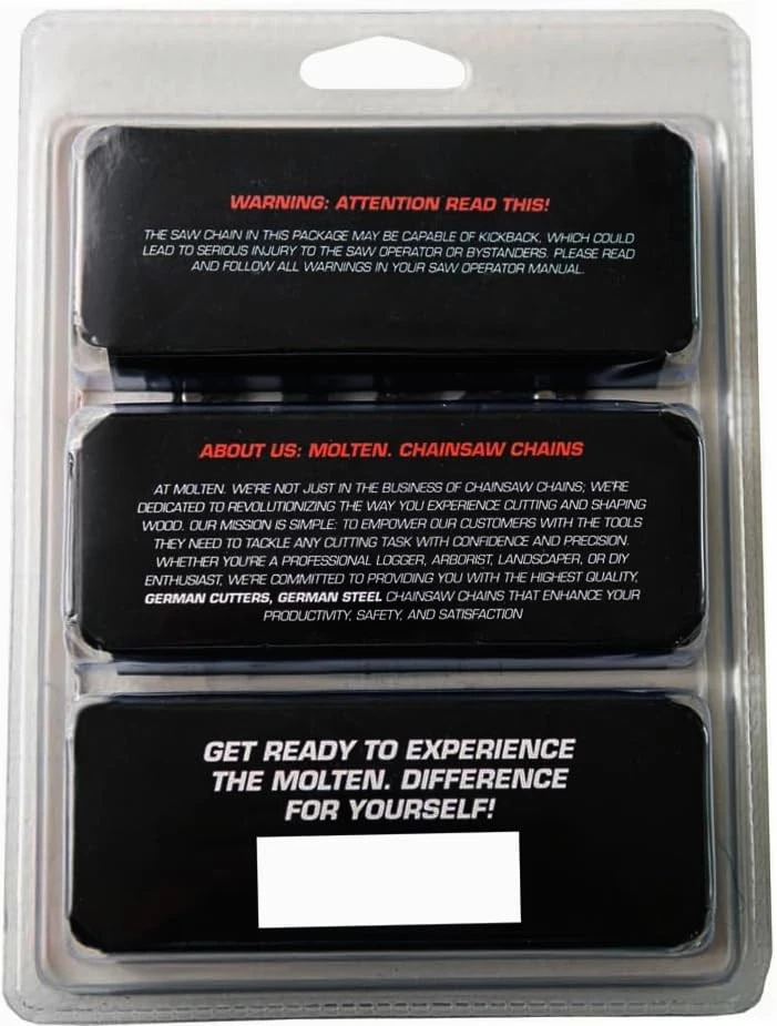 Molten. 10 Inch Chainsaw Chain Fits Milwaukee Pole Saw Chain, EGO, Ryobi 10 Inch Our Molten Chain replaces the following OEMs: Oregon 10 inch chain saw blade - 90PX040G, R40; Ryobi 10 Chainsaw Chain - 682115001, 693814001, RY10C1; Milwaukee Pole saw attachment - 49-16-2723; Makita 10 Chainsaw Chain - Makita E-02434; Powercare Y40 Chain Specs: Semi-Chisel; Chain Type: 90PX; Pitch: 3/8'' Low Profile; Gauge: .043''; Drive Links: 40; Bar Length: 10”; File Size: 4.5mm Compatible with Pole Saw models: Milwaukee M18 QUIK-LOK 49-16-2720, 2825-20PS, 2825-21PS ; Ryobi Expand It Pole Saw (RYPRN33 - Universal only) RY40290VNM, RYPRN33VNM, RY40270VNM, RY40230, RY40226; Ego 10 Inch Pole Saw Chain PSA1000, MPS1000 MPS1001 Compatible with following Chainsaw models: Worx Chainsaw 10 Inch Chainsaw Blade WG322, WG322.9, WG323, WG323.9; Ryobi Chainsaw Chain 10 inch - CS1800 18 Volt, P540, P540A, P540B, P542, P543, P545, P546, P547, P2520, RY40570 40v, Bauer 20V 19112C-B Our chain is compatible with the following Chainsaw models: Ryobi 18v Chainsaw Chain P2502; Black and Decker Chainsaw 20v LCS 1020; Makita Chainsaw Chain for XCU06Z, XCU06SM1 18V LXT; SENIX X2 20-volt Max 10-in Brushless CSX2-M1-0, CSX2-M-0 Our chain is compatible with the following Polesaw models: SKIL 40v PS4561C-10, PS4561C-00 PWR CORE 40-volt; Ryobi RY40051, RY40561, RY40770, RY40250, RY40560, RY41135 -- More Products will likelly fit out product, please ensure the chain specs above Please Verify Fitment and Drive Link Count Before Purchasing. Molten chains are made with OEM Quality with aftermarket prices! All of our Products are hand packed in America. Thank you for supporting our small owned family business! MoltenSales Chainsaw Chains are SO HOT they will melt through all your cutting needs. Please note these models are for the 10'' Bars, please check fitment and manual to ensure the chain fits your model! This chain replaces the following OEMs: Oregon: 90PX040G, R40 Husqvarna: H38-40 Stihl:, 61PMM340E TriLink: CL14340TL2 Chain Specs: Semi-Chisel Chain Type: 90PX Pitch: 3/8'' Low Profile Gauge: .043" Drive Links: 40 Bar Length: 10” File Size: 4.5mm Shipping We offer FREE shipping on all orders! We ship within Three business days of payment, usually sooner. We use a selection of shipping services such as UPS, FedEx, USPS etc. We only ship to the lower 48 states, no APO/FPO addresses or PO Boxes allowed. Local pickups and combined shipping options are not provided at this time. Return You can return a product for up to 30 days from the date you purchased it. Any product you return must be in the same condition you received it and in the original packaging. Please keep the receipt. Payment We accept payment by any of the following methods: PayPal Please pay as soon as possible after winning an auction, as that will allow us to post your item to you sooner! Feedback Customer satisfaction is very important to us. If you have any problem with your order, please contact us and we will do our best to make you satisfied. Contact Us If you have any queries, please contact us via ebay. We usually respond within 24 hours on weekdays. Please visit our eBay store to check out other items for sale! Thank you for shopping at our store.