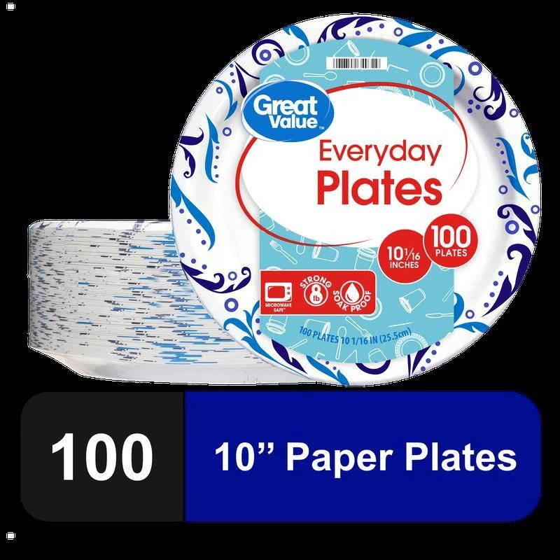 You may also like Disposable Paper Plates 10Inch 150Ct Strong Soak Proof Microwave Safe Party Use 19.41 USD Free shipping Serve food with ease using Great Value Everyday Plates. They're perfect for everyday use or for special occasions. These plates are extra-strong making them ready for whatever meal you make. Use these plates at your next barbecue, birthday party, while you're watching the game, at your next pool party, or any get-together. Their 10-inch size makes them suitable for barbecue dishes, snacks, dinner, lunch, desserts, and more. They're also soak-proof, microwave safe, and offer quick and easy disposal and clean-up for when the party is over. This package comes with 100 pleasantly decorated plates making it easy to stock up for any occasion. Easily serve food when you use Great Value Everyday Plates. Great Value products provide families with affordable, high-quality grocery and household consumable options. With our wide range of product categories spanning grocery and household consumables, we offer you a variety of products for your family's needs. Great Value Everyday Strong, Soak Proof, Microwave Safe, Disposable Paper Plates, 10 in, Patterned, 100 Count: Strong and durable Soak proof Microwave safe Convenient way to serve meals or snacks Ideal for everyday use or special occasions 10" diameter Count: 100 White with Pattern