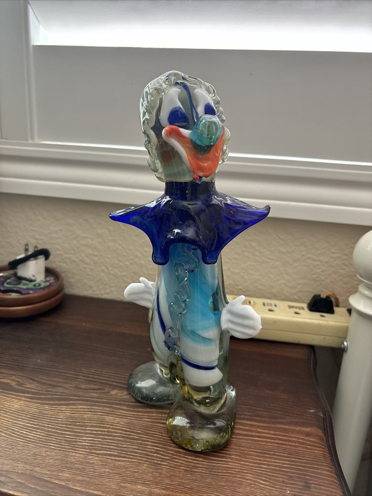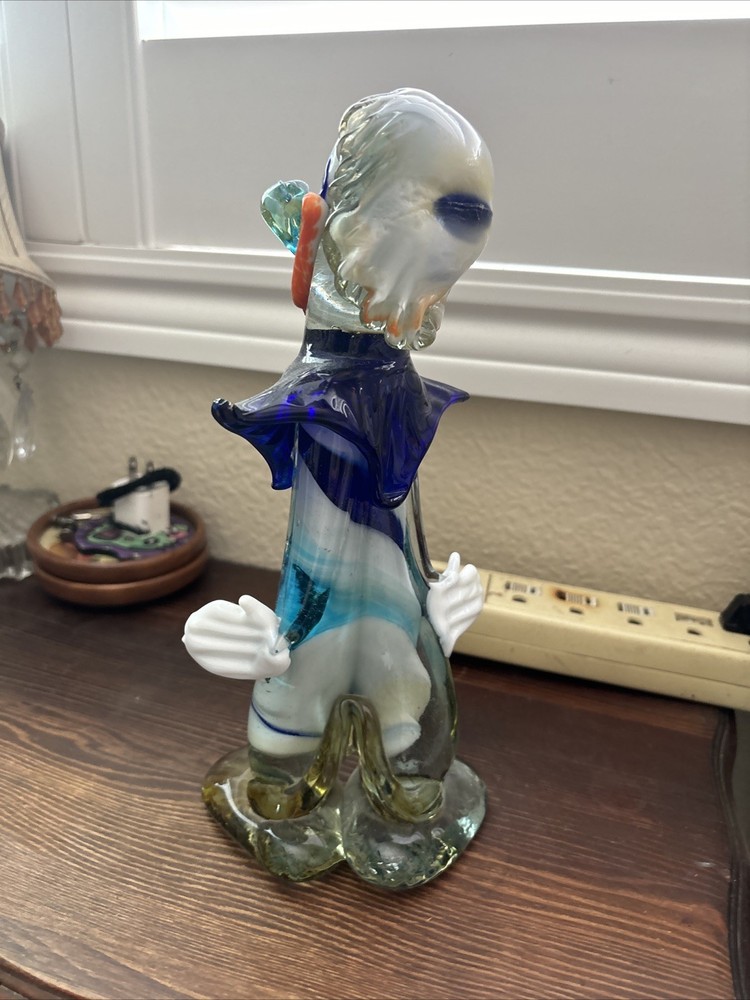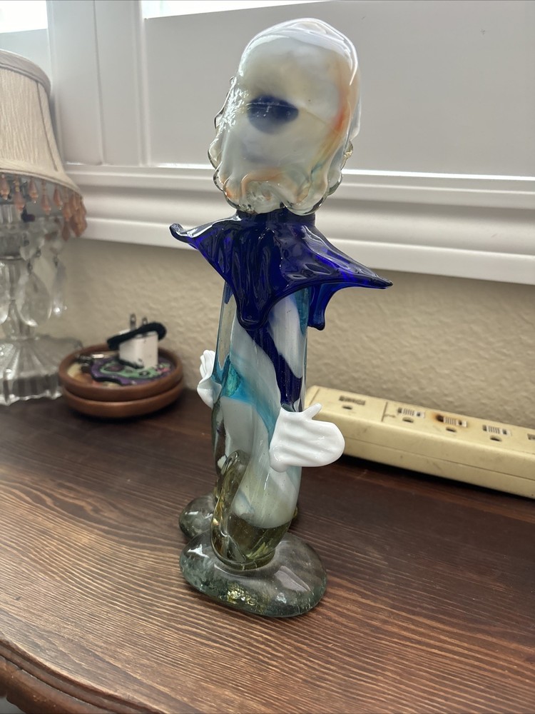 White hair Blue eyes Orange smile Blue tie Elevate your space with a touch of whimsy with this hand-blown glass clown figurine. Standing at an eye-catching 10 inches tall, it features vibrant multicolored hues complemented by a glossy finish, which captures the light to highlight its intricate details. Its striking blue eyes and friendly orange smile bring a playful yet endearing charm to any room. Crafted with meticulous care, this decorative piece hails from a tradition of art glass excellence, and as a vintage original, it carries the essence of a bygone era. The figurine's high-quality glass material and handmade origin assure you of a unique treasure that's both visually engaging and a testament to artisanal skill.