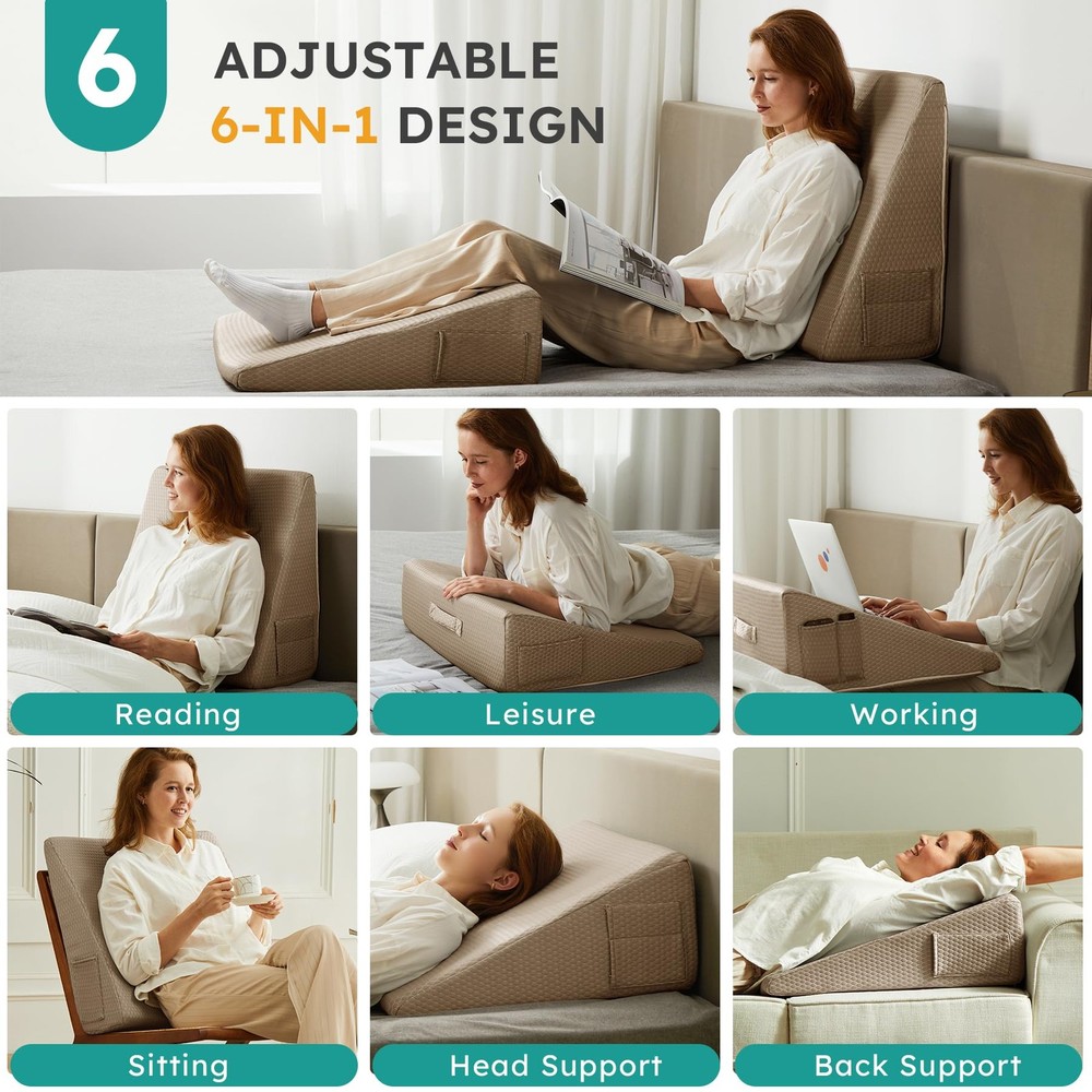 Wedge Pillow for Sleeping, Bed Wedge Pillow, Body Pillow for Back Support, Leg Elevation, Gerd Acid Reflux, Neck Pain, Snoring, Triangle Pillow Wedge - Cooling Memory Foam Top, Removable Washable Cover Versatile wedge pillow design provides superior comfort and support for sleeping, reading, sitting up in bed Features cooling gel-infused memory foam top layer and high-density premium foam base for comfort and support Breathable, removable and machine washable cover allows airflow and easy cleaning Built-in pockets to store items; Portable handle for easy transport. Upgraded foam meets CertiPUR-US and Oeko-Tex standards for durability and safety