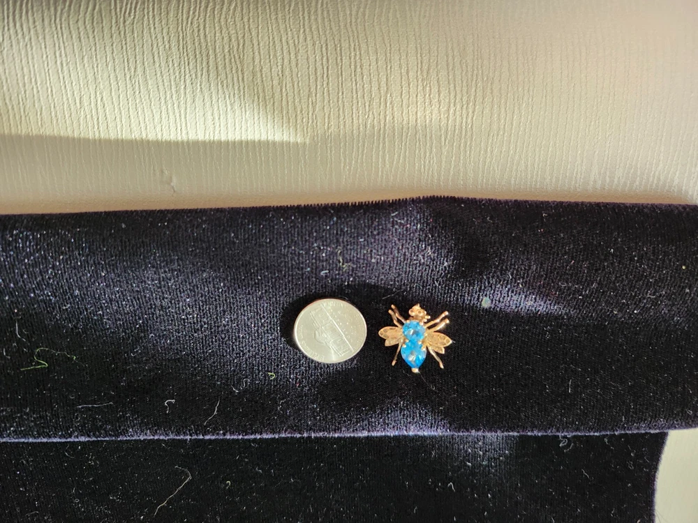 The product is a 10K yellow gold bug pin or brooch with blue sapphire eyes. This insect-style piece of fine jewelry features a vibrant blue color scheme, with the blue sapphire stones adding a touch of elegance and charm to the design. The use of yellow gold as the base metal further enhances the luxury appeal of this unique and eye-catching accessory.