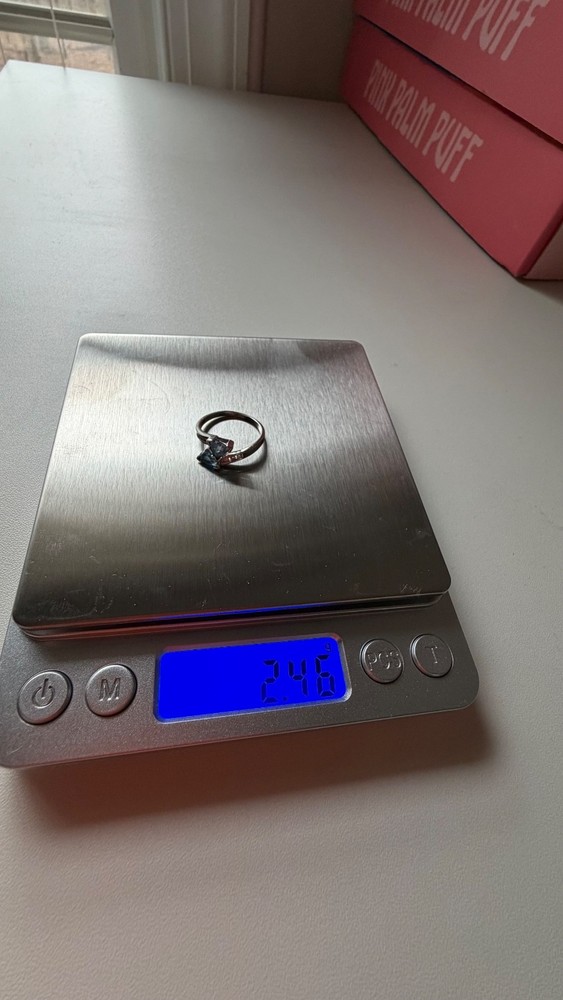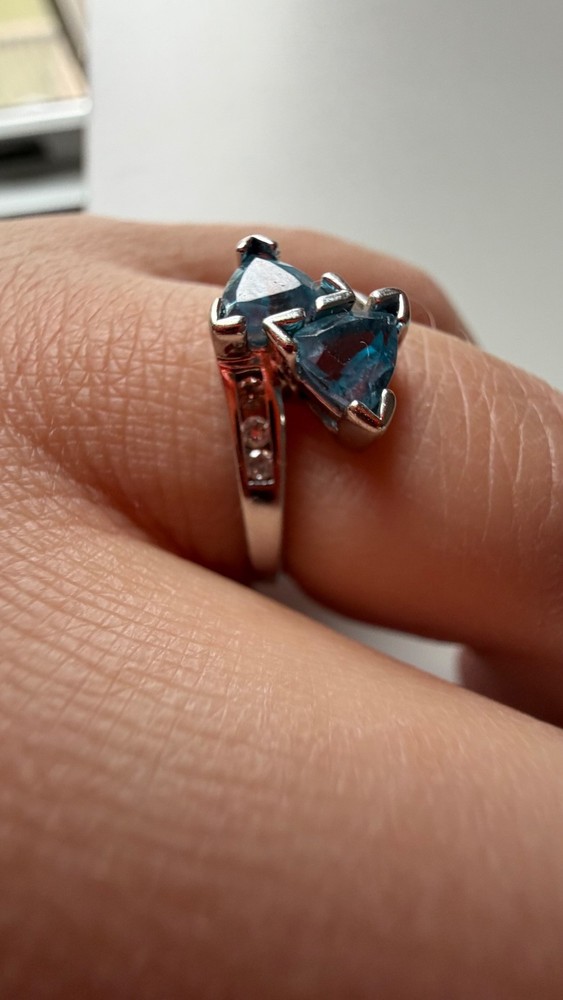 Description: Ring size approximately 7 used an app not 100% sure Beautiful and eye-catching 10K white gold ring featuring two stunning trillion-cut blue topaz stones set in an elegant crossover design. The bright blue gemstones sparkle beautifully and are accented by small diamonds along the band, adding extra brilliance and sophistication. The unique double-stone design gives the ring a modern yet timeless look, making it perfect for everyday wear or special occasions. Details: • Metal: Solid 10K White Gold (stamped) • Total Weight: 2.46 grams • Gemstones: Blue Topaz (trillion cut) • Accent Stones: Diamonds on the band • Style: Two-stone crossover ring • Condition: Very good pre-owned condition A gorgeous piece that stands out with its vibrant color and elegant design. Perfect gift or addition to any jewelry collection.