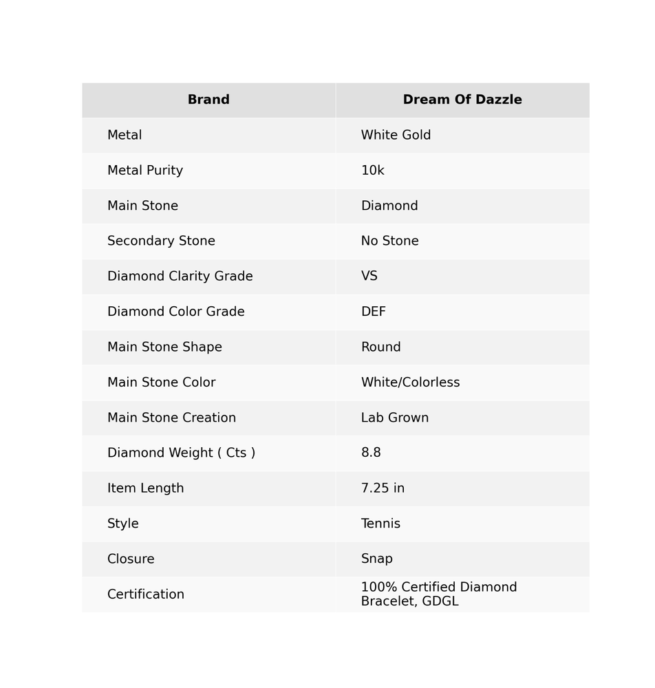 Elevate your accessory collection with the dreamofdazzle_usa Diamond Tennis Bracelet, a timeless piece that exudes sophistication and grace. Crafted in lustrous white gold and showcasing a radiant array of lab-grown diamonds, this bracelet is a testament to both beauty and craftsmanship. Each meticulously set diamond, boasting a round shape and exceptional cut grade, catches the light to create a dazzling display. The bracelet's versatile design makes it an ideal choice for various occasions, whether it's an anniversary, birthday, or holiday. With its 7.25-inch length, it sits comfortably on the wrist, secured by a snap closure for ease of wear. The piece is also nickel-free and engraved with attention to detail, ensuring that it is as comfortable as it is stunning. Certified by GDGL, this bracelet is a symbol of love and a celebration of timeless style. ------------------------------------------ Welcome to Our Shop dreamofdazzle_usa ------------------------------------------ Mothers day Sale 10K White Gold Round Lab Grown Diamond Tennis Bracelet Jewelry SKU:- RJ 208 Metal:- White Gold Metal Purity:- 10k Stone:- Diamond Stone Color:- White Stone Shape :- Round Stone Creation :- Lab Grown Diamond Weight :- 8.8 Cts Side Stone Weight :- Cts Stone Setting :- Prong Bracelet Length:- 7.25 Inches Bracelet Width:- Inches ♥ ♥HANDCRAFTED JEWELRY WITH A PERSONAL TOUCH♥ ♥ Discover jewelry that speaks to your heart. At dreamofdazzle_usa, we create beautifully handcrafted pieces that are hypoallergenic, nickel-free, and lead-free, ensuring comfort for all skin types. Customize your jewelry with birthstones and gemstones to make each piece uniquely yours—whether you prefer delicate hearts, celestial stars, or sleek minimalist designs. ♥ ♥A MEANINGFUL GIFT FOR EVERY OCCASION♥ ♥ Celebrate life’s special moments with a gift that lasts a lifetime. Whether it’s a birthday, anniversary, wedding, engagement, or holiday, our jewelry symbolizes love, appreciation, and elegance. Surprise your loved ones—be it your mother on Mother’s Day, your partner on Valentine’s Day, or a dear friend for Christmas—with a keepsake they’ll cherish forever. ♥ ♥ELEGANCE FOR EVERYDAY & SPECIAL MOMENTS♥ ♥ Designed for versatility, our collection seamlessly blends sophistication with everyday wear. Whether you're dressing up for an event or adding a subtle sparkle to your daily look, our timeless jewelry makes the perfect finishing touch. It also makes an ideal stocking stuffer or thoughtful gift during the holiday season. ♥ ♥BEAUTIFULLY PACKAGED & READY TO GIFT♥ ♥ Every piece is crafted with care and arrives in a beautifully designed jewelry box, making gifting effortless. Whether for your wife, fiancée, girlfriend, mother, sister, or best friend, let our jewelry be a heartfelt expression of your love and appreciation. ♥ ♥QUALITY, AUTHENTICITY & CRAFTSMANSHIP♥ ♥ - True-to-Life Photography :- We capture our jewelry in natural light, so you get exactly what you see—authentic, detailed, and of the highest quality. - Handcrafted Perfection :- Every piece is meticulously made with **premium materials and expert craftsmanship**, ensuring durability and timeless beauty. ♥ ♥RELIABLE SHIPPING & CUSTOMER CARE♥ ♥ - Standard shipping :- 15-25 days (varies by location). - Expedited shipping :- Available at an additional cost. - We work with trusted carriers to ensure your order arrives securely and on time. Your satisfaction is our top priority. If you have any questions or concerns, please don’t hesitate to reach out—we’re dedicated to providing exceptional customer service and ensuring a seamless shopping experience. ♥ ♥CUSTOM & WHOLESALE ORDERS WELCOME♥ ♥ Looking for a one-of-a-kind design? We accept **custom and wholesale orders worldwide**! A 50% advance payment is required for personalized pieces. Contact us with your vision—we’d love to bring it to life! ♥ ♥Experience the artistry of handcrafted gemstone jewelry with dreamofdazzle_usa where every piece tells a story.♥ ♥ Visit us at: https://www.ebay.com/str/dreamofdazzleusa ♥ Thank you for choosing us ♥ dreamofdazzle_usa