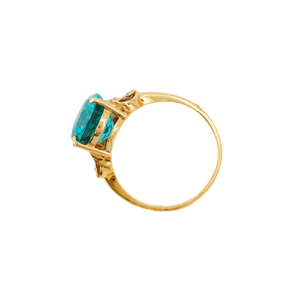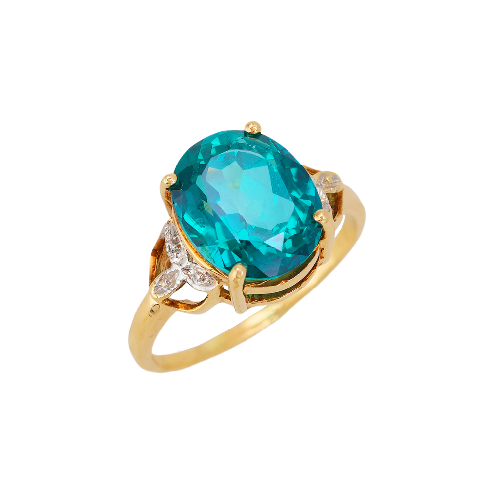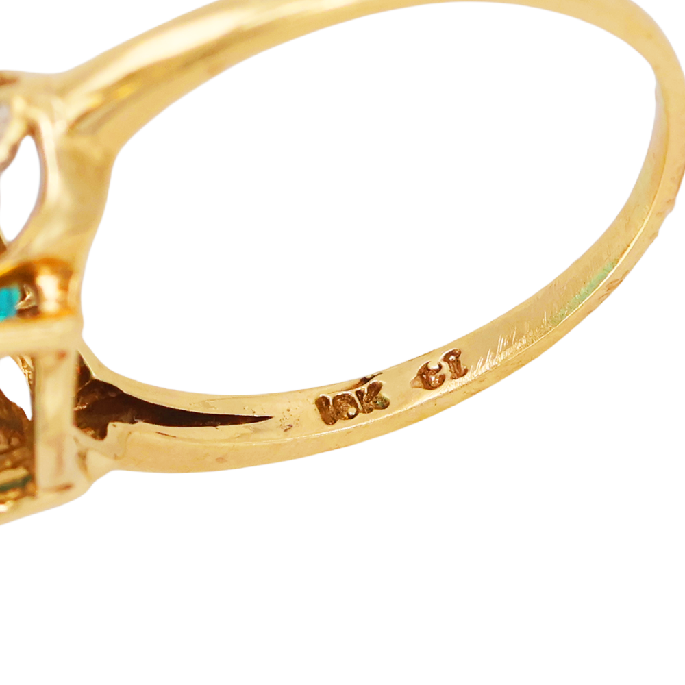 This striking 10K yellow gold ring showcases a vibrant teal blue oval cut sapphire that immediately draws attention with its rich color and brilliant faceting. The gemstone is beautifully framed by elegant white gold shoulder accents featuring a delicate cutout leaf motif with bead detailing, adding dimension and contrast to the warm yellow gold setting. The graceful openwork shoulders create a refined and eye-catching design that enhances the presence of the center stone while maintaining a balanced and sophisticated look. This piece has been professionally tested and certified as 10k gold, and the inside of the band is marked “10K - CI." Measurements: • Ring size: apx. 8 • Band width: apx. 1.3mm • Sapphire size: apx. 10mm x 12mm • Total weight: apx. 3.55 grams Why Buyers Love This Style: • Large vibrant teal blue sapphire centerpiece • Elegant two tone gold design with white gold accents • Nature inspired leaf or floral shoulder motif • Classic oval gemstone cocktail style • Eye catching statement ring with refined detail teal blue sapphire ring oval sapphire ring 10k gold gemstone ring sapphire cocktail ring oval blue sapphire statement ring teal gemstone ring vintage style sapphire ring nature motif ring floral accent ring gold sapphire jewelry size 8 gemstone ring Item #2343