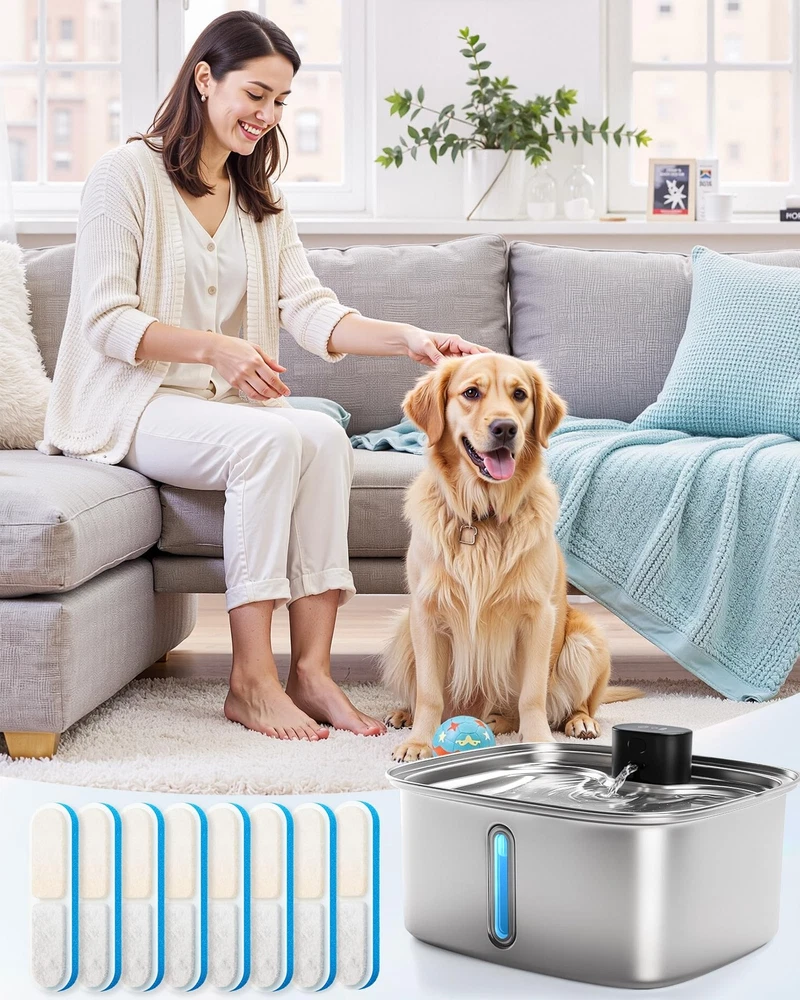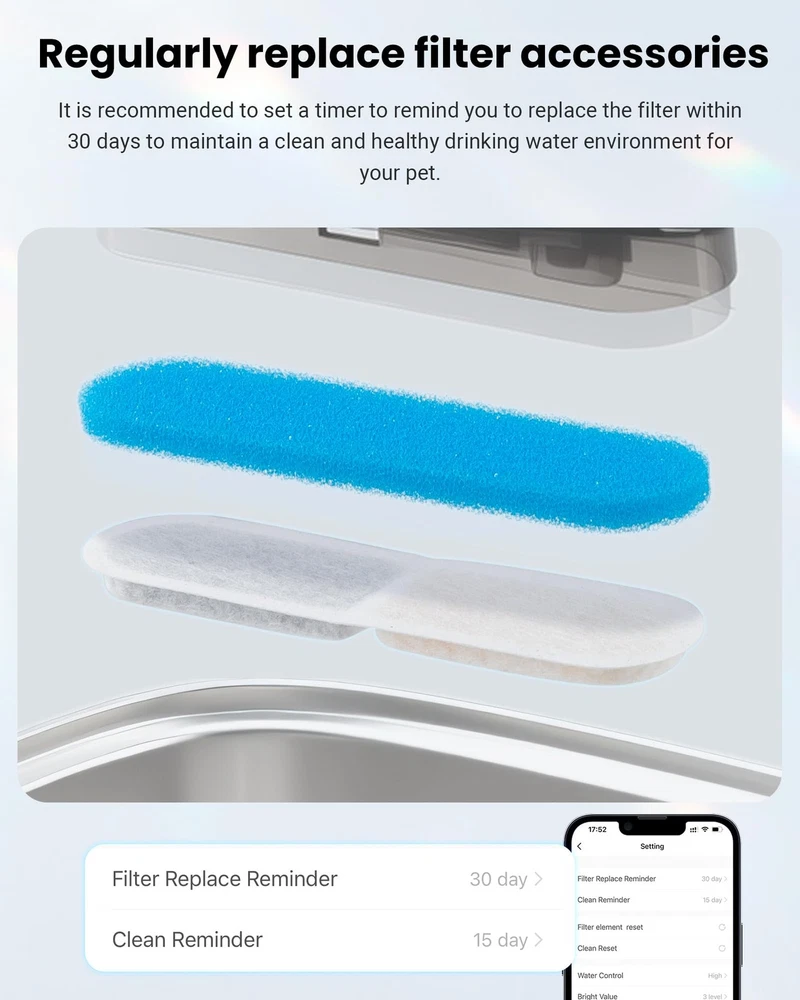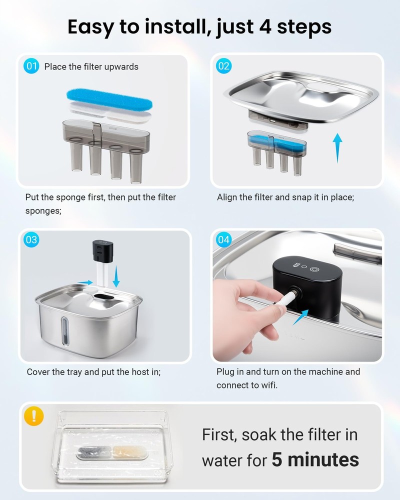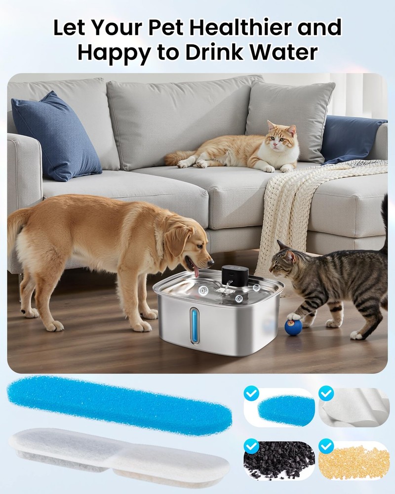 Product information Product Name: Smart Pet Water Fountain Product Material: 304 Stainless Steel + ABS Maximum Capacity: 10L/338 Oz Packaging Weight: 4.52 Pounds Packaging Size: 342*290*165mm Input Voltage: 100-240V, 50/60Hz Output Voltage: 5.0V/1.0A Filter Material: Filter Cotton + Activated Carbon + Ion Exchange Resin Filter element cycle:l month 10L Large Capacity & Smart APP Control: Stay Informed, Anywhere. Made with 304 food-grade stainless steel, this large dog fountain water bowl requires less refilling. Use the app to monitor water status, control InfraFlow mode or Interval mode remotely, and receive real-time hydration alerts for your pet. Advanced Safety with PumpFree Tech: PumeFree, No Burn Risk.The water-electricity separation design ensures pet safety. When the automatic dog water dispenser runs dry, power shuts off automatically to prevent overheating by the Anti-Dry Guard. A 360°visible window lets you easily check the water level. Tri-Pure Multi-Layer Filtration: Every Sip Is Fresh and Clean. The large dog water fountain equipped with sponge, non-woven fabric, activated carbon, and ion exchange resin layers, this large cat water fountain stainless steel filters out hair, dust, and impurities for safe, clean water every time. 3-Step Quick Clean Design: Easy Maintenance, Less Hassle. Easily disassemble the pump, filter box, and filter for hand washing. No tools needed. Note: Wipe the dog water bowl pump instead of rinsing directly to maintain performance. Dual Power Supply: Plug-In or Battery Backup for Peace of Mind in indoor and outdoor scene. Use plug-in mode for daily use and switch to battery mode (up to 30 days standby) during outages. The dog water fountain for large dogs WiFi auto-disables below 35% battery to save power - ensuring your pet always has access to water. Quiet Operation & Dedicated Support: Sleep Soundly, Worry-Free. This pet fountain keeps your home peaceful. Plus, enjoy responsive support from our expert team for any product inquiries. All-In-One Accessory Kit: Includes dog water dispenser*1, charging cable set*1, user manual*1, filter set *1 and cleaning brush*1—ready to use right out of the box.