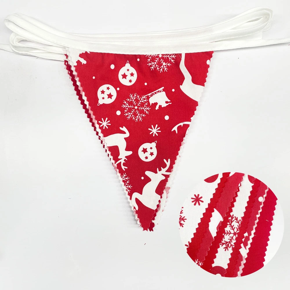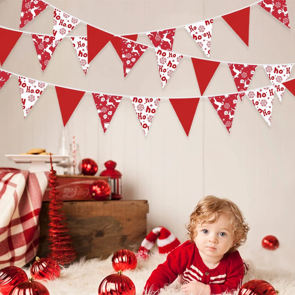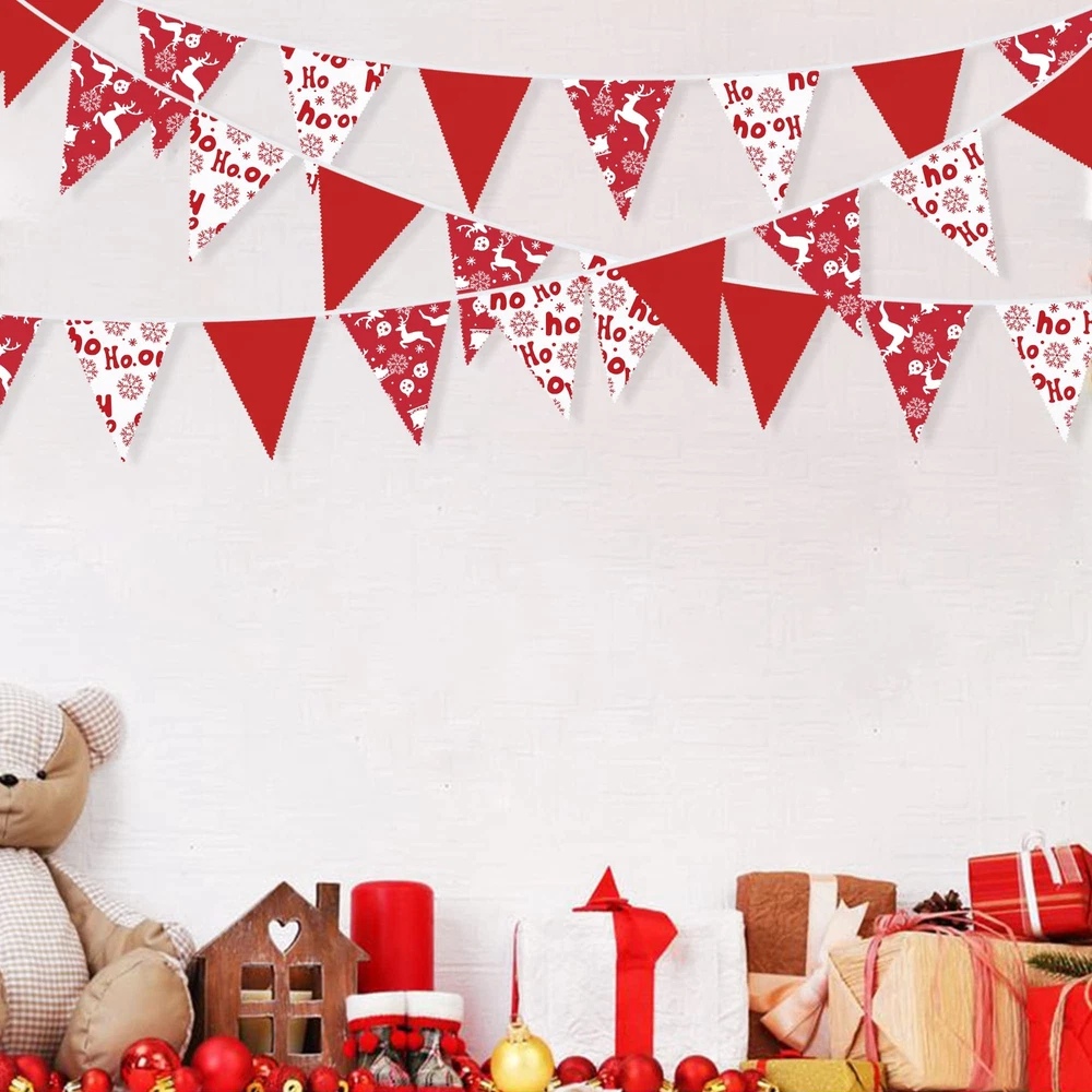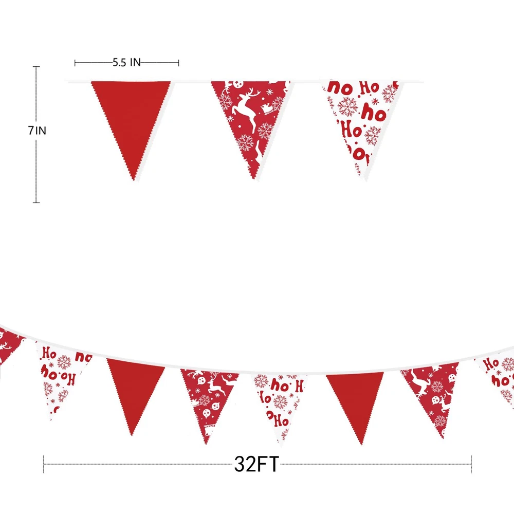 Package Including:1 pack hohoho fabric bunting banner garland in red and white colors with rich christmas elements printed(like snowflakes, reindeers) with 36pcs flags in 10M/32.8Feet. Flag Size: 7.4in width x 8.3in height. Material: Our classic red & white chrsitams Longlife-Hand-Made pennant banner made of strong weatherproof cotton. Washable and reusable for many times, soft and comfortable touch. Easy Using: The red christmas hanging decoration party banners are very easy to hang and decorate both inside and outside, like home, wall, bedroom, dining room, ceiling, fireplace, window, garden, branches, fences, restaurants, bars X-Mas Party Choice: These red and white christmas triangle flags are good ideal for any kind of celebration, party, festival, events or other occasion. It can be used by both kids and adults. Like Christmas Day,x-mas eve,hohoho party, carnivals,picnic,engagement,hen party,bridal shower,bachelorette,retirement,night party, wedding, birthday, anniversary,holiday party,Valentine day,festival,new year's eve decorations, baby shower, nursery christening, family gatherings, outdoor activities ,etc Customer Service: We provide 48-day money-back and 24-month warranty. So feel free to contact us if you have any question with our red white christmas fabric triangle flags banner.