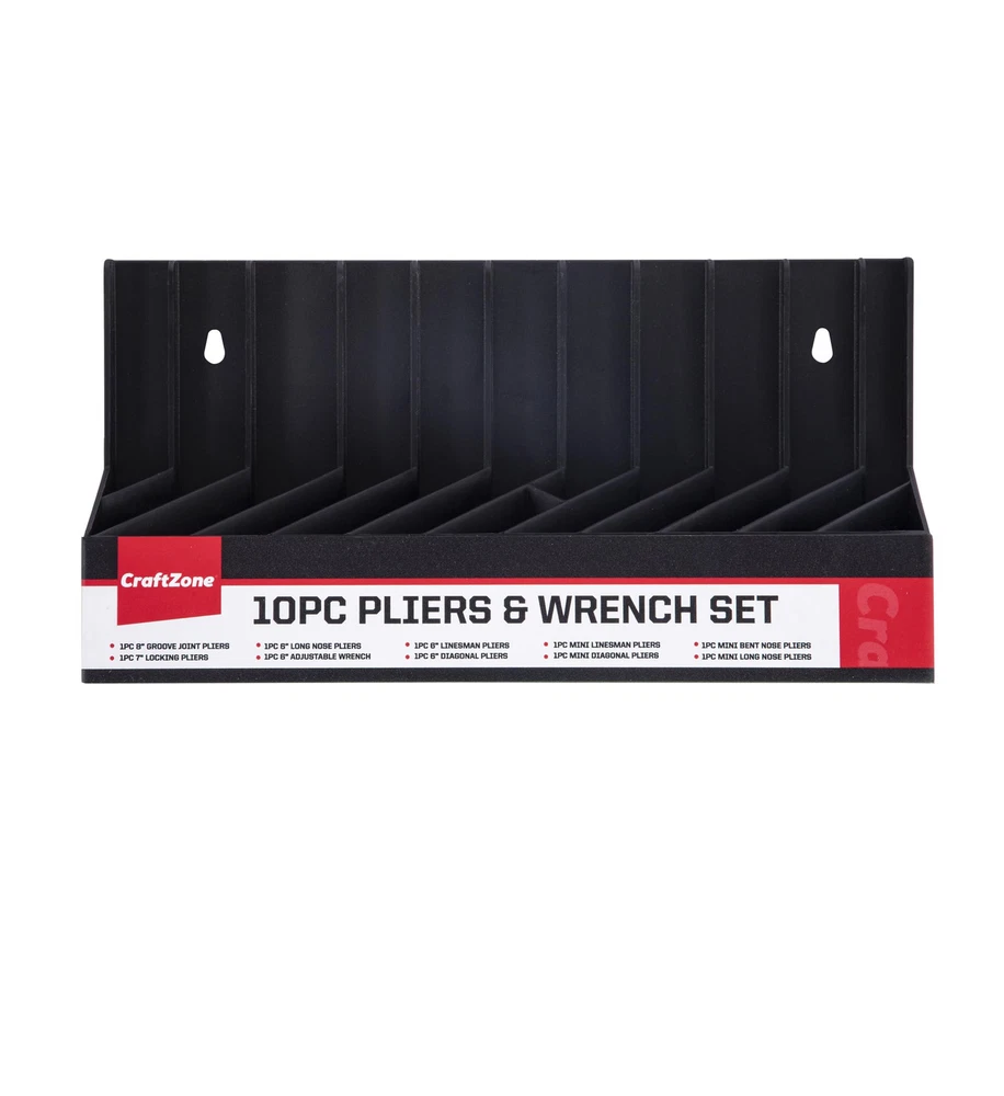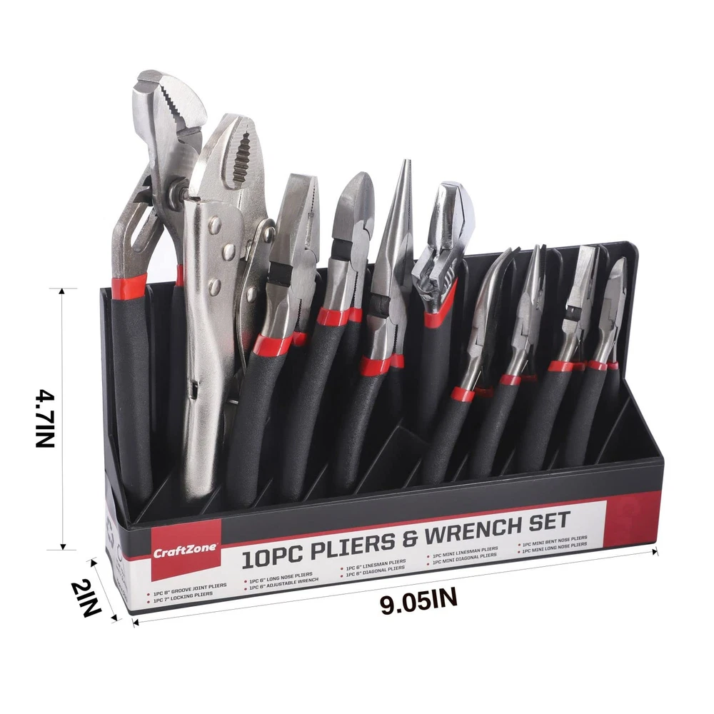 [DROP FORGED POLISHED STEEL] Durable alloy steel construction forged with a heat treatment to ensure reliable, long-lasting strength. [EASY TO ] Handy storage rack is made of durable ABS plastic. [COMFORT GRIP HANDLE] Double-dipped coating to ensure safe and secure non-slip handling. [CONVENIENT USE]Nine basic type pliers and adjustable wrench in multiple sizes for use on almost any object. [INCLUDE] Locking Pliers, Long Nose Pliers, Diagonal Pliers, Groove Joint Pliers, Linesman Pliers , mini pliers and Adjustable Wrench. [SERVICE] If you have any problem with our tool set or are not satisfied with the product, please feel free to us, we will do our best to serve you.