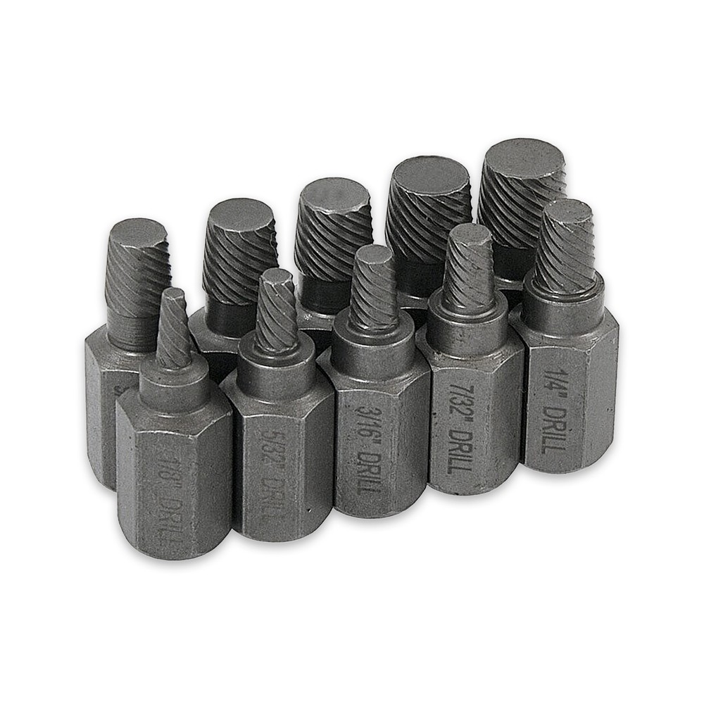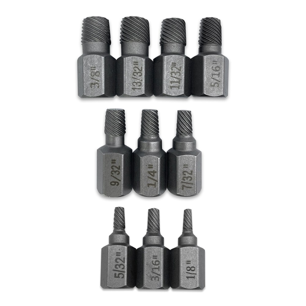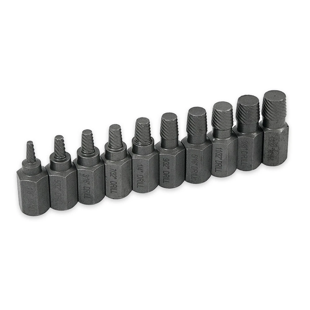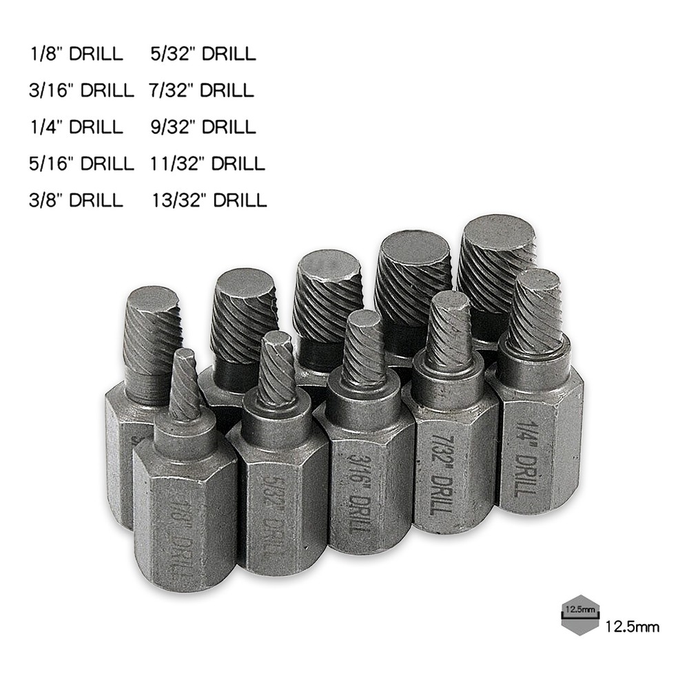 10pcs Screw Extractor Drill Bits Broken Damaged Bolt Stud Remover Set Description 10pcs Multi-Spline Screw Extractor Set For removing broken studs / pipes and screws. Also Alemite grease nipples and fittings. Can be used with a 13mm socket or wrench Sizes: 1/8 | 5/32 | 3/16 | 7/32 | 1/4 | 9/32 | 5/16 | 11/32 | 3/8 | 13/32in. Package: 1X Screw Extractor Set