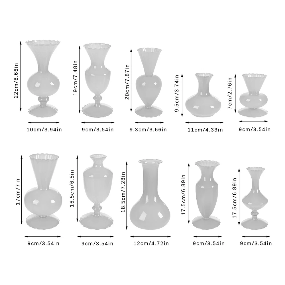 10PCS Glass Vases for Wedding and home Decorations, Small Glass Vases Sets Description Weddings, graduations, birthdays, etc. are all memorable events in our lives that will become our precious treasures. With this glass vases set, your wedding and other important events will be even more wonderful. Our vases are made of premium glass, so they can be used for a long time and accompany you through various stages. 10 different styles in sufficient quantity can meet your home decorating needs, adding a touch of elegance and beauty to your home. Key Features Build to Last: High-quality glass makes the product durable and solid, so it remains beautiful and practical for a longer time. Strong Stability: The solid material, reasonable structure, and stable base provide this item with a strong bearing capacity, so you can use it safely without worrying about the fracture. Diverse Styles: The 10 different shapes, sizes, and styles enrich your visual experience, create a personalized background, add brightness to a dull event, and become good home decoration. Wherever it is placed, it is a beautiful scenery. Nice Decorations: You can place this product at the top of the booth as an excellent decoration for special days, creating an elegant atmosphere, especially for weddings. You can also put it on the table to relax your mood. Even if it hasn’t artificial flowers on it, it is still a very elegant decoration! High Cost-effective: 10 Pcs allow you to use different items, such as flowers, artificial flowers, and vines, on other occasions to decorate them freely and repeatedly, promoting the unity of style and fully meeting your needs. Labor-saving Cleaning: The smooth surface and simple structure make it convenient for you to clean with a wet towel and water. Easy to Carry and Store: Its small size and lightweight(4.41 lbs) make it easy for you to store and carry them anywhere. Ideal Gift: With an attractive appearance, this product is used as a gift for family, friends, and lovers to make their home more atmospheric and festivals more meaningful. Protective Package: To prevent the product from being damaged and bumped during transportation, we packed it with foam and cartons to protect your products to the maximum extent possible. Details Round Corners: Compared with traditional square corners, an arc design can better care for your skin. Flared Mouth: The flared mouth of the vase is not only aesthetically pleasing but also makes it easier for you to insert flowers, artificial flowers, and other decorations. Application Match with artificial flowers and other items, this product can be used in homes, restaurants, terraces, coffee shops, hotels, balconies, bars, clubs, Spa, candlelight dinners, holiday dinners, weddings, the background decoration of the studio, as well as any other special activities you would like to decorate. Specification Color: White Style: Modern Material: Glass Assembly Required: No Mount Type: Free Standing Number of Items: 10 Product Size(D*H): 11*9.5cm/4.33*3.74in, 9*17cm/3.54*6.69in, 9*16.5cm/3.54*6.5in, 9*17.5cm/3.54*6.89in, 9*17.5cm/3.54*6.89in, 9*7cm/3.54*2.76in, 12*18.5cm/4.72*7.28in, 9*19cm/3.54*7.48in, 9.3*20cm/3.66*7.87in, 10*22cm/3.94*8.66in Net Weight: 2kg/4.41lbs Gross Weight: 2.3kg/5.07lbs Package Size: 55*45*15.5cm/21.65*17.72*6.1in Package Included 10* Glass Vases Notes Please note that flowers and other decorations are not included. Please use a soft cloth to clean and dry it. Please do not use harsh chemicals or abrasives. It is better to add some rocks or floral foam to the inside to make the item more stable. For better results, we recommend using a small bouquet. Please pay attention to the size details, it may be smaller than you expect. Please check the size of our vases before purchasing a bouquet to prevent buying a larger or smaller bouquet. Please allow the slight color difference caused by the shooting light and 1-3 cm error due to manual measurement, and make sure you do not mind before ordering. Payment Delivery details Terms of sales About us Contact us Payment We accept ebay payment 。 Fees such as import duties, taxes are not included in the item price or shipping costs. These charges are the buyer's responsibility. Delivery details Shipping: 2-9 working days to: USA Terms of sales We maintain high standards of excellence and strive for hundred percent customer satisfaction. Feedback is very important to us. We hope that you contact us immediately before you give neutral or negative feedback, so that we can address your concerns. It is impossible to address issues if we do not know about them! About us Your satis faction is our ultimate goal. We work hard to earn your trust and future business. Our certified technicians have tested each item before shipping. The unit comes with 1 year limited warranty on all manufacturing defects. a) If you receive a defective item, you may return it or ask for a discount. Please contact us within 14 days after you receive the package. b) What you returned must be intact and in its original packaging as re? u. Customer is responsible for shipping costs of the returned item. c) We will cover the cost of shipping back t with the shipping rate indicated in the registration page. We will send you a new unit or refund the full payment you paid. Thank you. Contact us Business Hour Business Hour: Monday To Friday: 8:30 AM to 5:00 PM (Beijing China time) Due to time zones, our reply to your questions may not be immediately. But within above working time, we will reply your email within 24 hours. If it's non-workdays, please kindly be patient and wait till Monday. Please contact us with ebay message. Please feel free to contact us if you have any questions. Monday To Friday: 8:30 AM to 5:00 PM (Beijing China time) Due to time zones, our reply to your questions may not be immediately. But within above working time, we will reply your email within 24 hours. If it's non-workdays, please kindly be patient and wait till 