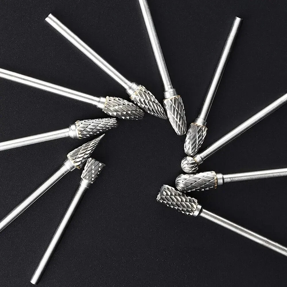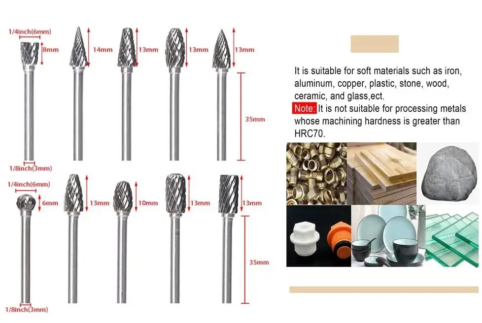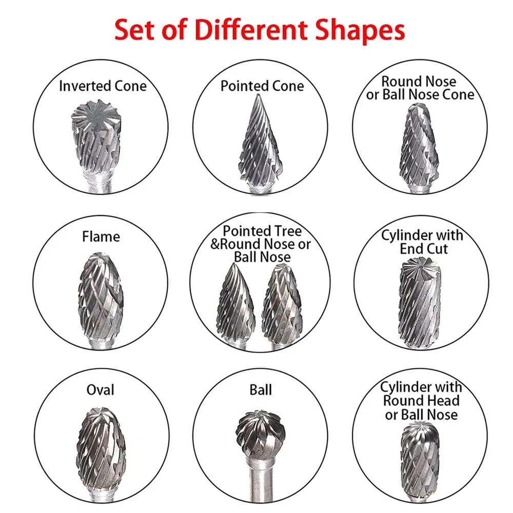 Tungsten Carbide Rotary Burr 10pcs Carving Burr Bits Double Diamond Cut Dremel Tools for Wood Stone Carving Steel Metal Working Product Highlights: 【CARBIDE DIE GRINDER BITS】: These carbide rotary burr set, with 1/8'' shank is made from Tungsten Carbide. Total Length:45-50mm, Cutting Diameter 1/4'', Shank Length 35mm, Shank Diameter 1/8''. 【DOUBLE CUT DESIGN】: The groove lines of these carbide rotary burr's head are crossed, which makes it more suitable for materials with relatively low density, such as wooden, plastic and aluminum. 【ADAPTABILITY】: 1/8” shank fits dremel and most small rotary tools with three jaw chuck for accurate centering. An ideal choice for your DIY woodworking, carving, engraving, and polishing. 【LONG WORKING LIFE】: Packed with plastic storage case for safety storage and protection. The working life of these solid rotary burr is 10 times longer than high-speed steel and 200 times longer than grinding wheel.