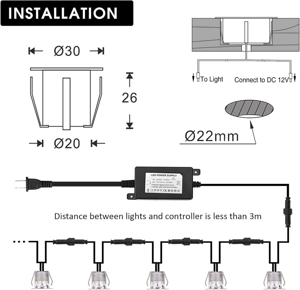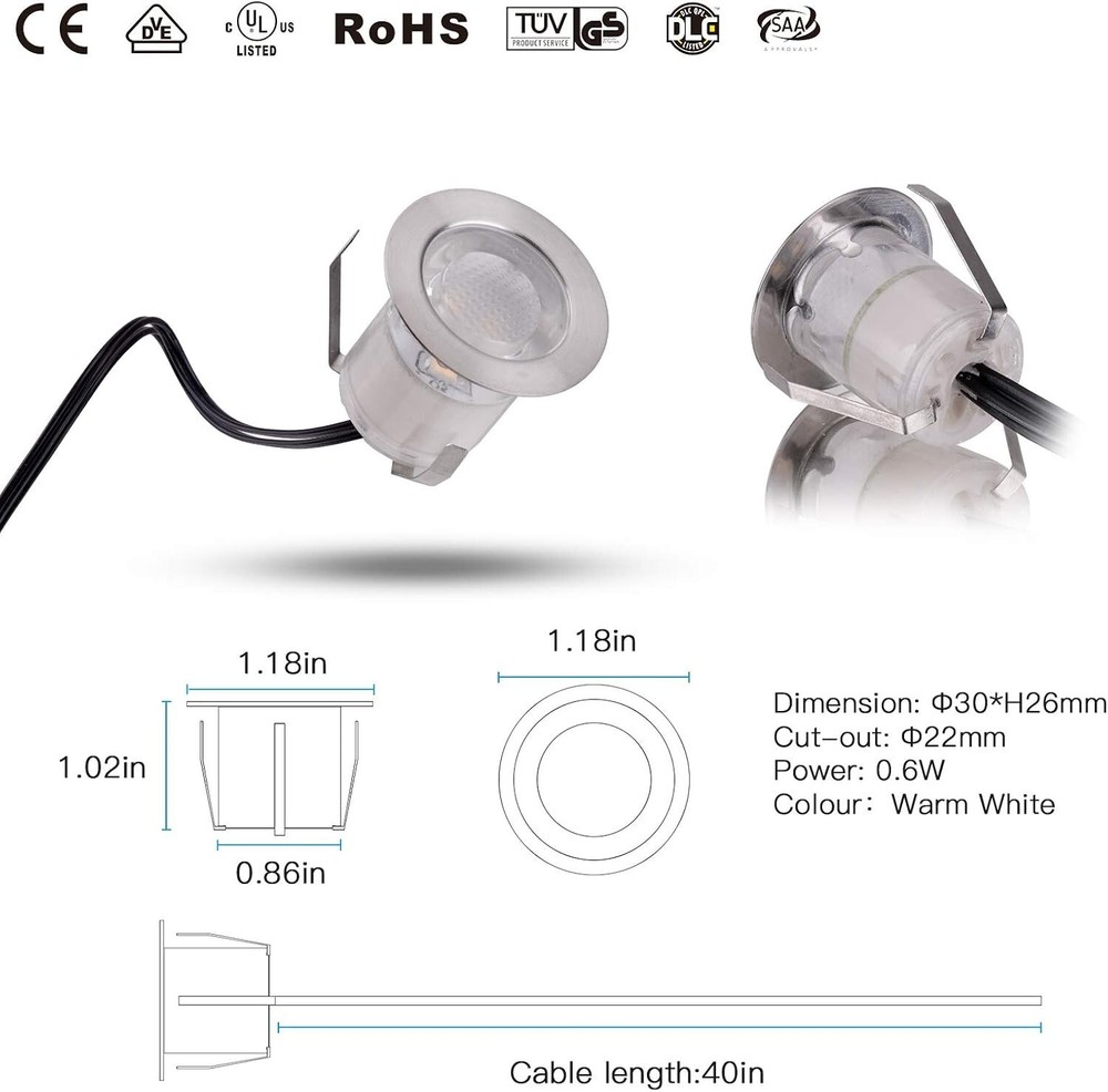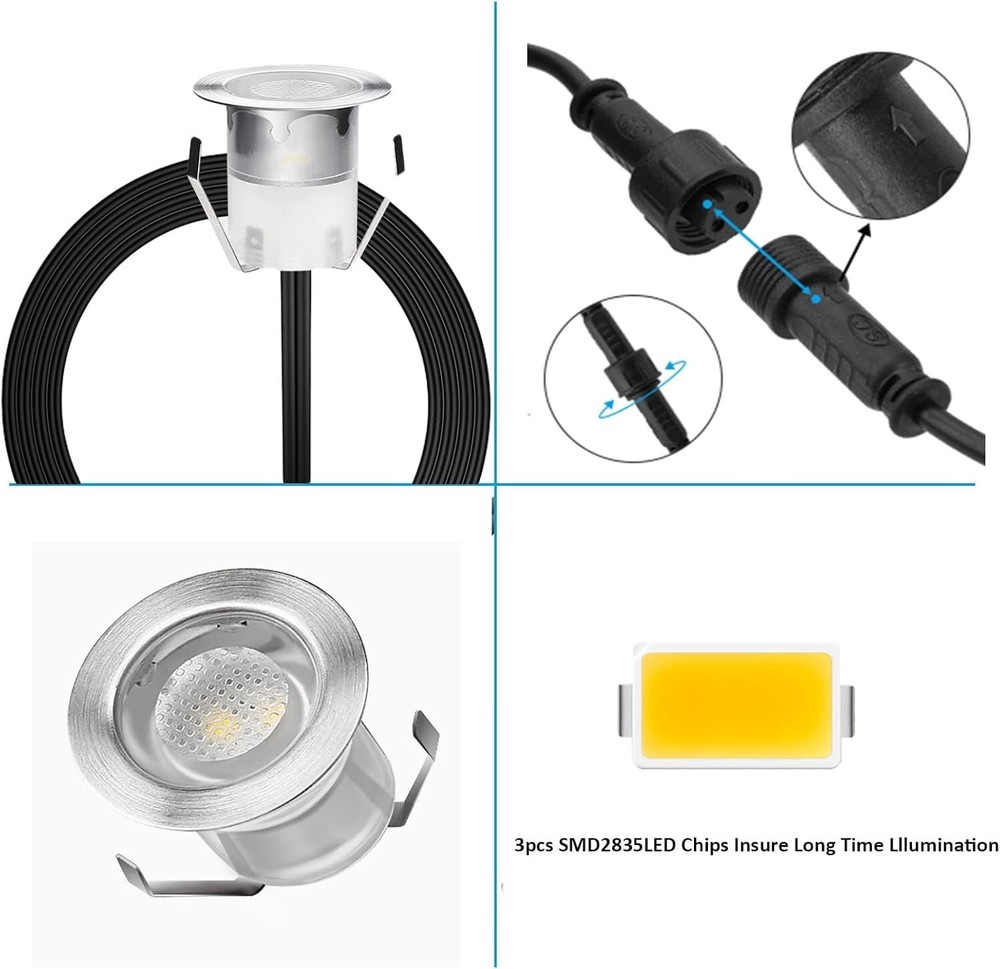 LED Deck Lights Kit, 10pack Φ1.18 IP67 Waterproof 12V Low Voltage Recessed Step Stair Warm White LED Lighting for Yard, Garden, Entryways, Basement 【Special Design and Wide Application】LED deck light Size: Φ1.18" x H1.02"/ Mount Hole Size: Φ0.87". with 4.92ft power cable, and max distance between 2 Lights is 3.28 ft. Widely used in stair, landscape bathrooms, garden path, patio, yard and deck, warm and soft light relax your mood. 【Warm and Soft Light】 CONITAR recessed lighting has warm white LED beads, which makes you feel sweet and comfortable. Warm and soft Light can create a gorgeous atmosphere in your outdoor living space day after day, it is ideal to guarantee the safety at night and Illuminate your way home. 【Waterproof and Perdurable】Waterproof and Perdurable:IP67 waterproof design, which greatly improves the stability of outdoor lighting and long-term use. Work with low voltage DC 12V power supply, bright enough and environment friendly. Made of high quality Acrylic/ABS and 304 stainless steel. Shatter resistant, life span 50,000 hours which means it can be used 10 years based on 8 hours/day, it will reduce re-lamp frequency and costs. 【Easy to Install】The LED stairs lights are detachable and in parallel connection, you can only install part of them according to your need. Simply drill holes, push lights in right place and connect cables. It can be installed anywhere you can drill a hole.