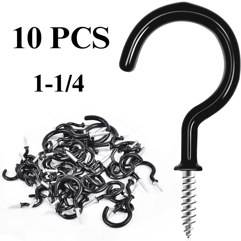 About This Item Effortless Installation Designed for easy use, these screw hooks can be installed with one hand. For tougher surfaces, pre-drill a pilot hole to ensure a secure and hassle-free setup. Weatherproof Durability Crafted from high-quality materials, these hooks stand up to harsh weather conditions, including wind, rain, and snow. Perfect for both indoor and outdoor use. Strong Load Capacity Each hook supports up to 8.5 lbs (4 kg), making them ideal for hanging plants, string lights, wind chimes, kitchen tools, or other household and outdoor items. Compact and Stylish At 1-1/4 inches, these hooks combine functionality with a sleek design. Their minimal impact on surfaces ensures a neat and cohesive look in any space. Premium Materials Made of rust-resistant steel with a vinyl coating, these hooks provide durability and slip resistance. The rubberized coating protects your hands during installation and ensures secure hanging, even in challenging conditions. Versatile Applications Perfect for hanging plants, lights, garlands, wind chimes, or lanterns. They’re ideal for decorating patios, organizing kitchenware, hanging tools, or enhancing party decor both indoors and outdoors. Enhance Your Space Upgrade your home or outdoor spaces with these practical and durable screw hooks. Built for strength, style, and versatility, they’re a must-have for all your projects and organization needs.