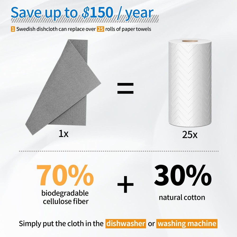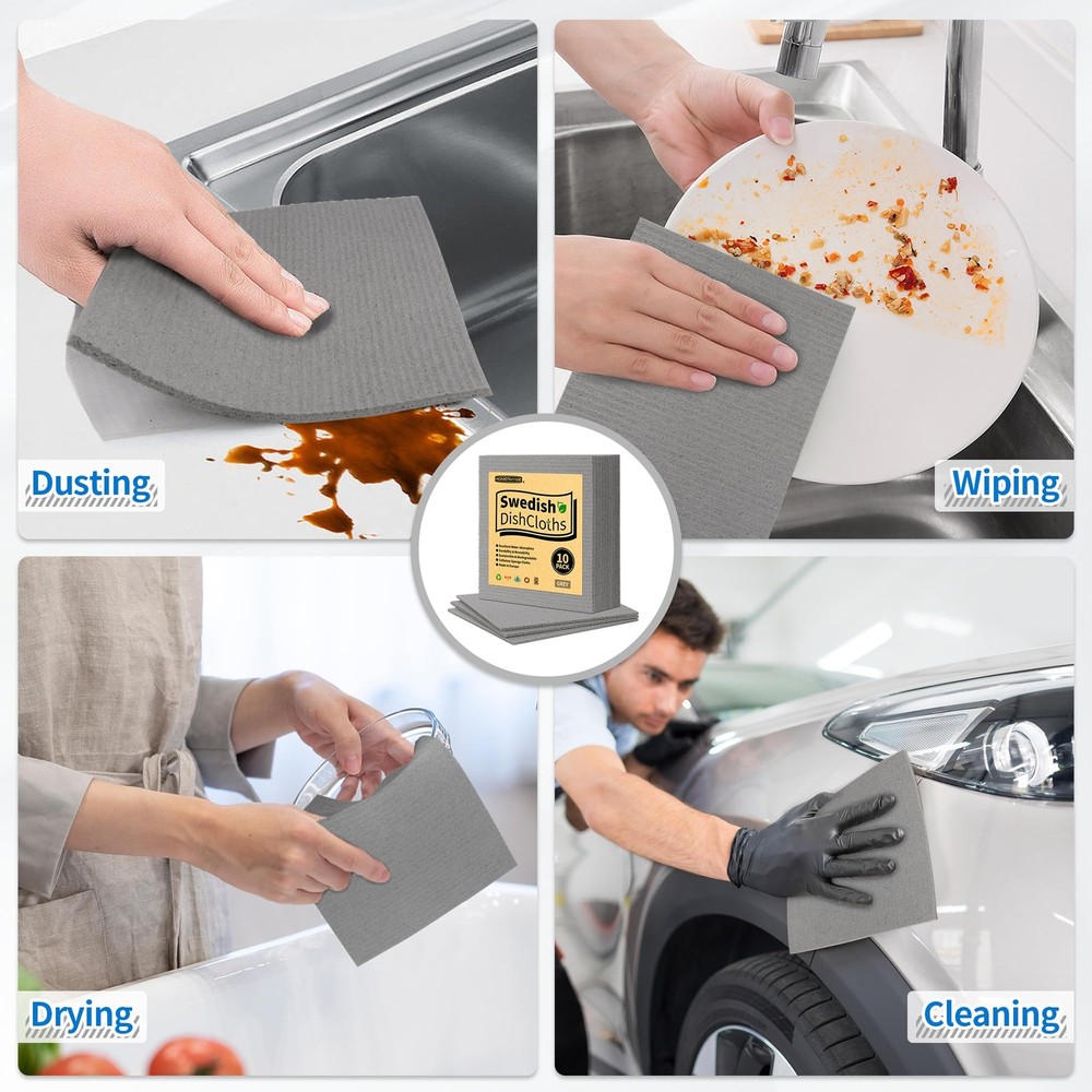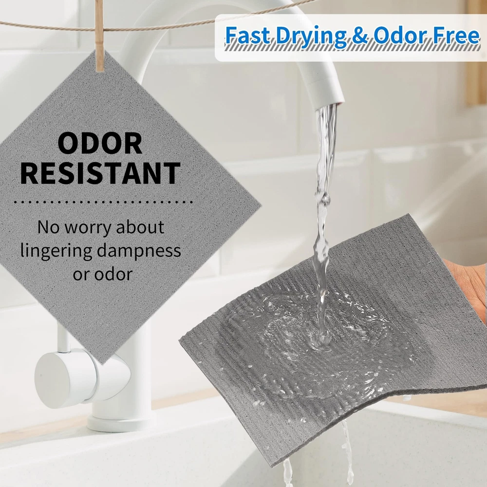 Highly Absorbent: Made from high-quality cellulose sponge cloths, our kitchen towels can effortlessly soak up liquids and effectively remove dirt and grime. They easily outperform both paper towels in the amount of liquid that they can absorb, and after being wrung out they are quickly ready to do the job again. Absorbent enough for drying, cleaning, scrubbing, or achieving any other household task. No Lint & No Scratch: These dish towels will not scratch your kitchenware, plates, pots, and pans. Fit well for removing dusting when wet and leaves no marks after wiping, suitable for most surfaces such as glass, pots, pans, countertops, sinks, car trim, windows, mirrors, stainless steel, marble, tile, and wood surfaces. Ideal for scrubbing or drying dishes, bathtubs, showers, kitchens, cups, bathrooms, offices, furniture cups, and plants. WASHABLE & REUSABLE: Our Swedish dishcloths are designed to withstand repeated use, a reliable choice for everyday kitchen cleaning. One 7"x6” Reusable Swedish Dish Cloth can replace up to 20 paper towels. Just throw it into a washing machine or dishwasher to clean. These dish rags remain fully intact after several weeks of heavy daily use, they will not tear, thin, or shred. Quick Dry & Odor Free: Comprised of cellulose and cotton, the kitchen dish cloths air-dry much more quickly than stinky sponges. Able to absorb 20 times their weight while maintaining lightweight and fluffiness, these hand towels are easy to wash and quick to dry. Natural materials dry faster and prevent the growth of odor even after using for a long time. Wide Application: Compared to other cleaning tools, our kitchen towels and dishcloths are an affordable option. It can be used multiple times before needing to be replaced, making it a cost-effective choice for you. Perfect gifts for housewarming events, birthdays, or holidays. These kitchen towels can be widely applied in your kitchen, living room, bathroom, windows, classrooms, and offices, and can be used to clean desks, tables, cabinets, bottles, and walls.