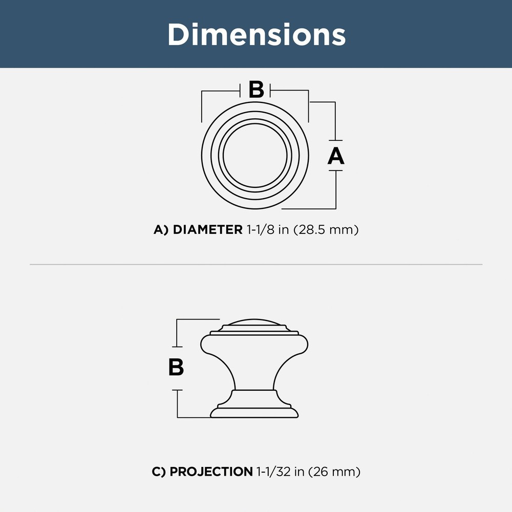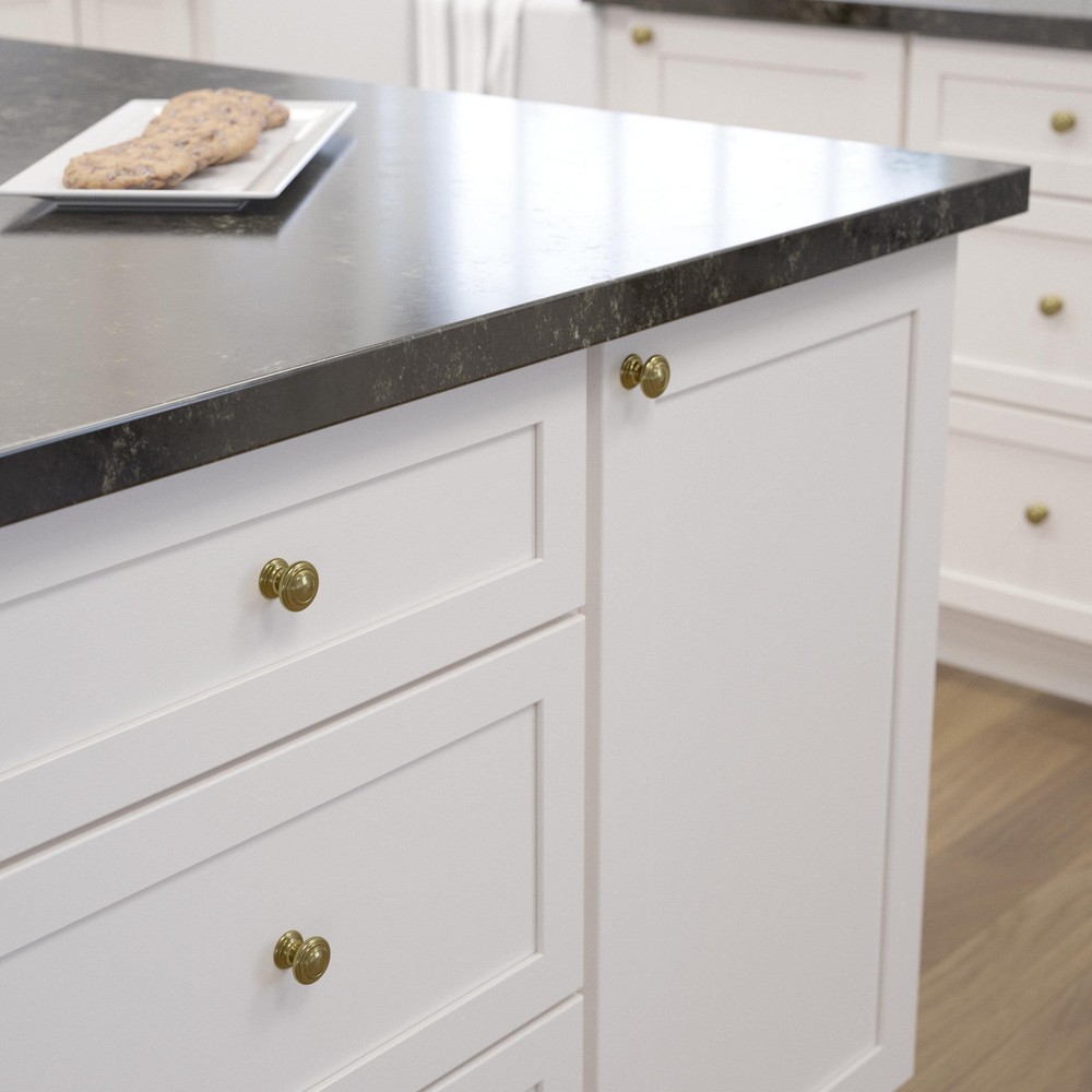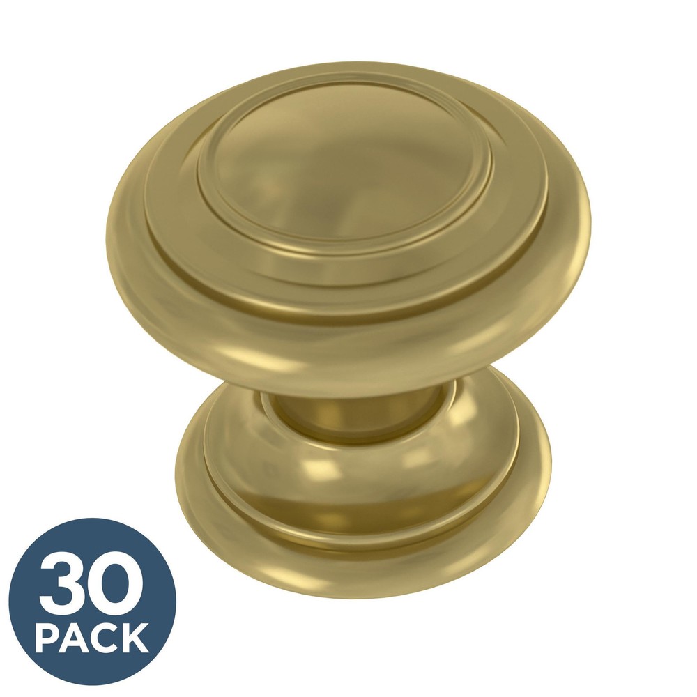 Simple is beautiful. Put the finishing touch on a room or entire home quickly with beautiful furniture knobs that can go from the kitchen to the bedroom effortlessly. This cabinet knob is the sophisticated, modern cabinet hardware piece that will complete your decor. The Simple Double Ring Satin Gold knob features rounded edges with 1-1/8" diameter holding point on your cabinets and drawers. Showcase your personal style with an upgrade in your home’s hardware – you won’t believe how it elevates the whole room. We offer modern trends, priced right for you. Made for you by – with 70 years in cabinet hardware - you can be sure you have a quality product at a practical price. This 10-pack of cabinet knobs is a fantastic value to upgrade your kitchen cabinets or other furniture hardware. STYLE: Classic yet informal cabinet knob for a look that is both refined and comfortable FINISH: Satin gold is a bright, saturated gold tone with smooth matte touch DURABLE: Crafted from durable metal for years of enjoyment EASY UPDATE: Refresh the look of your home in a weekend with cabinet knobs and pulls that reflect your style MEASUREMENTS: 1-1/8 in. diameter rear-mount installation