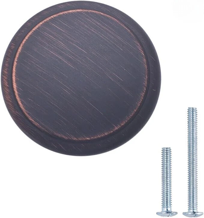 Dimensions : Cabinet knob has a top diameter of 1-1/4 inches and extends 0.84 inches from the cabinet door or drawer front. Oil Rubbed Bronze : Features a dark, aged appearance that elegantly highlights the deep tones of bronze. This classic choice adds historical charm and traditional sophistication to your cabinetry. Solid Construction : Crafted from solid, high-quality zinc alloy, not hollow, designed to resist rust and corrosion. Straightforward I nstallation : This pack includes 10 cabinet knobs, compatible with most cabinets. For pre-drilled cabinets, use the included mounting hardware for easy installation. Pack includes 1-inch & 1.5-inch mounting screws; you may need to purchase screws of additional length depending on your cabinet’s width; machine screw metric size: M8-32.