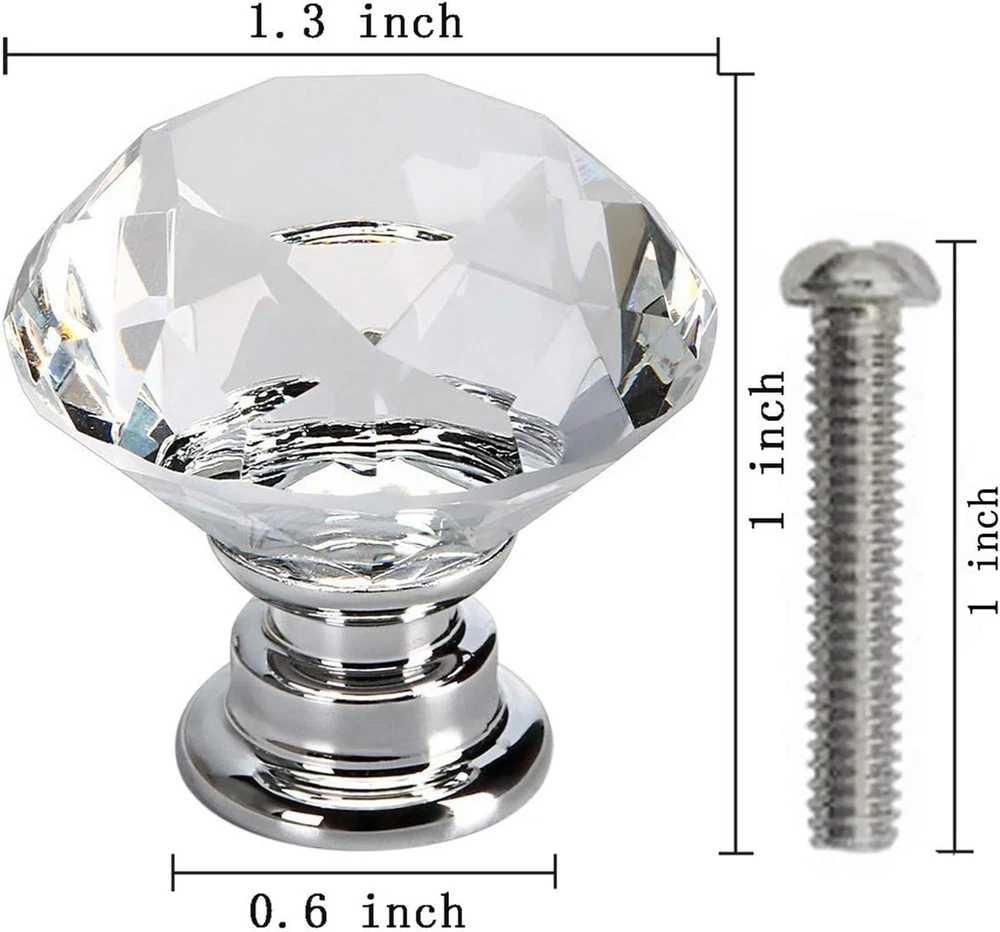 --MATERIAL: Clear cut crystal glass and alloy base, shiny polished chrome, glittering and sparking, diamond shape, good decoration for your home or office. --APPLICATION: Fit for cabinet dresser drawers cupboard wardrobe bookcase etc,give your furniture a sparkly new looking. --INSTALLION:Easy to install. Find the position where you want to install on the board and drill a hole , then pass through the screw from the back of board anf thread tight to the knob. Be careful during the work. --ATTENTION:Please use this knobs with the objects that thickness is not over 1 inch. --SIZE: Screw Thread Length:0.8 inch Height:1 inch Diameter: top 1.3 inches bottom:0.6 inch -The crystal knob is very pretty artistic and durable,ideal for installed cabinet,wardrobe,dresser,drawers,bathrooms,cupboard, bin,wardrobe,newborns room ,armoire,nightstand,large jewelry stand box/drawer hutch redo etc. -You will be surprised after you install it.They looks pretty,sparkly, gorgeous,stunning ,cute adorable feminine touch to any room,Children and ladies at home will be happy it,when the sun shines in the room, they throw prisms of light everywhere. -The knob has high crafts,sturdy and touches very comfortable.It is easy to install with home little tool. FEATURES: -Material: High-quality Crystal glass and aluminum -Size: Screw Thread Length:0.8 inch Height:1.0 inch Diameter: top 1.3 inches bottom:0.6 inch -Color:White Crystal Package include: 4 X Crystal glass handle 4 X Screw