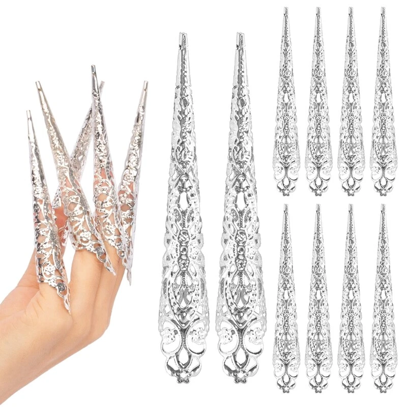 Features: and high Exquisite queen appearance, this set of finger tip claw rings are specially designed like queen in ancient times, long for sharp end with golden color finish, very imposing and attractive among people. Premium material, these fingertip claw rings are high material, skin-friendly non-faded , rustproof and durable for long for time use. please leave it away from water when wearing or putting aside. Wonderful decor this finger rings has a stylish and appearance, and it is usually popular among actresses or people who are interested in ancient costume drama role for play.will make you more attractive. It may also be a beautiful accessory in your collection, or a beautiful family or Suitable for multiple performances,queen's dress ,cosplay finger claws are for thousand-hand Bodhisattva Guan Yin and belly dance, sexy dancer dress up, wedding, for queen costumes, halloween costumes for women, christmas Won'for t fall down ,adjustable micor-open , you can adjust it into suitable size according to your fingers,it wont scartch your fingers,lightweight. Specifications: Metal Plating Size:12cm×1.8cm/4.72×0.7inches Color Gold Package Includes: 10 Pieces Fingernail Claws note: Please allow 1-2cm errors due to manual measurement. Due to the difference betweeen different monitors,the pic may not reflect the actual color of the item.