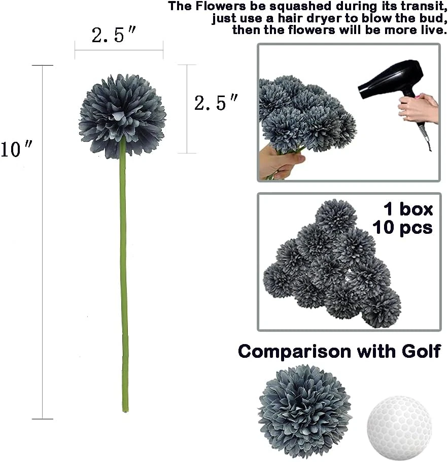 gtin13: 313048247246 Number of Items: 10 Item Weight: 3.52 ounces Plant or Animal Product Type: Item Package Quantity: 1 Recommended Uses For Product: 室内使用 Package Information: Vase Material: 面料 Specific Uses For Product: Home Decor Included Components: 插花配件 Unit Count: 10 Count Color: Grey Type: Does not apply Brand: Does not apply Product Dimensions: 2.5"D x 2.5"W x 10"H UPC: 313048247246 Item model number: Chrysanthemum Ball Country of Origin: China Product: Does not apply Shape: Round Occasion: 结婚和订婚 Indoor/Outdoor Usage: Indoor
