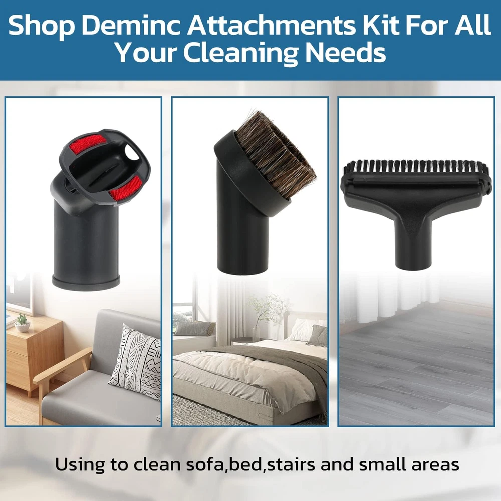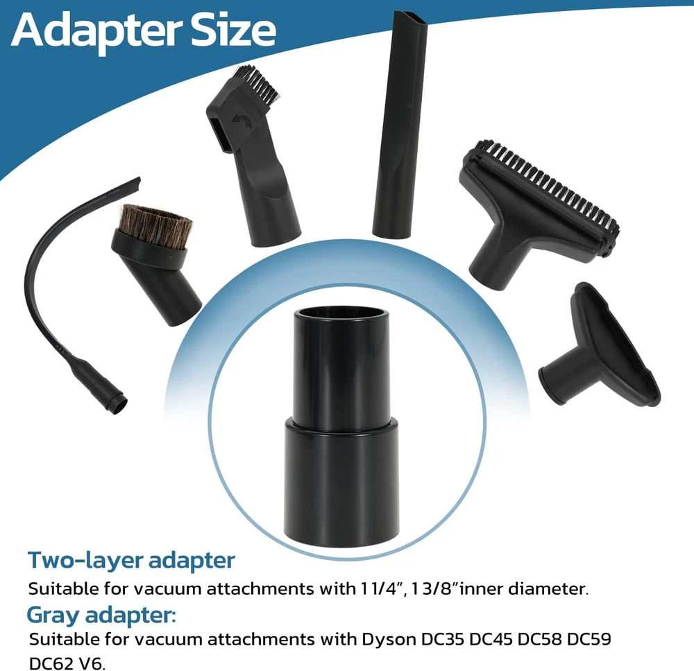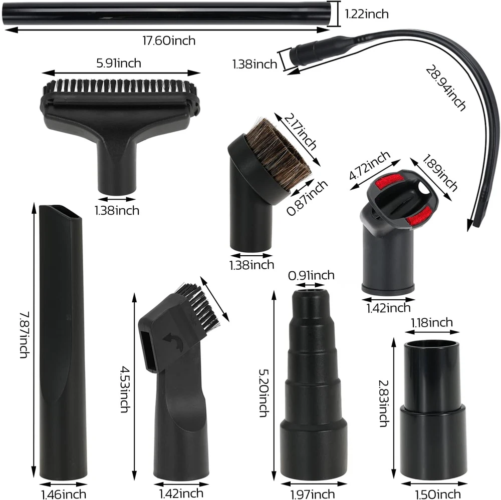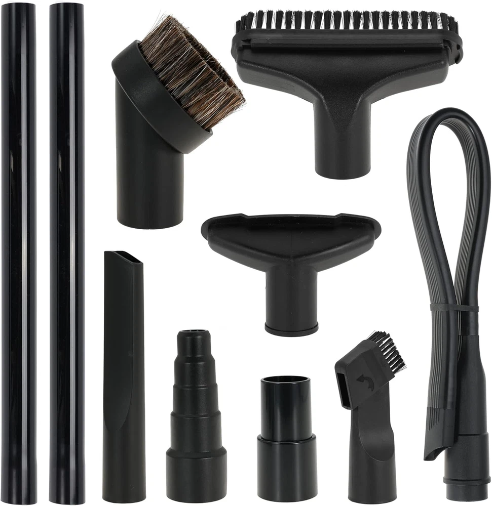 Compatible Models: Fits Most Standard Vacuum Cleaners With 1" to 5" Attachments Complete Set: The set contains:- 2 1/2" to 1 1/4" vacuum hose adapters to fit most vacuum cleaner wands - 1 7/8" to 1 3/8" to 1 1/4" to 1" vacuum adapters to fit various vacuum cleaner attachments - 1 1/4" horsehair vacuum brush to gently sweep away dust and debris- 1 1/4" flexible crevice tool to reach tight spaces - 1 1/4" utility nozzle with removable plastic brush to clean hard to reach areas- 1 1/4" brush and nozzle combination tool for versatile Construction:cleaningThe 5 layer vacuum adapter has outer diameters of 27mm, 32mm, 35mm, 40mm, and 50mm to fit shop vac attachments with 1", 1 1/4", 1 3/8", 1 1/2", and 1 7/8" inner diameters. The adapters can be easily cut to fit your vacuum cleaner model. These vacuum cleaner attachments are made of natural horsehair and ABS plastic Easy Installation: They are easy to install and detach without tools. The brush attachment cleans desktops, keyboards, sofas, carpets, floors, vents, blinds, cars, and pet hair. The other attachments reach tight spaces and provide all-around cleaning for your home, office, or car. Replace your vacuum cleaner attachments every 1-3 months for peak performance. Maintain your vacuum cleaner for optimal cleaning results Household Cleaning Essentials: Universal vacuum attachments kit are enough for multi-purpose cleaning at home, office and car interior ,such as : Keyboard, any gaps, shutter, sofa, vent, drawer, car, plants, remove pet hair and corners This 10 piece vacuum cleaner attachment set is compatible with most standard vacuum cleaners. It includes 5 different attachments to help you clean every nook and cranny. The set contains:- 2 1/2" to 1 1/4" vacuum hose adapters to fit most vacuum cleaner wands - 1 7/8" to 1 3/8" to 1 1/4" to 1" vacuum adapters to fit various vacuum cleaner attachments - 1 1/4" horsehair vacuum brush to gently sweep away dust and debris- 1 1/4" flexible crevice tool to reach tight spaces - 1 1/4" utility nozzle with removable plastic brush to clean hard to reach areas- 1 1/4" brush and nozzle combination tool for versatile cleaningThe 5 layer vacuum adapter has outer diameters of 27mm, 32mm, 35mm, 40mm, and 50mm to fit shop vac attachments with 1", 1 1/4", 1 3/8", 1 1/2", and 1 7/8" inner diameters. The adapters can be easily cut to fit your vacuum cleaner model.These vacuum cleaner attachments are made of natural horsehair and ABS plastic. They are easy to install and detach without tools. The brush attachment cleans desktops, keyboards, sofas, carpets, floors, vents, blinds, cars, and pet hair. The other attachments reach tight spaces and provide all-around cleaning for your home, office, or car.Replace your vacuum cleaner attachments every 1-3 months for peak performance. Maintain your vacuum cleaner for optimal cleaning results