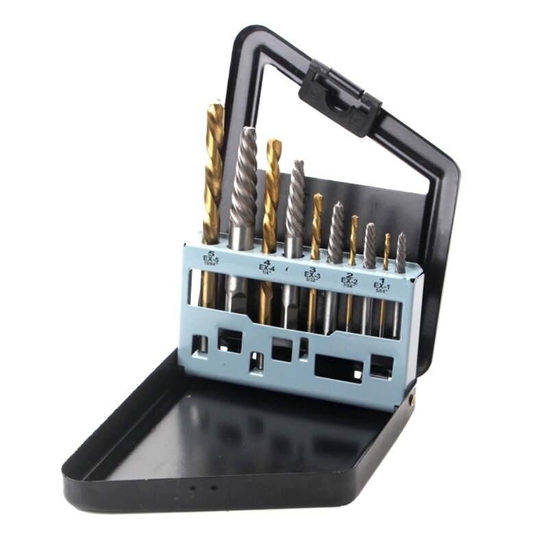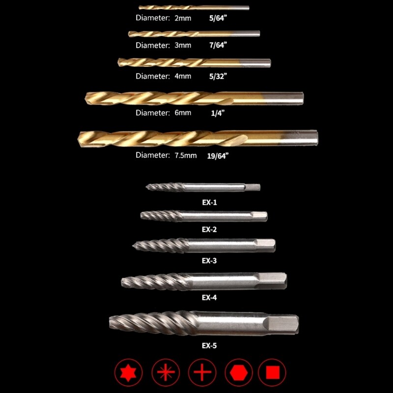 Features: Brand new and high quality Product design upgrade: The new design is more convenient to install and disassemble, and can be used directly with the drill. And added an adapter to extend the drill interfaces. Design For: The screw remover kit is designed to remove stripped screws and bolts. It easily removes damaged bolts, nuts, and screws even if they are stripped, rusted. High Quality: The new high-speed steel material will be harders, and easier to drill, greatly increasing using life and durability. Portable Size: all the screw in a portable storage Box,small and easy to carry. Screw Extractor Set Includes: A portable storage Box it includes Screw Extractor Size 1#, 2#, 3#, 4#, 5#. Left-hand drill sizes include 1/8", 5/32", 3/16", 1/4", 19/64". Specifications: Material: Titanium plated alloy Package Includes: 10Pcs Damaged Screw Extractor note: Please allow 0-1cm error due to manual measurement. pls make sure you do not mind before you bid. Due to the difference between different monitors, the picture may not reflect the actual color of the item. Thank you.